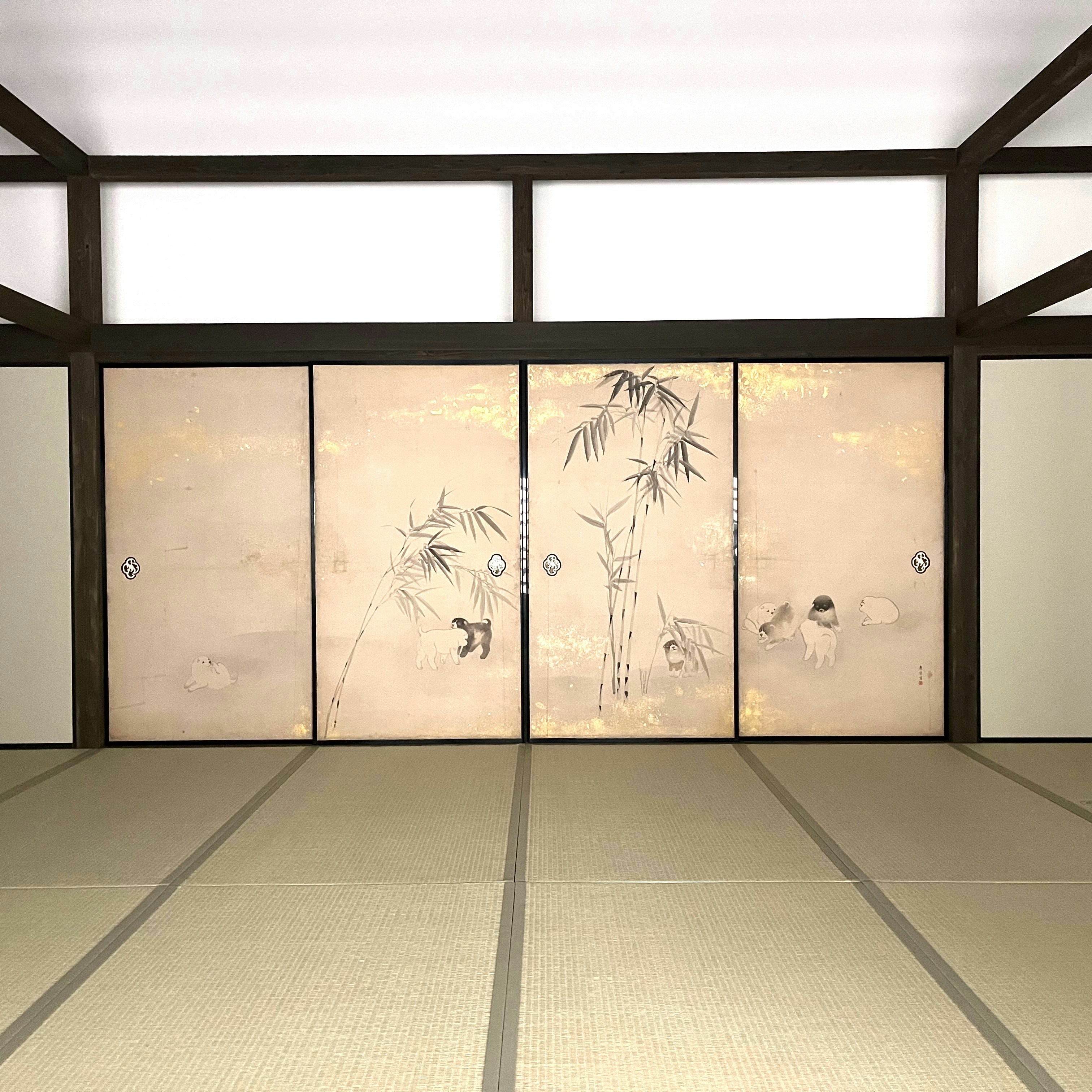 円山応挙《竹に狗子波に鴨図襖》(18世紀)は、建物の一部である襖絵として、会場内につくられた畳の小上がりで展示されている。竹の下で遊ぶ子犬と、波間に降り立つ鴨をやわらかな筆致で描いた本作が、部屋をいかなる空間に仕立て上げていたのか、その一端を体験することができる。