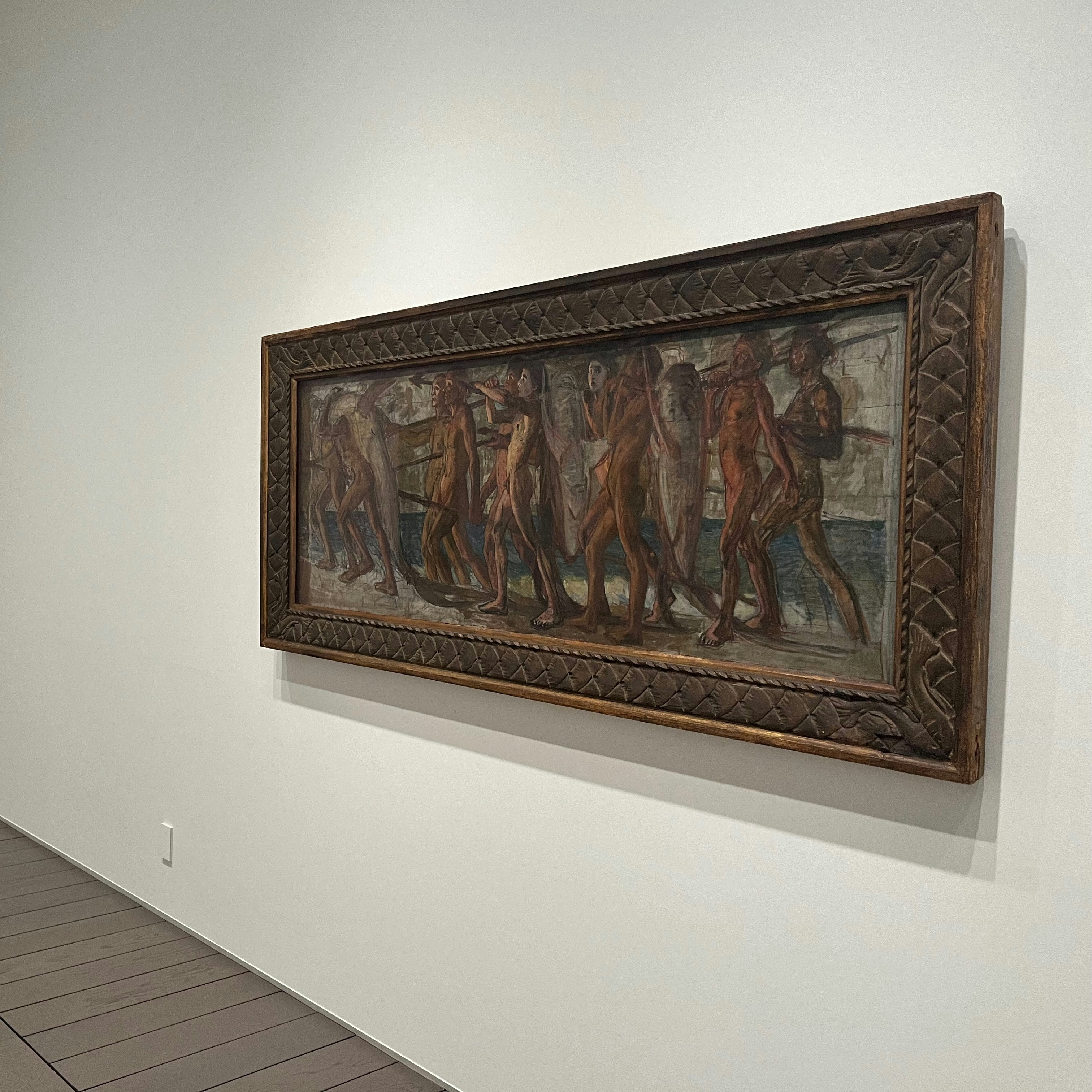 石橋財団コレクションを象徴する作品のひとつであり、多くの人が知る作品である青木繁《海の幸》(1904)も、その額を改めてみると魚や波をあしらったユニークなものであることに気がつく。