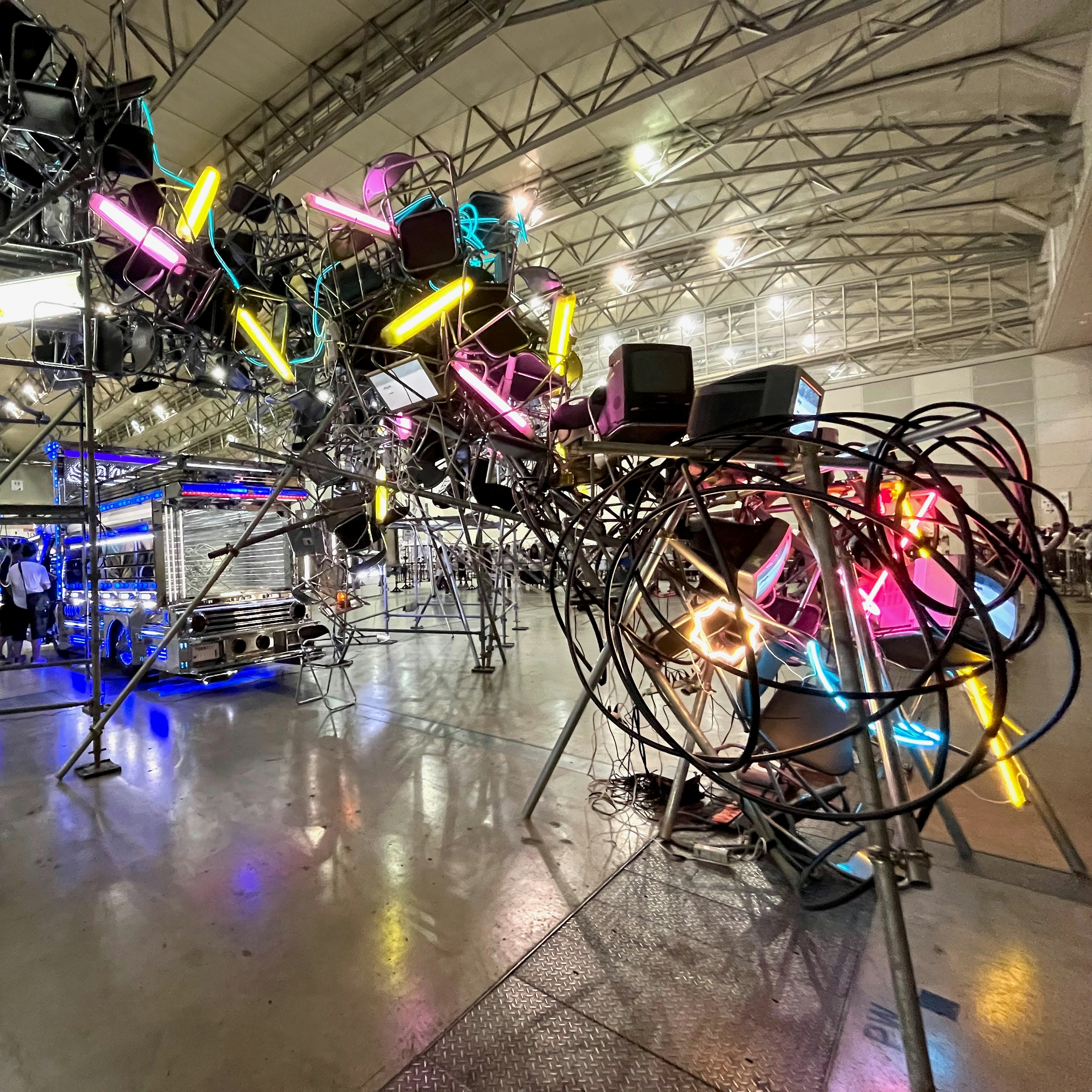 シルバーのパーツで装飾され、青白い光を放つデコトラの後方には大量のパイプイスを使用した構造物が展開。後ろに回ればモニターの映像作品や音声などを聴くことができる。