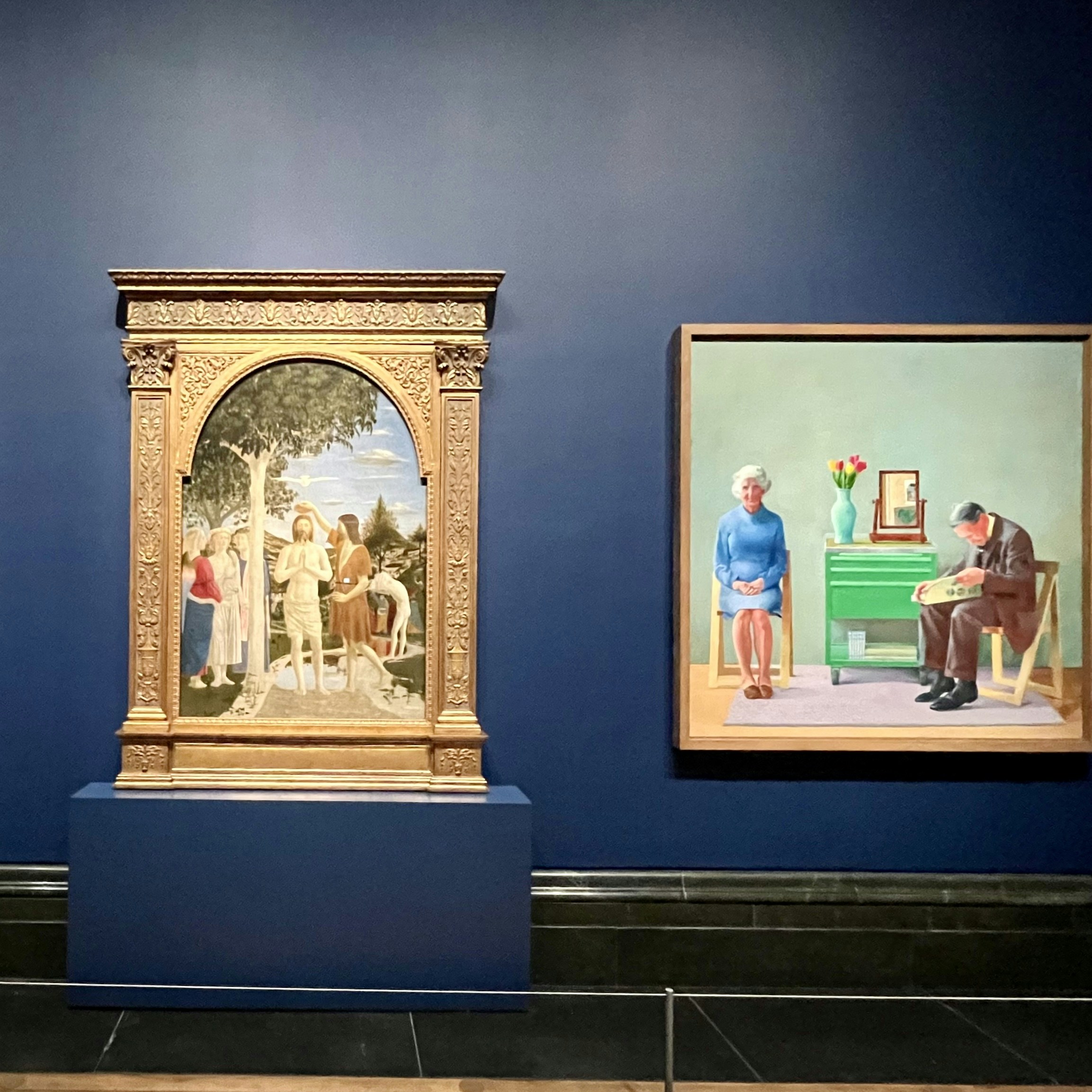 デイヴィッド・ホックニーの代表作である《マイ・ペアレンツ》と《衝立の上の絵を観ている》(原題:Looking at Pictures on a Screen)。その背景に描き込まれているピエロ・デラ・フランシェスカによる15世紀の作品《キリストの洗礼》を並べてみせる興味深いエキシビション「ホックニーとピエロ:ロンガー・ルック」がロンドンのナショナル・ギャラリーで開催中だ。