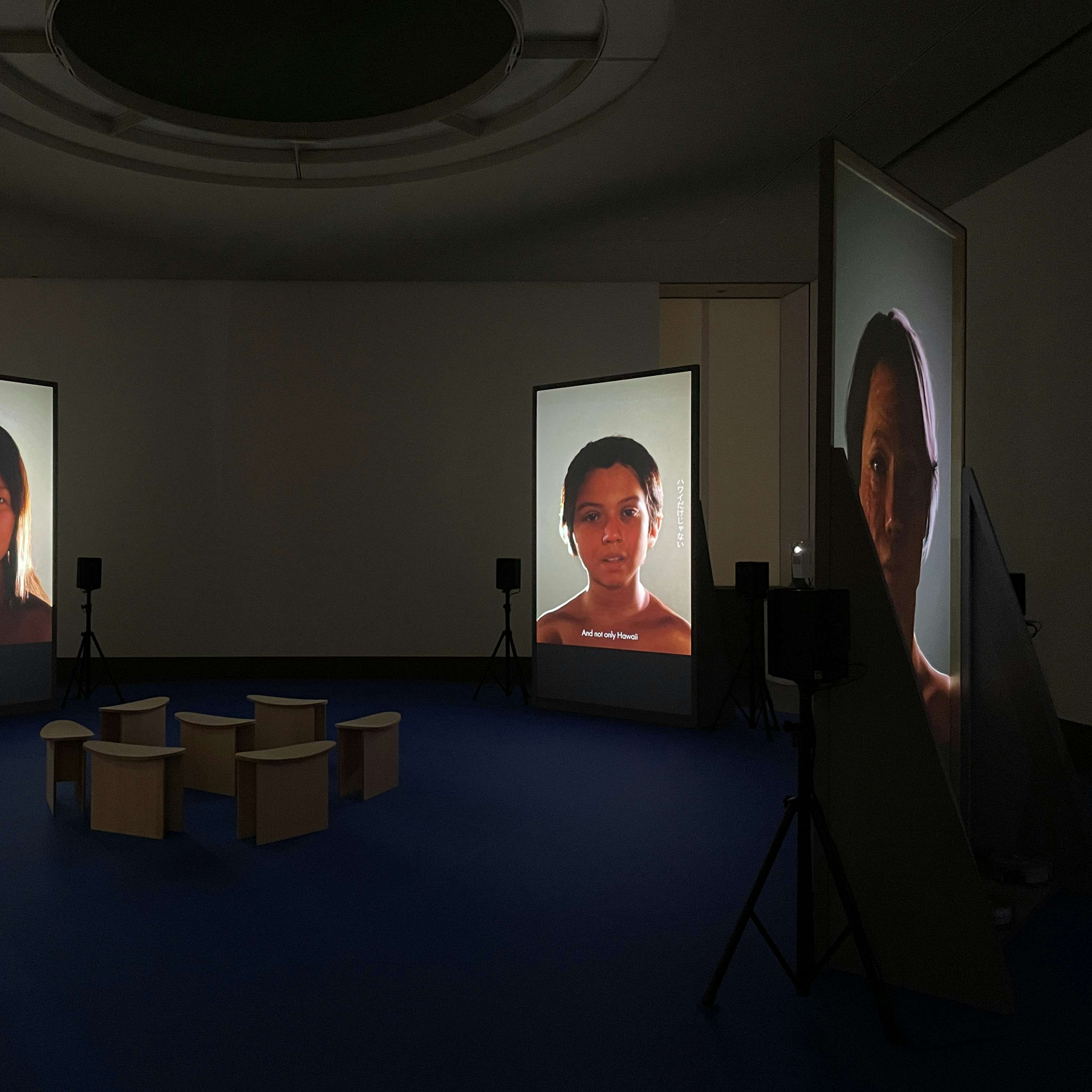 会場は5章構成。入口では、横山奈美の「ネオン」シリーズから《LOVE》(2018)と題された作品が展示されている。横山が手書きで書いた文字をもと、ネオン業者にネオンをつくってもらう。完成したネオンを参照しながら、横山が再び絵画として描くという複雑なプロセスを経てつくられる作品だ。