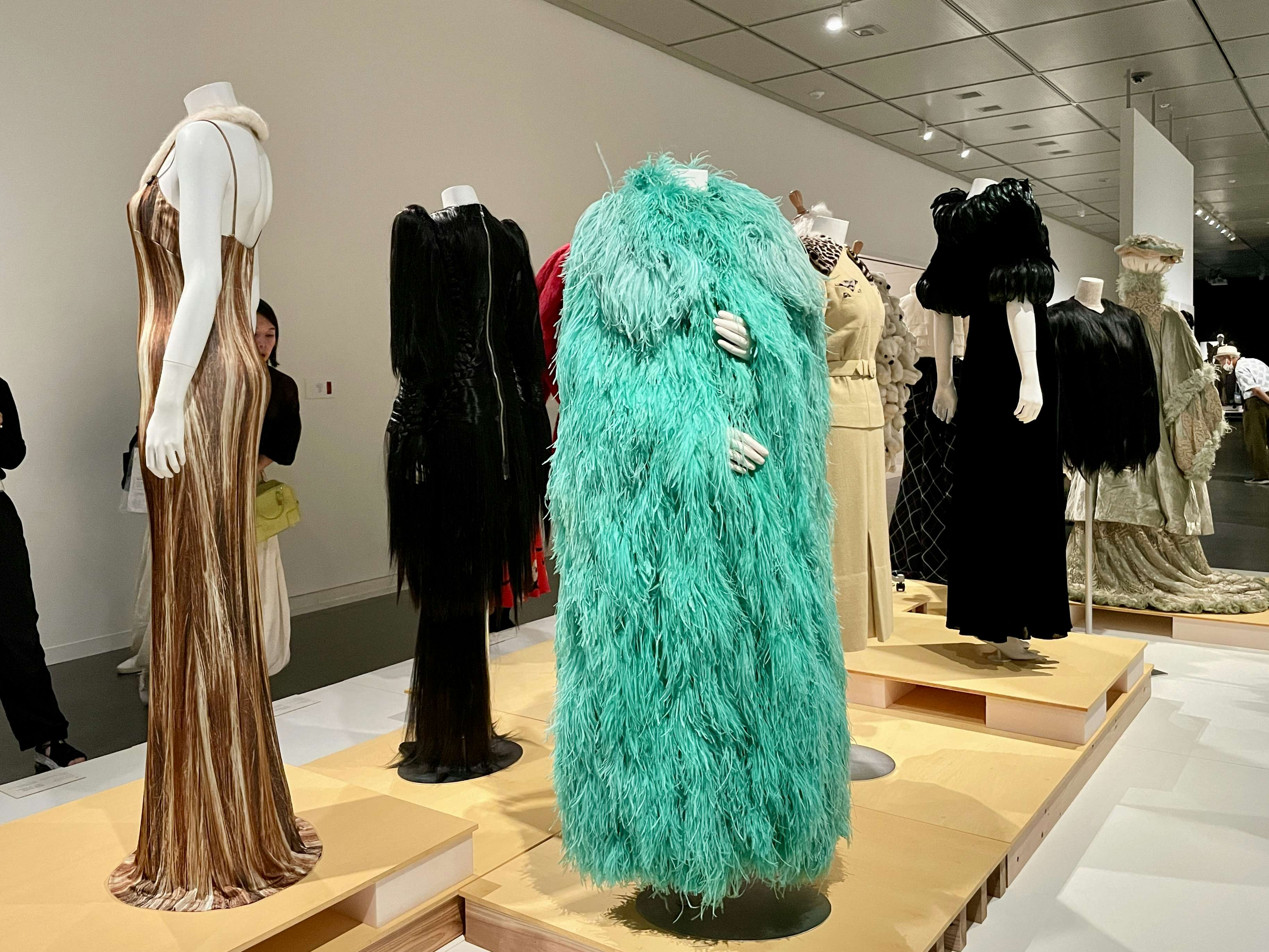 第1章「自然にかえりたい」の展示風景より、本物の鳥の羽や毛皮とエコファーや人工の人毛をそれぞれ使った衣装