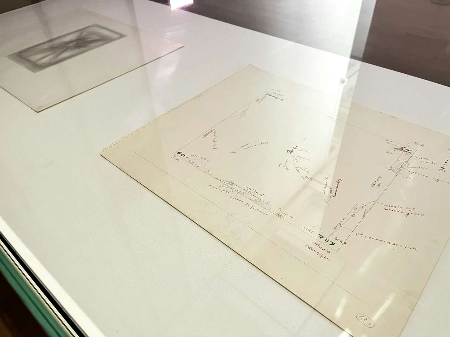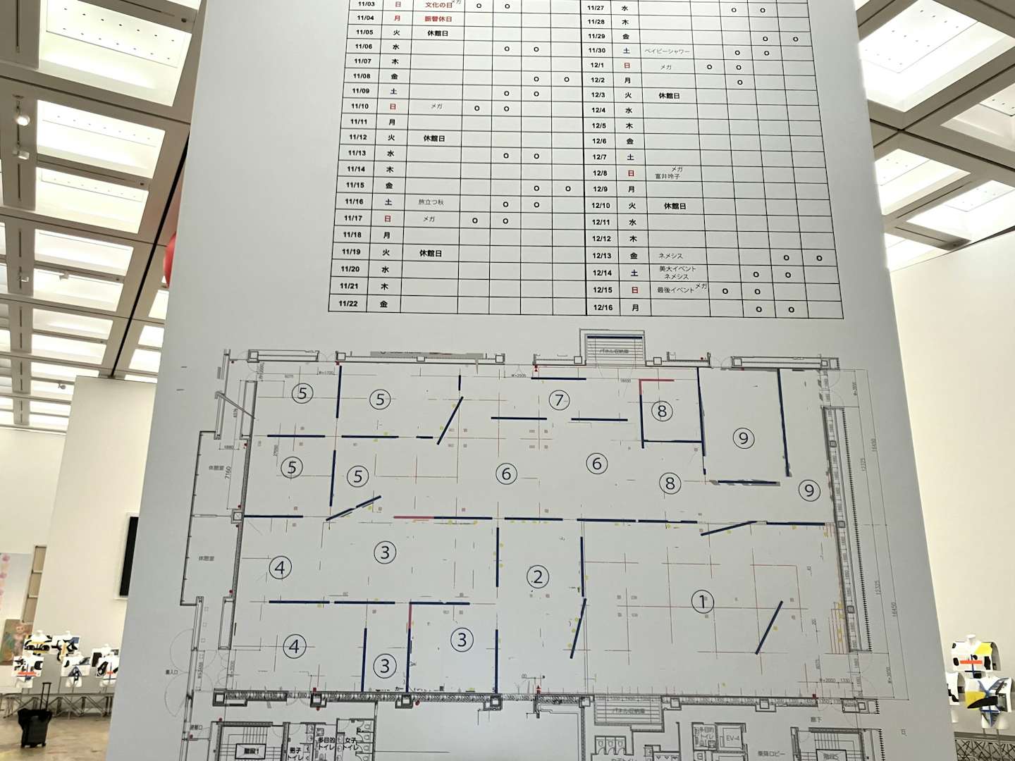 会場の入口を入ると、展示室の床にはたくさんの絵が縦横無尽に描かれている。これは具体美術協会の創始者・吉原治良が芦屋公園で行ったパフォーマンス《どうぞご⾃由にお描きください》(1956)に基づき、荒川ナッシュがテート・モダンで実施した《メガどうぞご⾃由にお描きください》(2021)だ。このパフォーマンスは毎週日曜日に来場者の参加が可能。美術館の床に誰もが自由に絵を描くことができるチャンスとなるため、ぜひ参加してみてほしい。