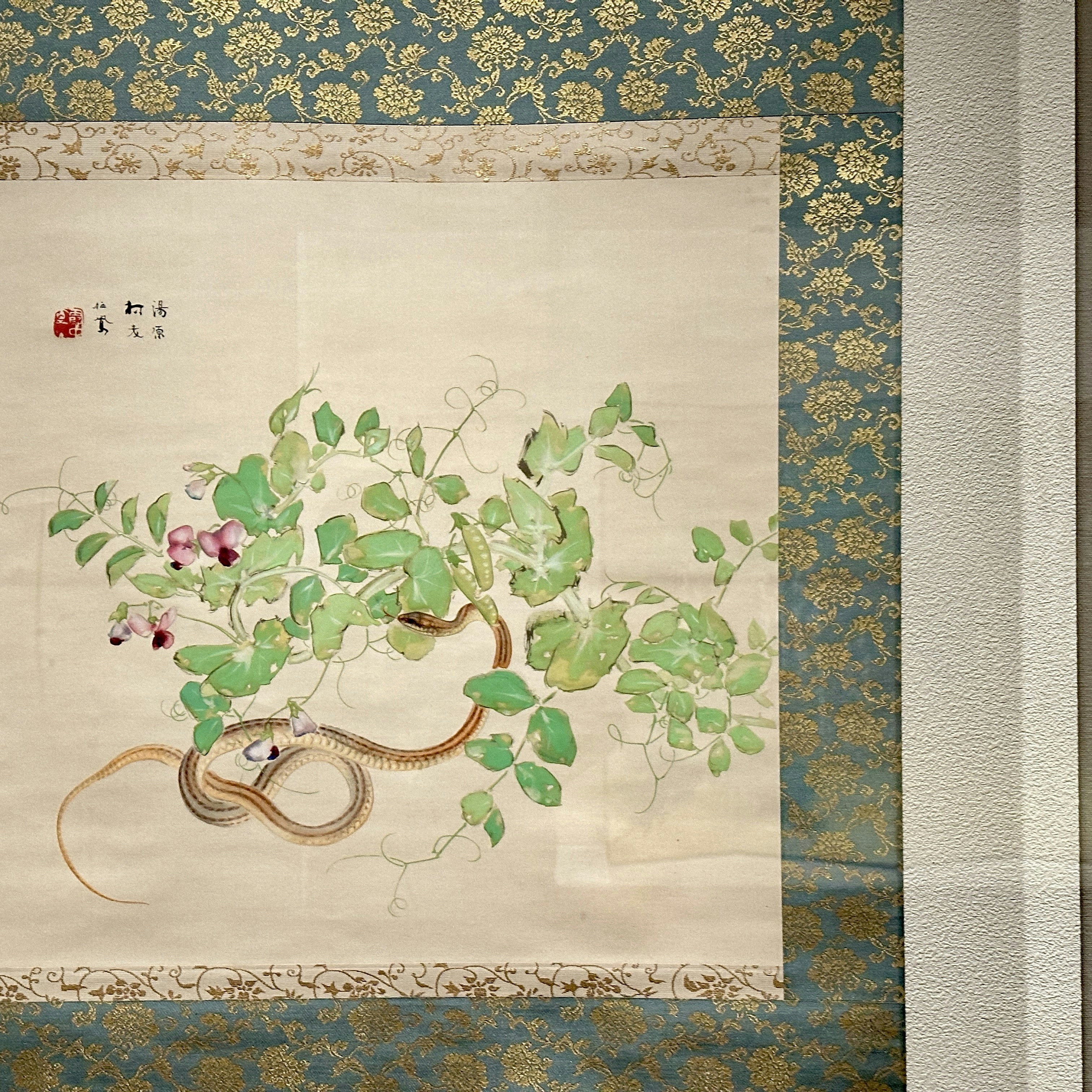 第1章では、吉祥をモチーフとした作品が並ぶ。展示冒頭は、2025年の干支でもある巳年にちなんだ蛇を主題とした作品が並ぶ。蛇は富をもたらす生き物として信仰され、昔話や神話にも頻繁に登場する。なかでも注目は竹内栖鳳《艶陽(えんよう)》(1940、山種美術館)だ。繊細なウロコや舌など、繊細な徹底した観察眼によって描かれた蛇の姿に目を凝らしてほしい。
