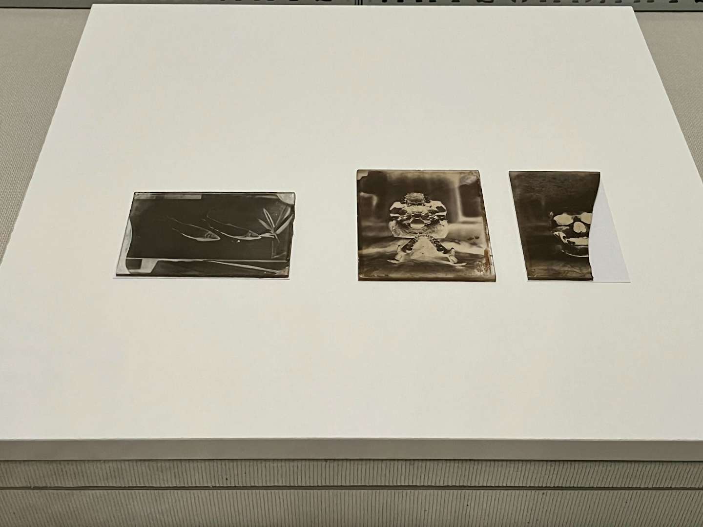 展示風景より、左から島霞谷《鮎》(1860)、《頭蓋骨標本写真》(1869)。日本人が撮影した現存最古の写真は島津斉彬の肖像写真だと言われている。肖像や名所などの風景を写した写真と比較し、当時の日常を写した物撮り写真が現存するのは非常に稀なことである