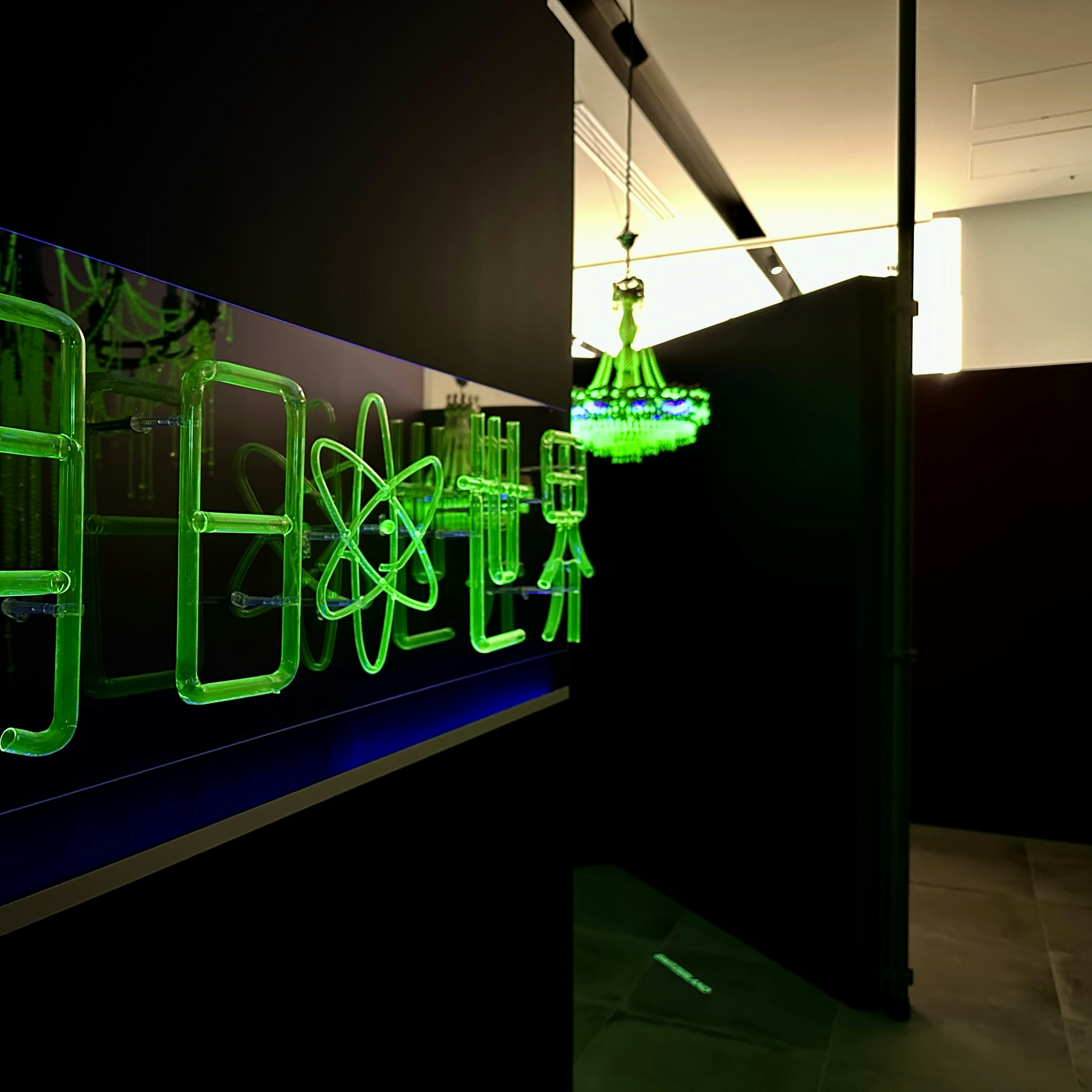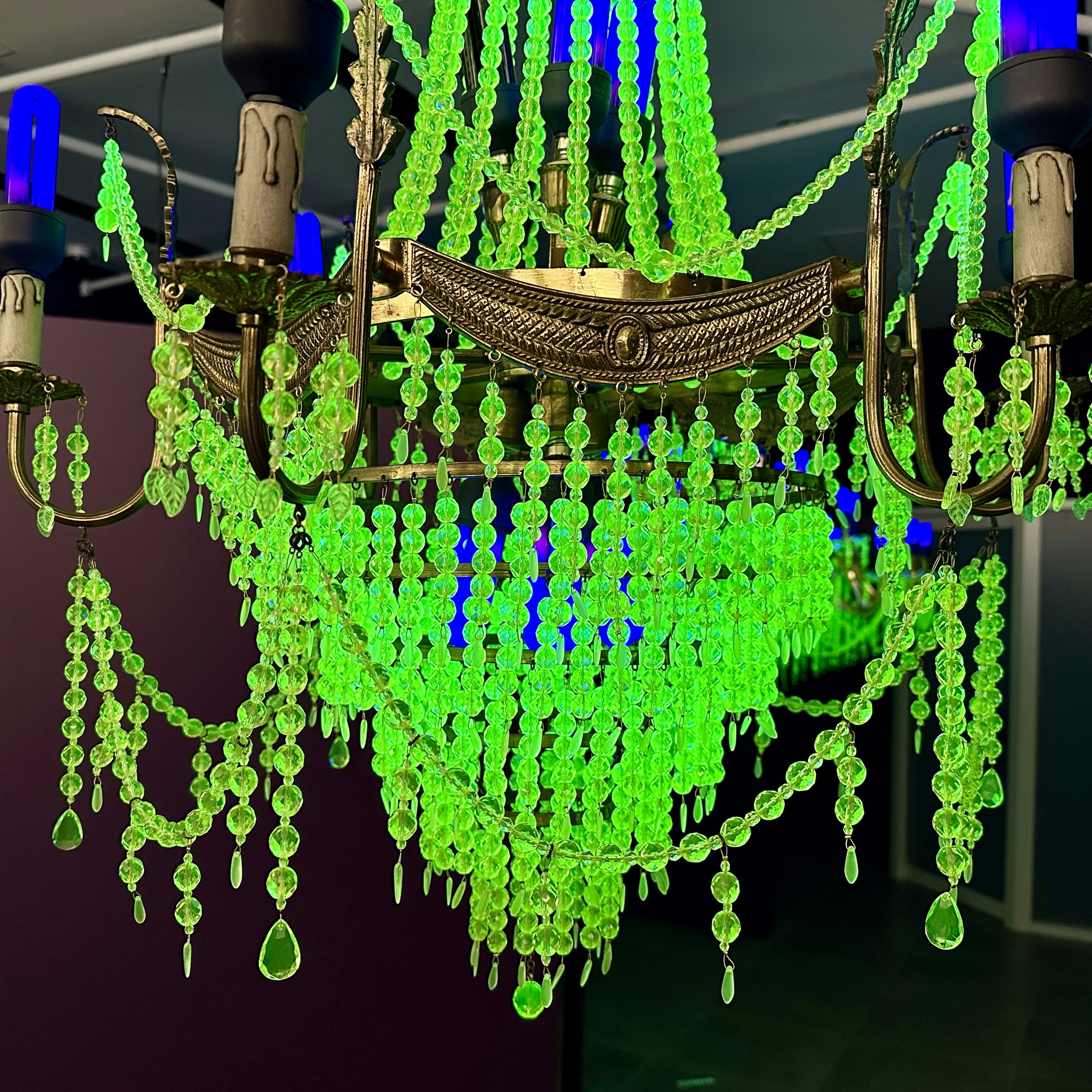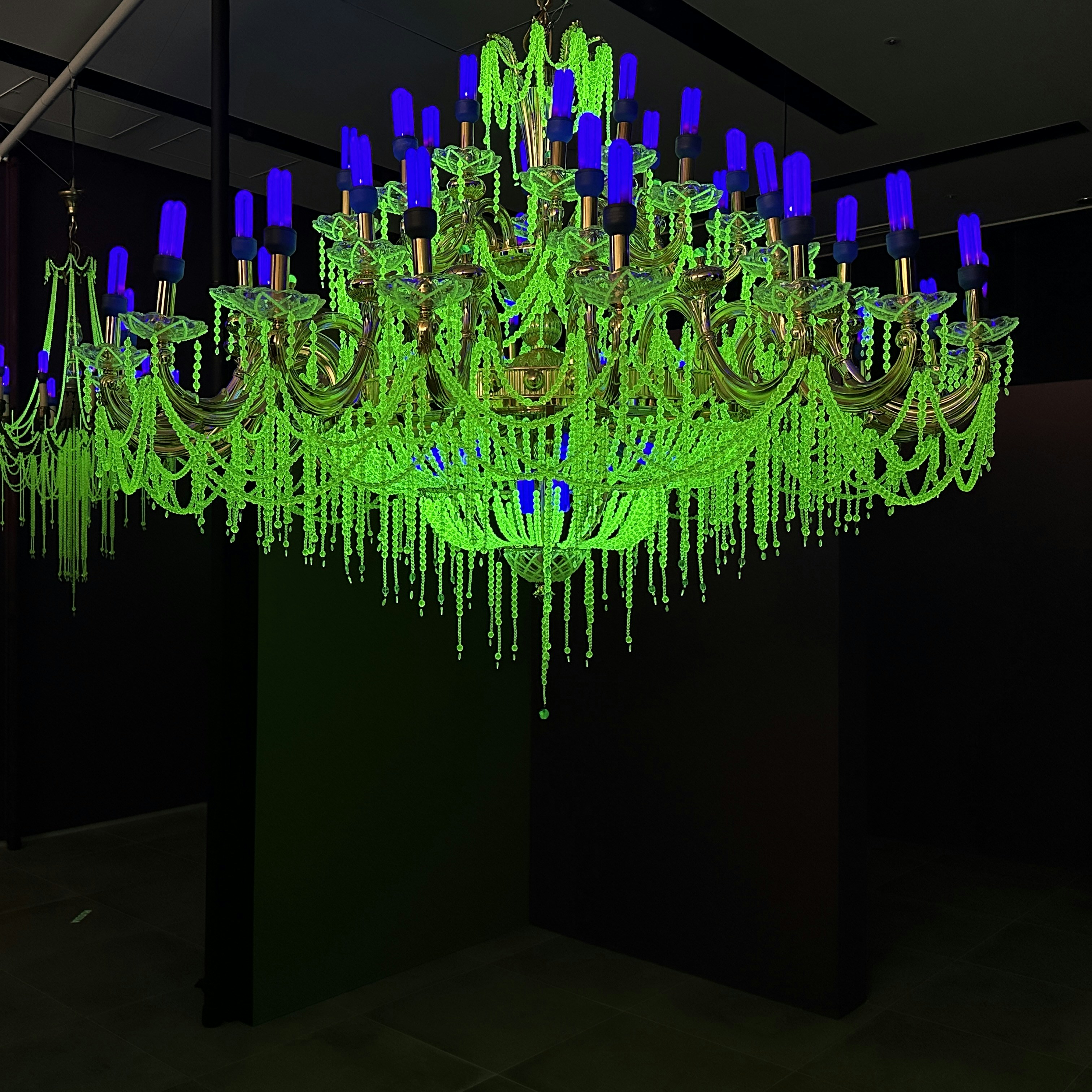 東日本大震災が起きた2011年、ロンドンにおける展覧会の際に1ヶ月ほど現地滞在したふたり。ロンドンの高級ホテルに設置されたまばゆいシャンデリアから着想し、電力と文明をつなげ、放射性物質を可視化するウランガラスを用いた作品を生み出した。