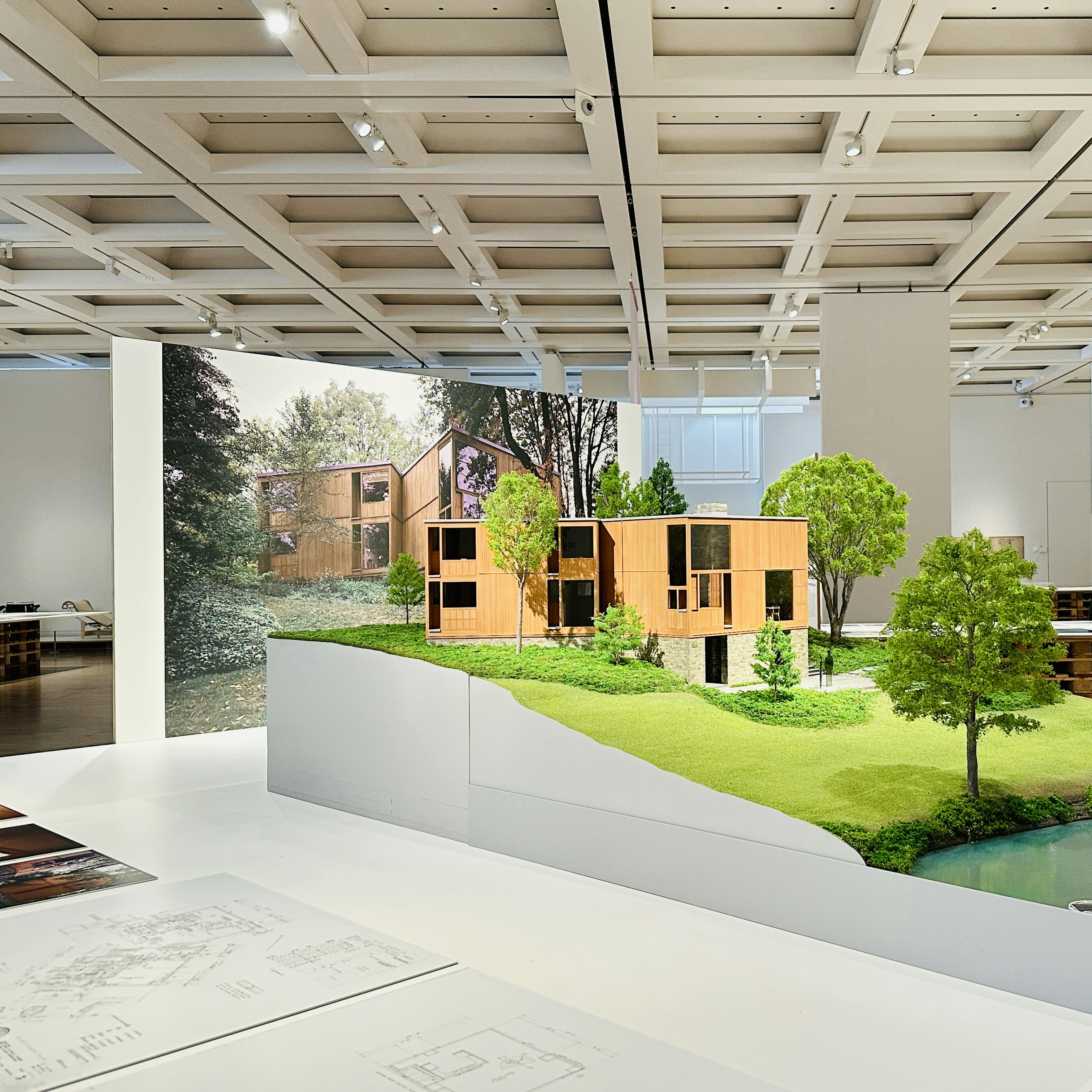 展示で紹介されるのは、大規模建築も数多く手がけた著名な建築家たちによる15邸。その模型を中心に、20世紀の住まいの実験が、写真や図面、スケッチ、家具、テキスタイル、食器、雑誌やグラフィック、映像などを通じて多角的に紹介されている。