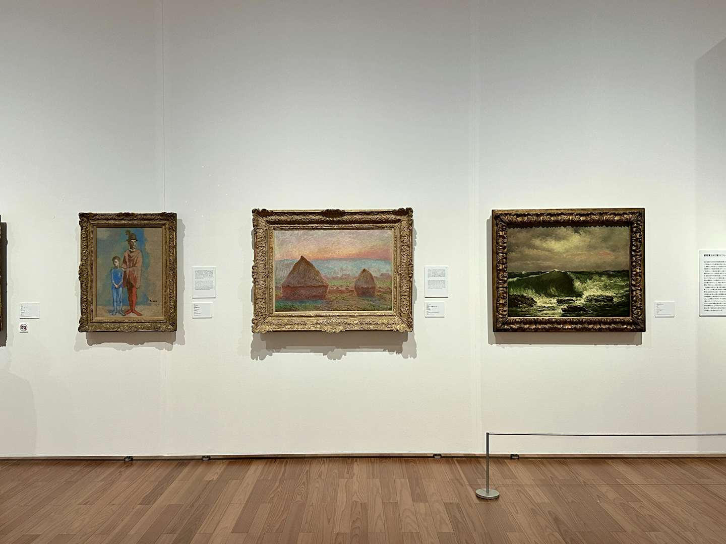 展示風景より、中央がクロード・モネの《ジヴェルニーの積みわら、夕日》(1888-89)