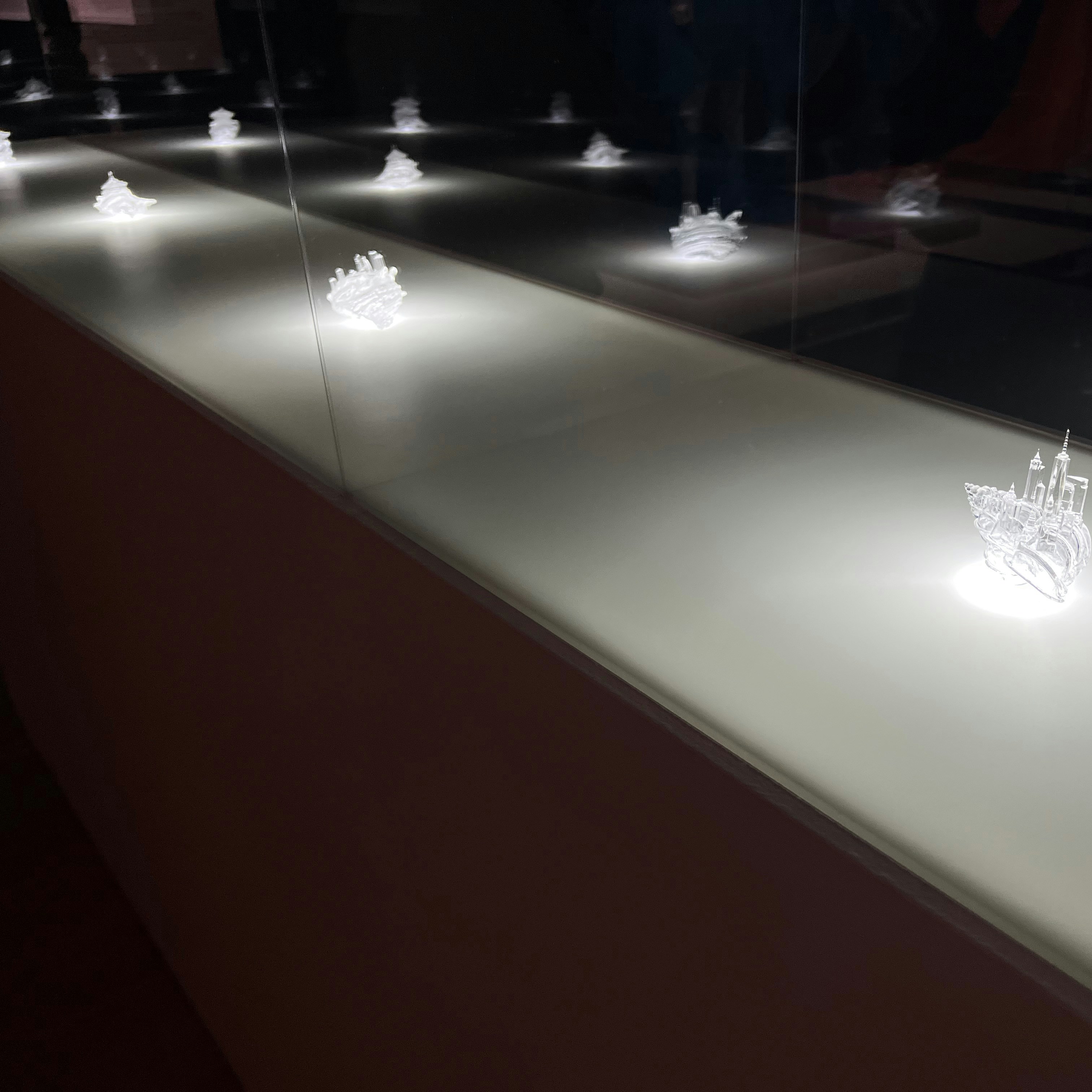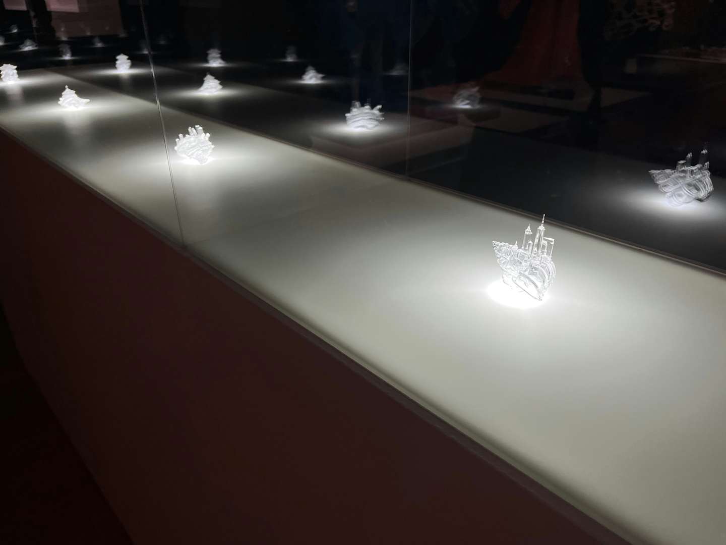 横山による「LOVE」とともに、第1章「自然にかえりたい」が幕を開ける。ここでは、花や植物をモチーフとした柄や、毛皮や鳥の羽をはじめとする動物の素材を活かした衣服を展示。とくに18世紀の貴族たちが身にまとったドレスやスーツの繊細な刺繍やレースは、劇場的な装いをつくり出すための時代の情熱が感じられる。