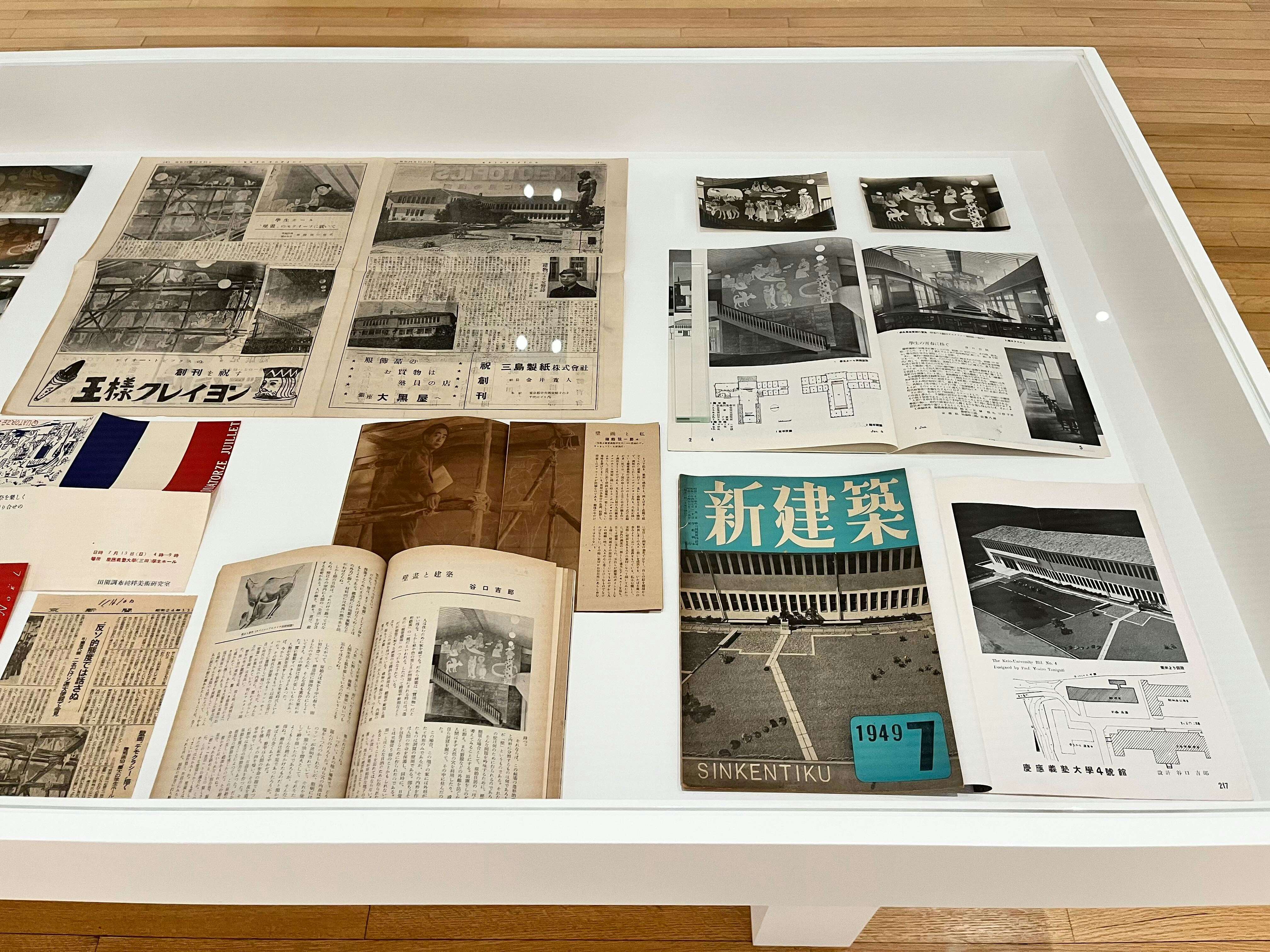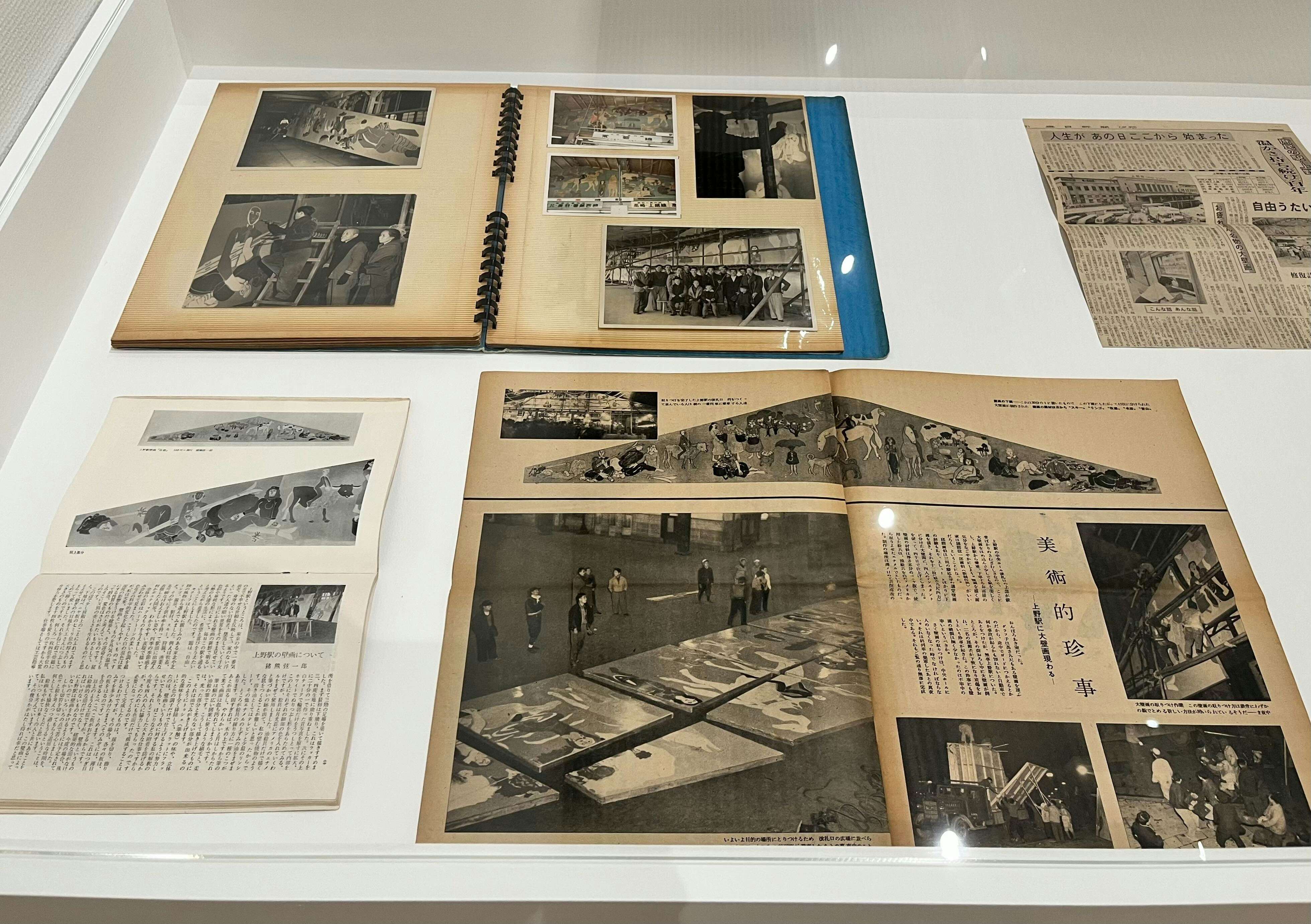 「2章 生活造型:デザイン、パブリックアート」展示風景より、「JR上野駅中央改札壁画」資料