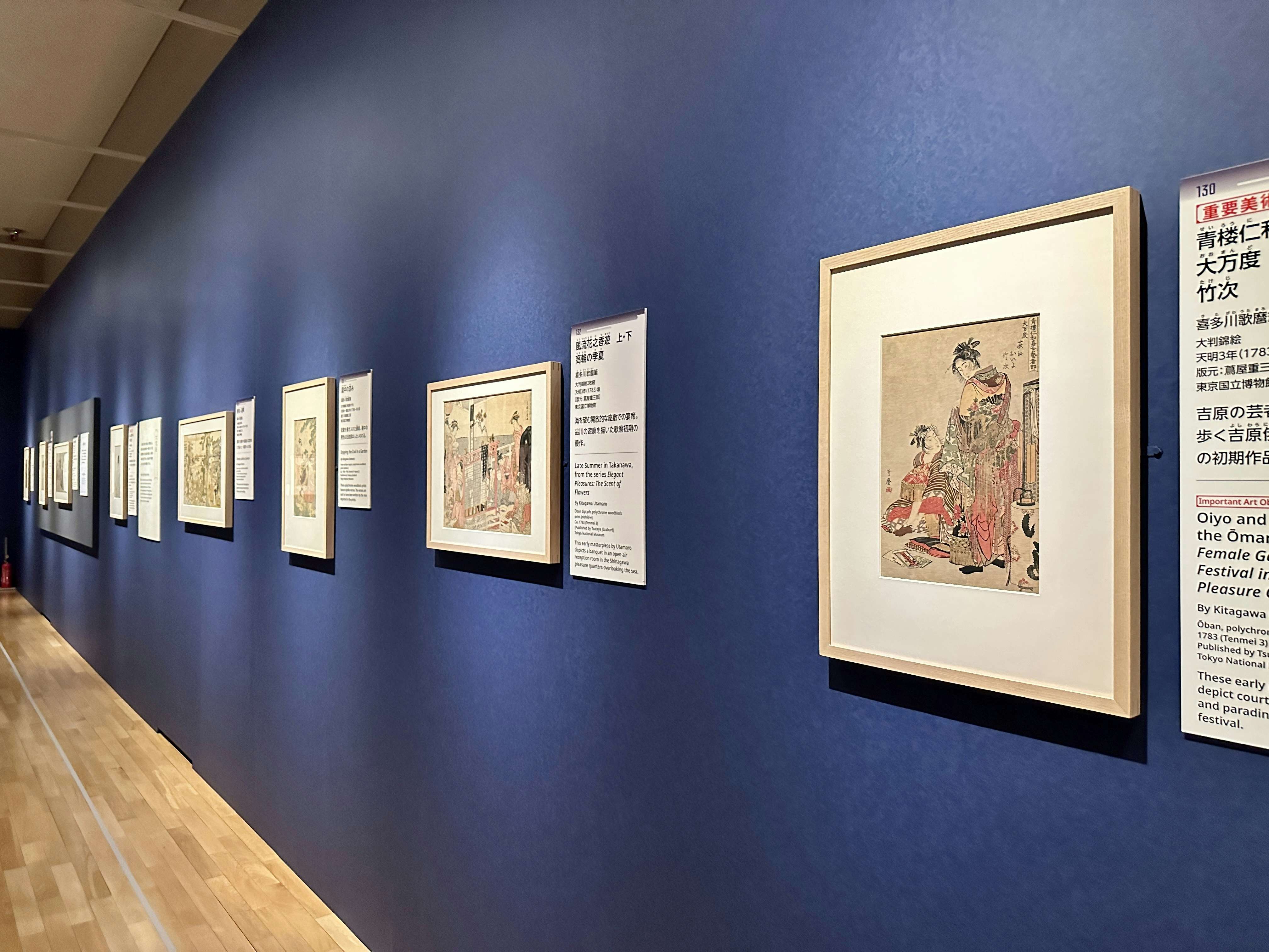 第3章展示風景より、手前は喜多川歌麿《青樓仁和嘉女藝者部 大万度 荻江 おいよ 竹次》(1783)