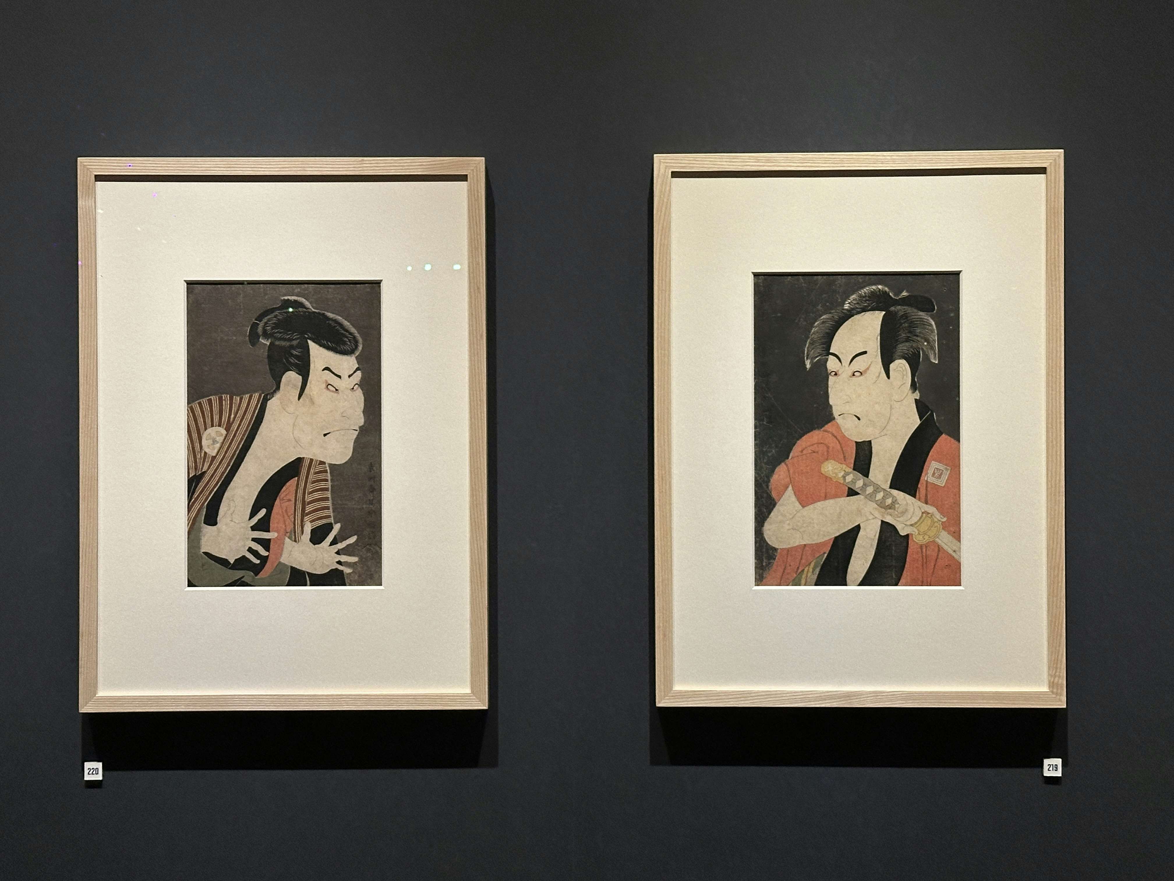 展示風景より、左から東洲斎写楽《三代目大谷鬼次の江戸兵衛》、《初代市川男女蔵の奴一平》(ともに重要文化財、1794)