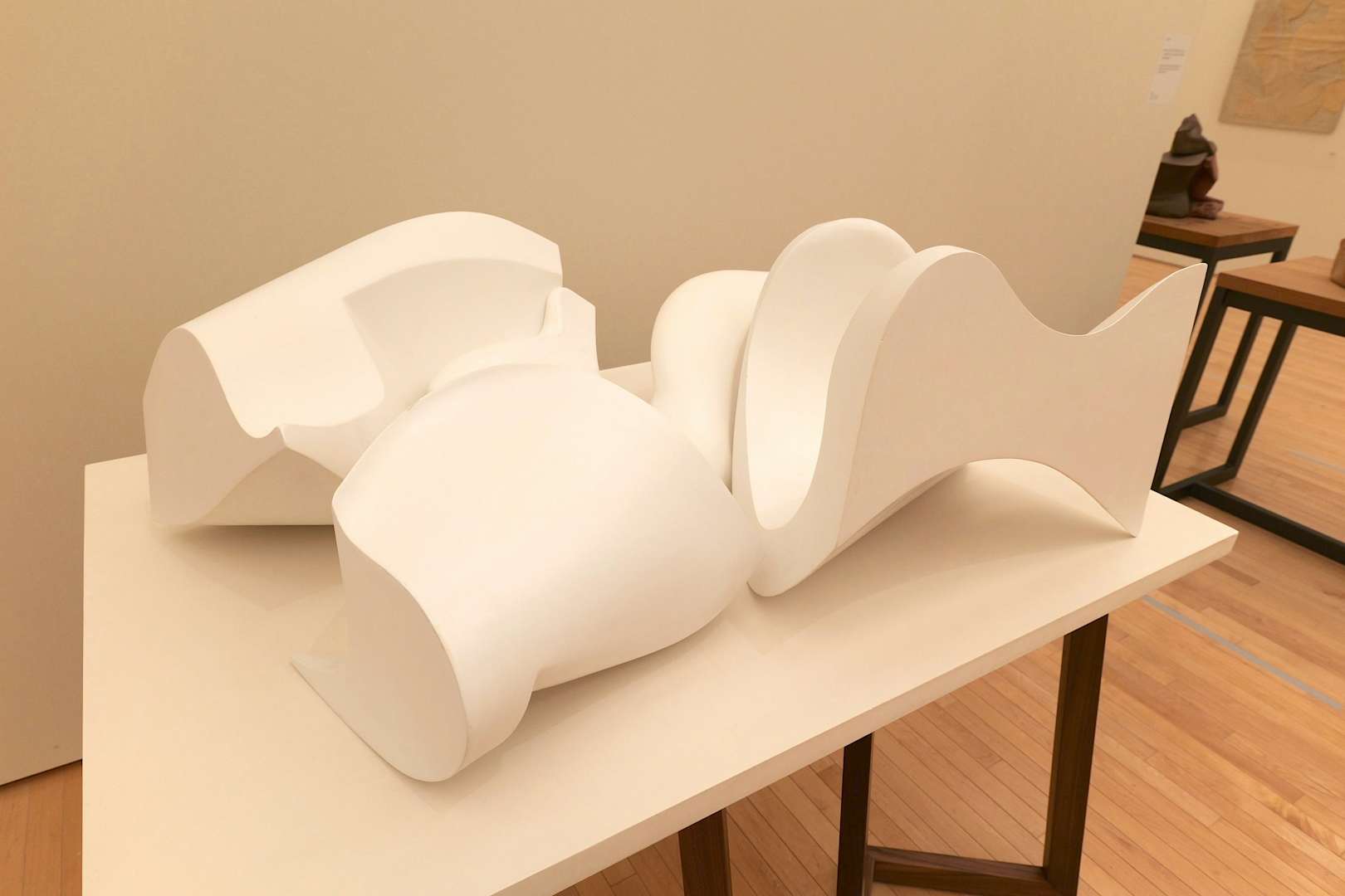 ボリュームのある彫刻は、1990年頃から始められたというが、会場にはこの「転回」前の彫刻も展示されている。1994年に制作された白いセラミック彫刻(2025年に再型抜き)は、《イーデーの山》(同じく再制作された原型モデルが展示されている)と同時期のもので最も古い作となるが、双方ともに、表面曲面は関数的にスムースに均らされ、そののちに制作されたセラミック彫刻にある襞、テクスチャー、ディテールは現れていない。