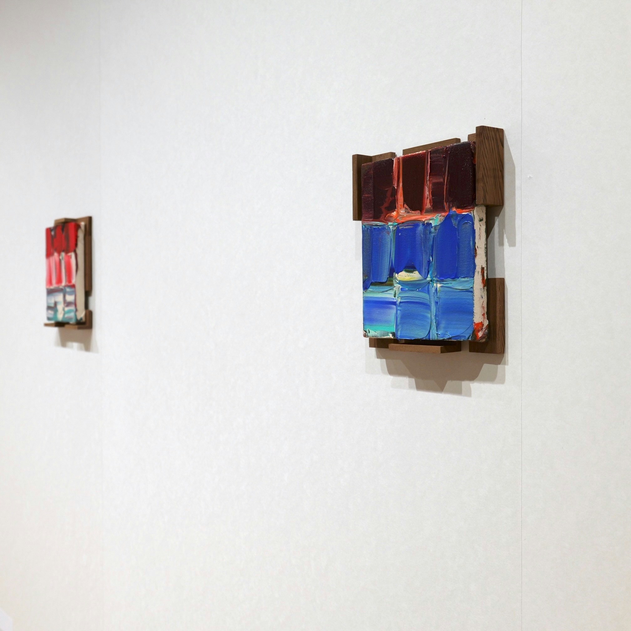 岡﨑がアクリル絵具による絵画に本格的に取り組み始めたのは1992年のことだ。以来、キャンバス上に断片的に絵具を載せ、それぞれの色やその濃淡によって生み出される立体感を感じさせる作品群を制作し続けている。