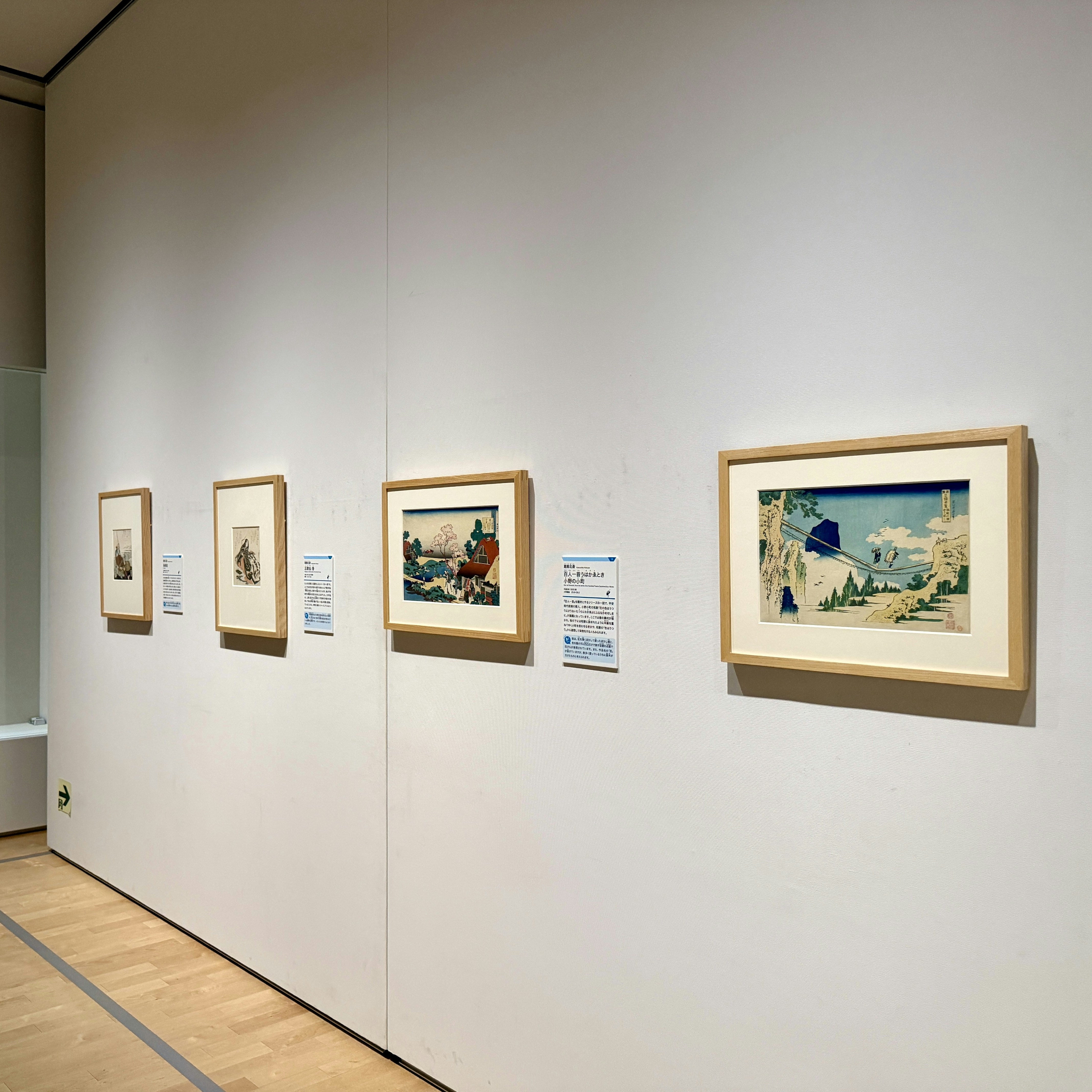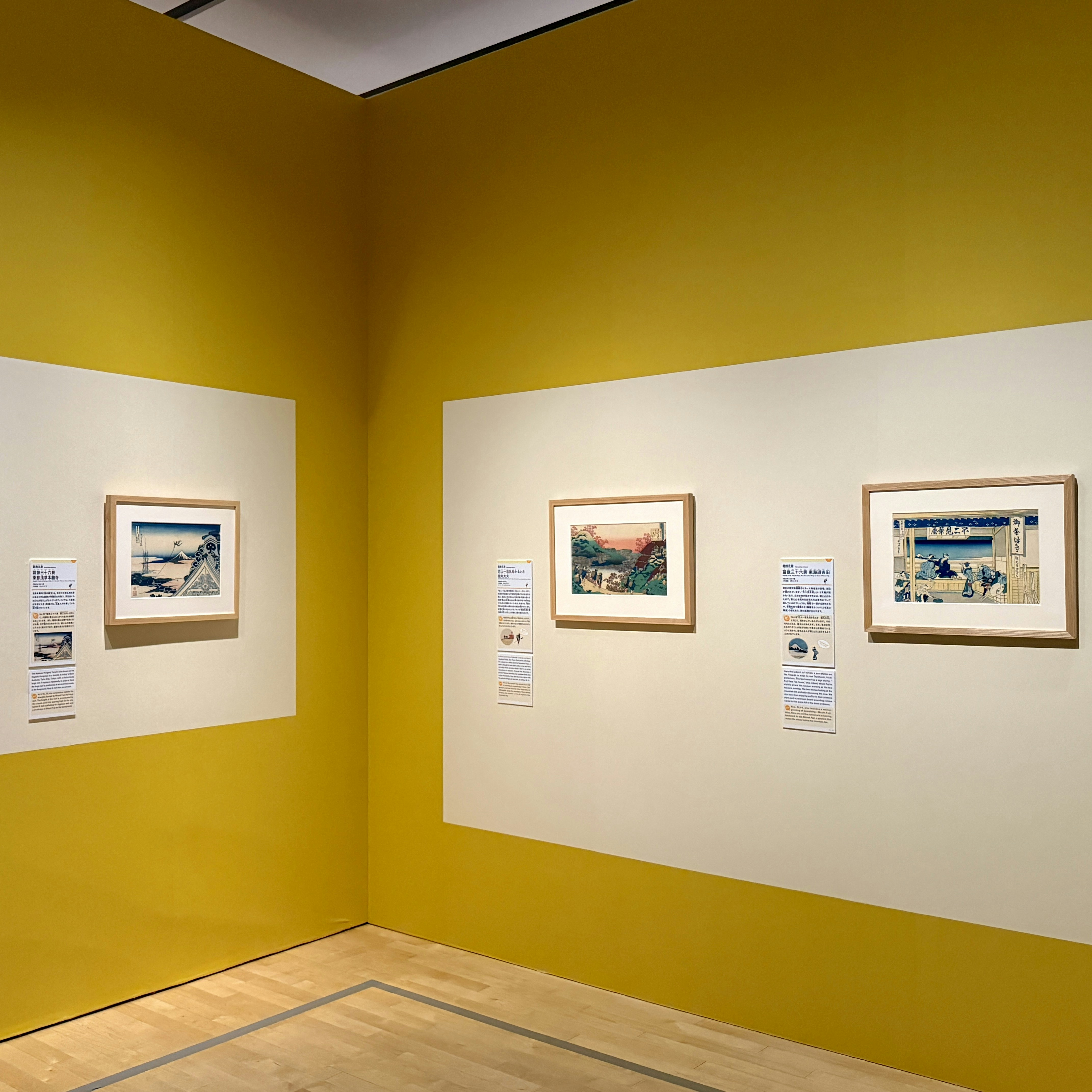 第2章「『あ!』っと、みつけて、みえてくる!」の展示風景より、左から《冨嶽三十六景 遠江山中》、《冨嶽三十六景 東都浅草本願寺》
