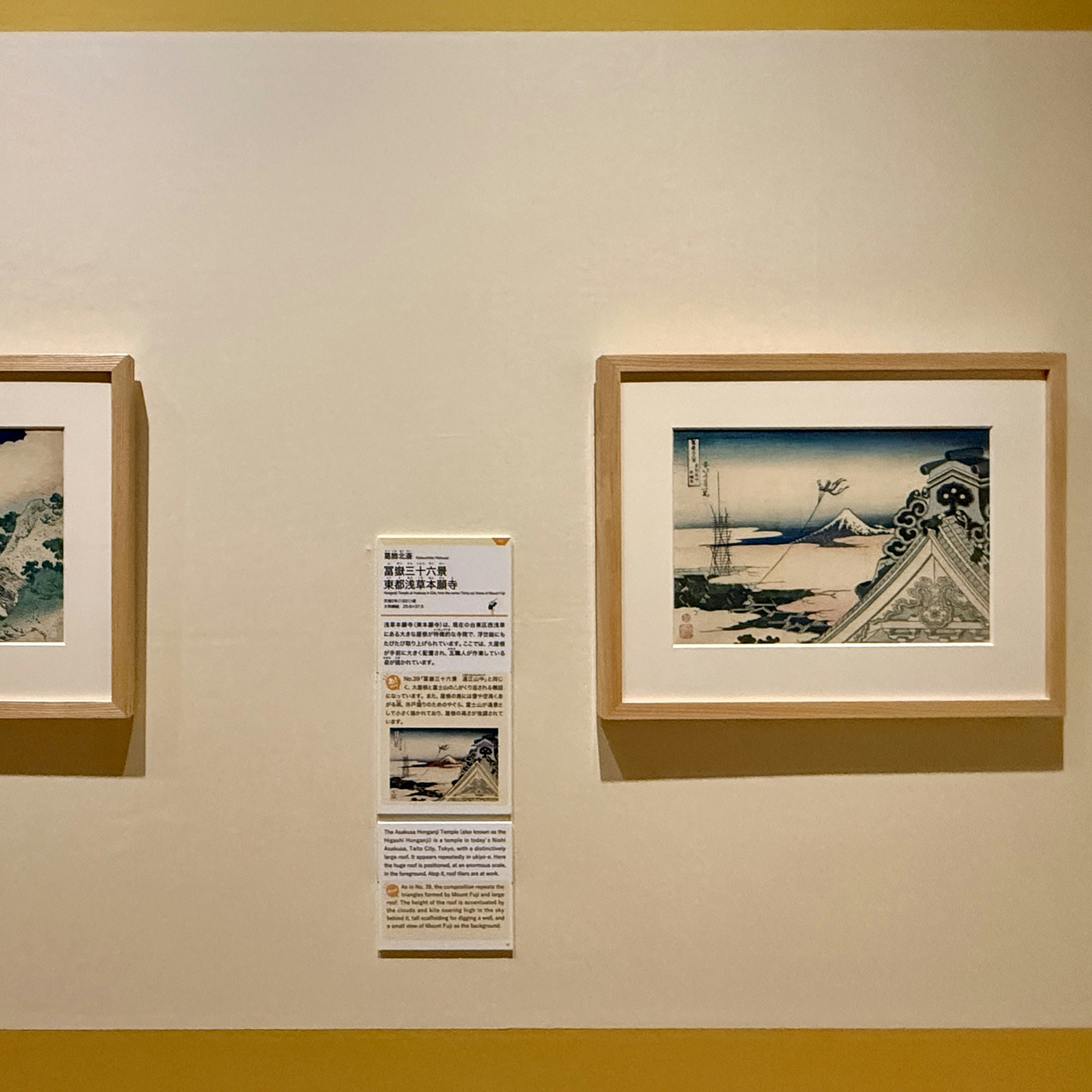 まず「共通点をみつける」視点からは、代表作《冨嶽三十六景 遠江山中》と《冨嶽三十六景 東都浅草本願寺》の2点が紹介されている。いずれの作品にも、画面手前に描かれた建物の大屋根と、遠景に配された富士山が、三角形の形状として繰り返されており、北斎が好んだ「△型の視覚的対比」が際立っている。