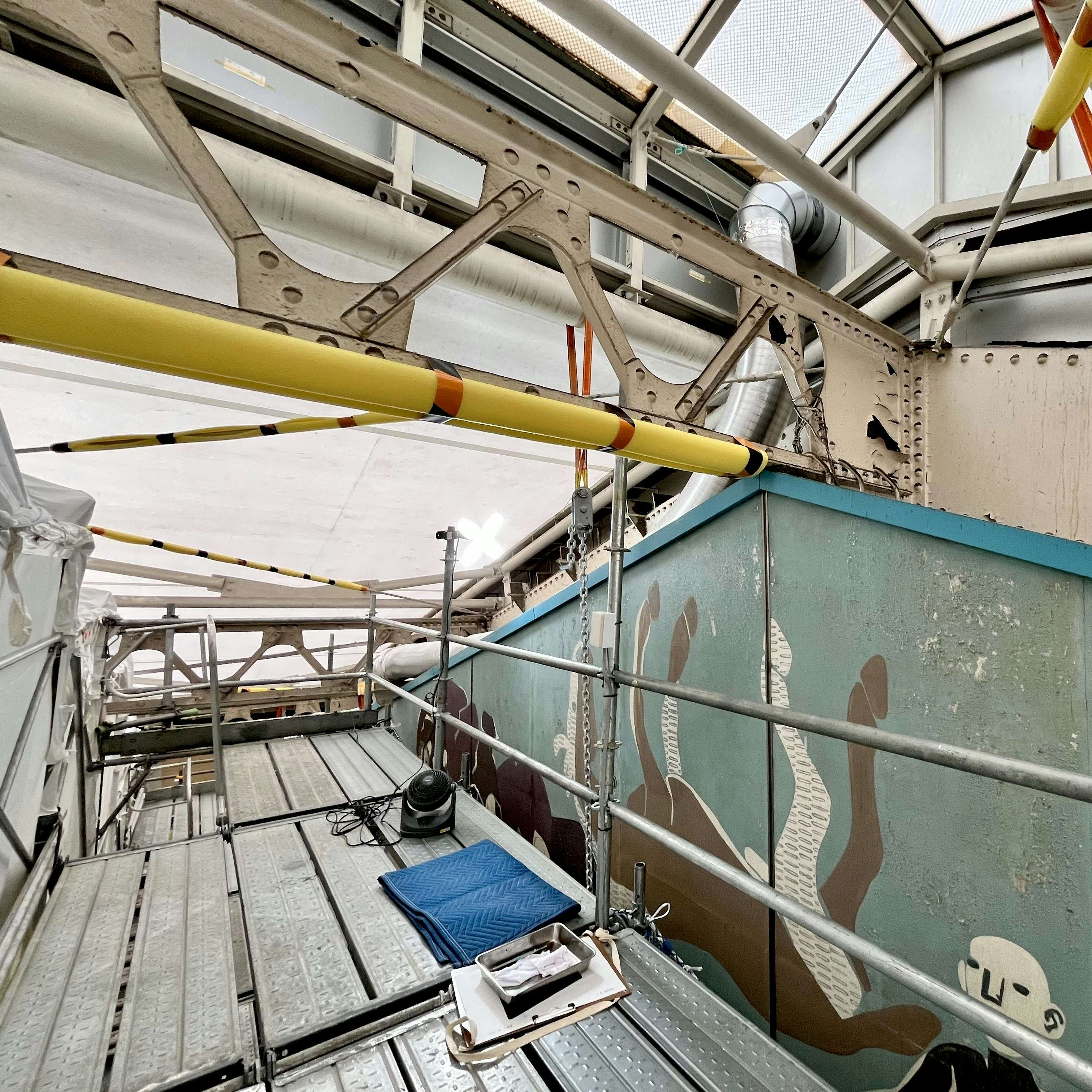 JR東日本上野駅コンコースにある猪熊弦一郎の壁画《自由》が現在修復中。その作業現場の様子をお届けする。