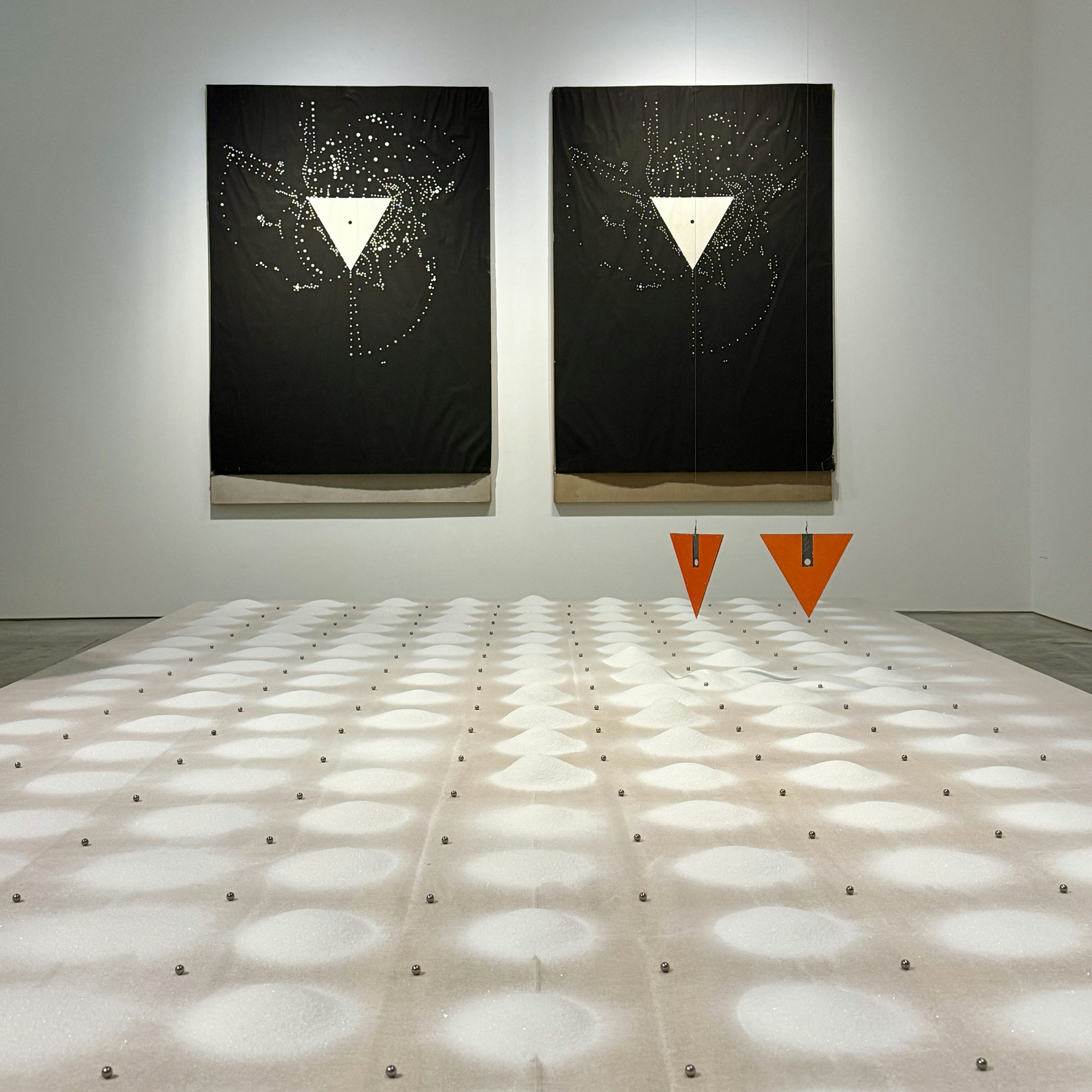 中西夏之の《着陸と着水》も、本展の文脈で再構成されたインスタレーションである。2016年に逝去した中西は、生前『天人五衰』の最終章に登場する「何もない庭」に強い関心を寄せていた。本作では、一見何もない空間に“目に見えない皮膜”が存在しているという感覚を、視覚的に体感させるような構成が試みられている。