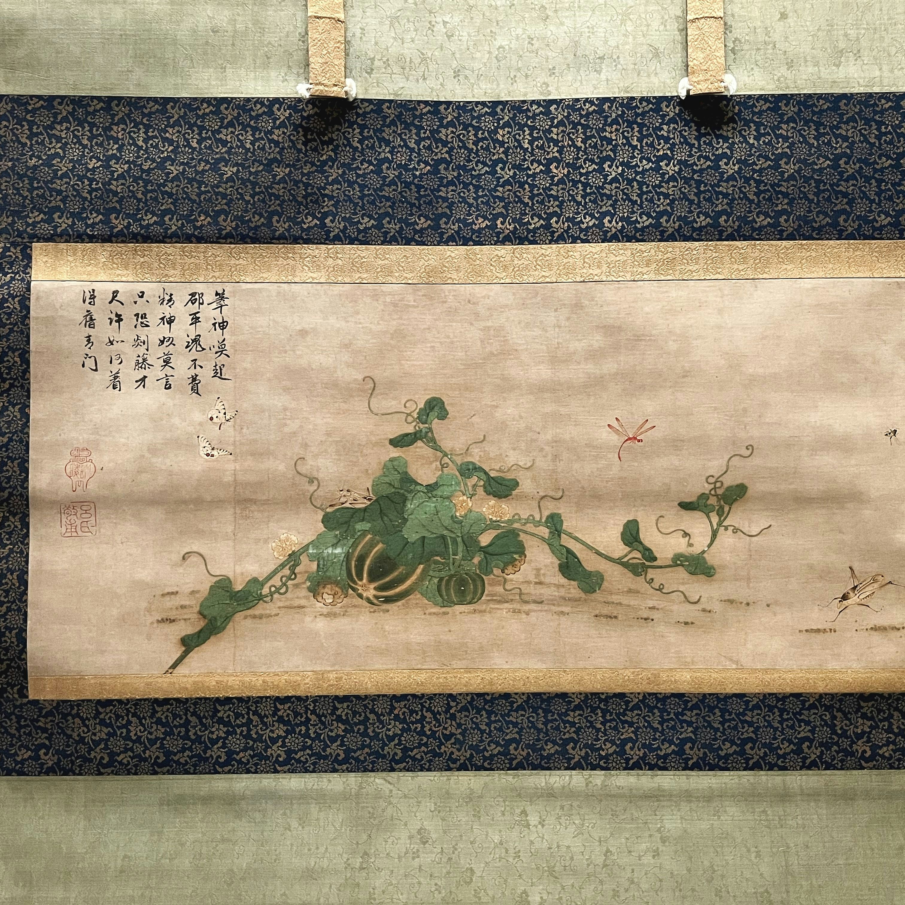 中国常州(江蘇省毘陵)を中心に多く描かれ、日本では「常州(毘陵)草虫画」と呼ばれた草虫画の最優品とされる《瓜虫図》(重文)は、子孫繁栄の象徴である瓜を花と大小の実で描き、周囲に蝶や蟷螂(カマキリ)などの虫を配する。瓜の蔓が絶妙な曲線をなした美しい一作だ。