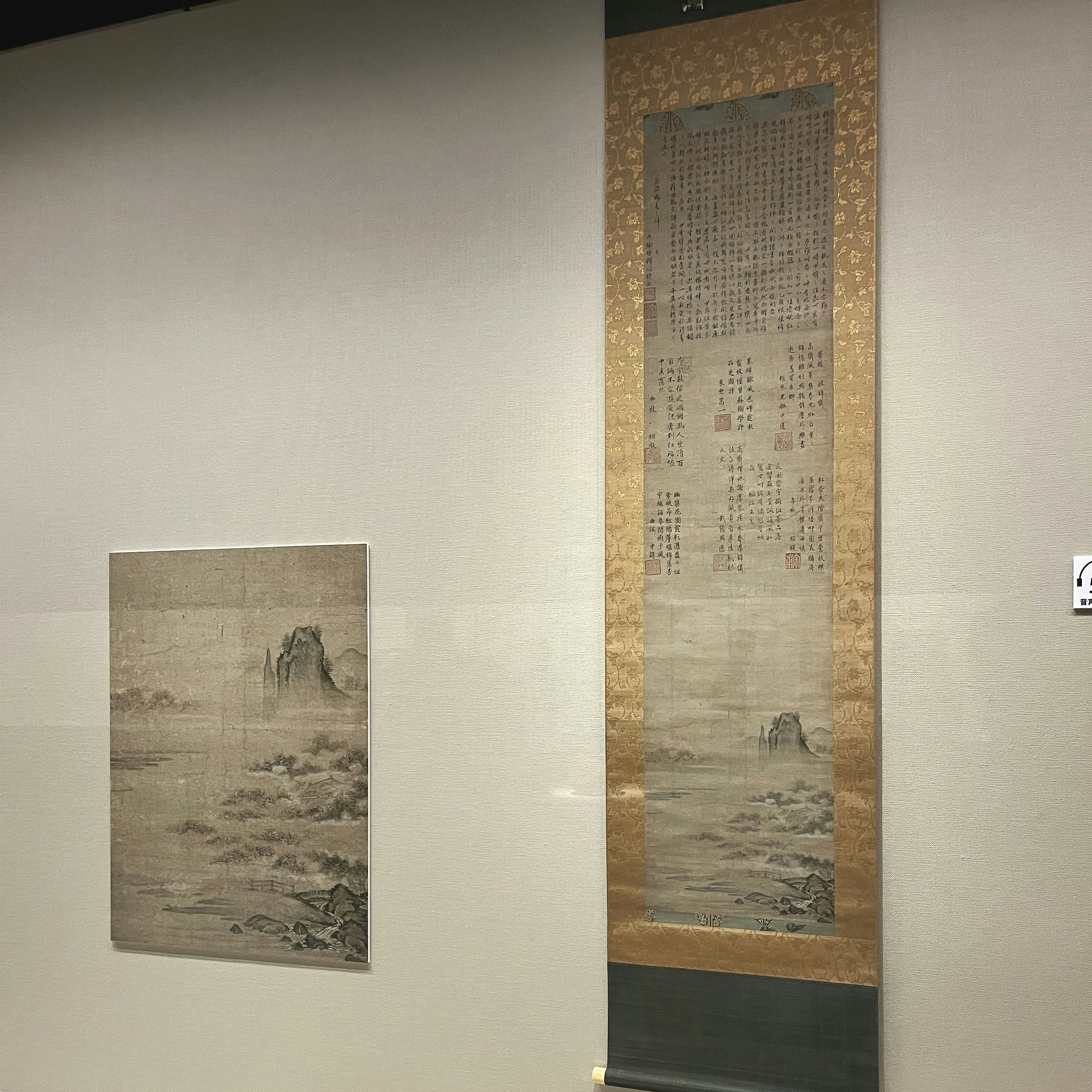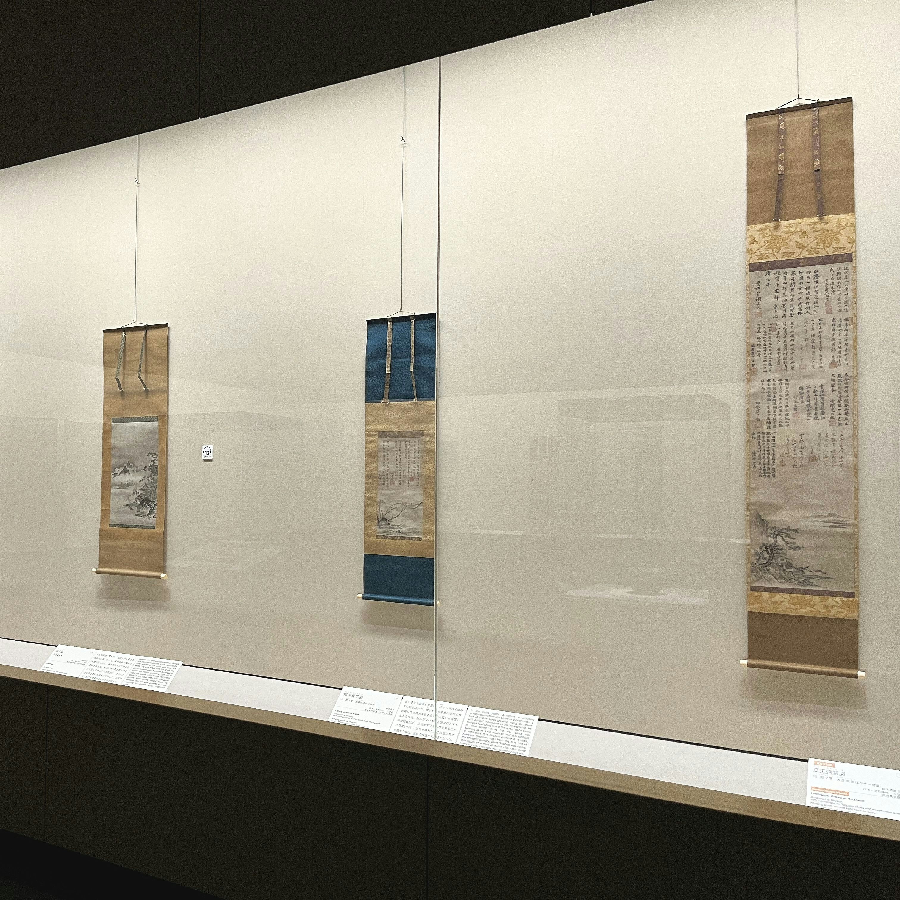 「周文とその弟子たち」展示風景より、伝 周文筆、大岳周崇ほか11僧賛 《江天遠意図》(重要文化財、室町時代・15世紀、根津美術館蔵)。当時の詩軸画を代表する名品
