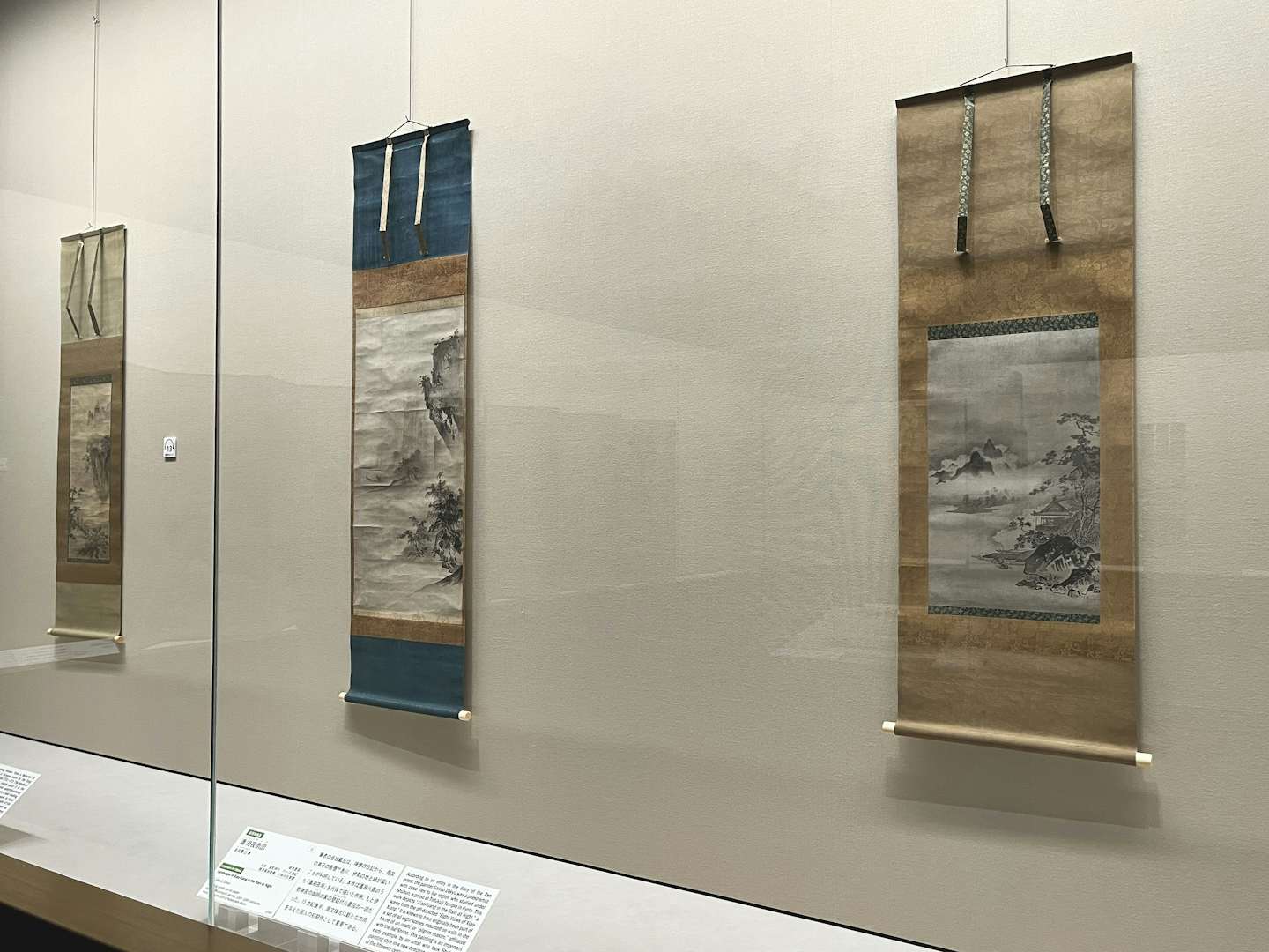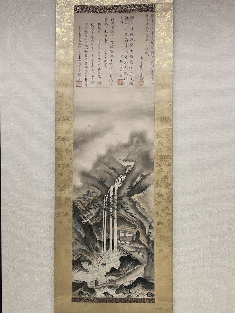 「祥啓と関東の水墨画」展示風景より、芸阿弥筆、月翁周鏡ほか2僧賛《観瀑図》(重要文化財、文明12年[1480]、根津美術館蔵)