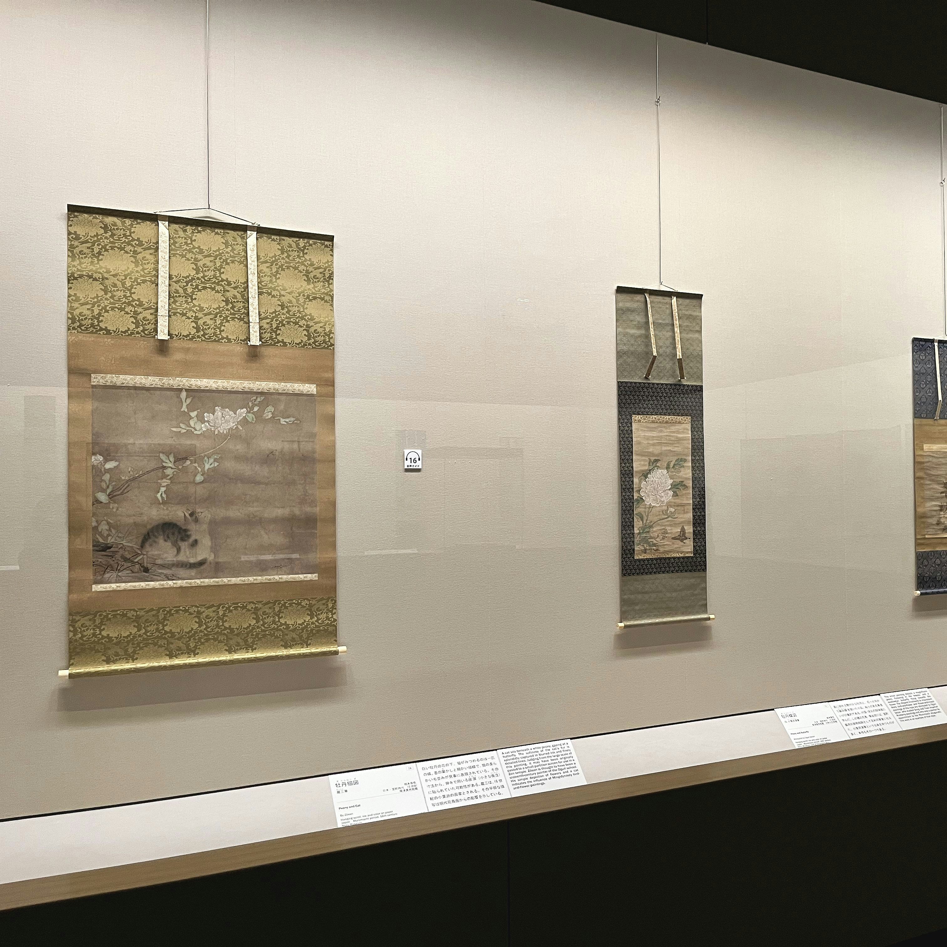 「花鳥画と草中図」展示風景より、蔵三《牡丹猫図》(室町時代・16世紀、根津美術館蔵)。同館でも人気の一作