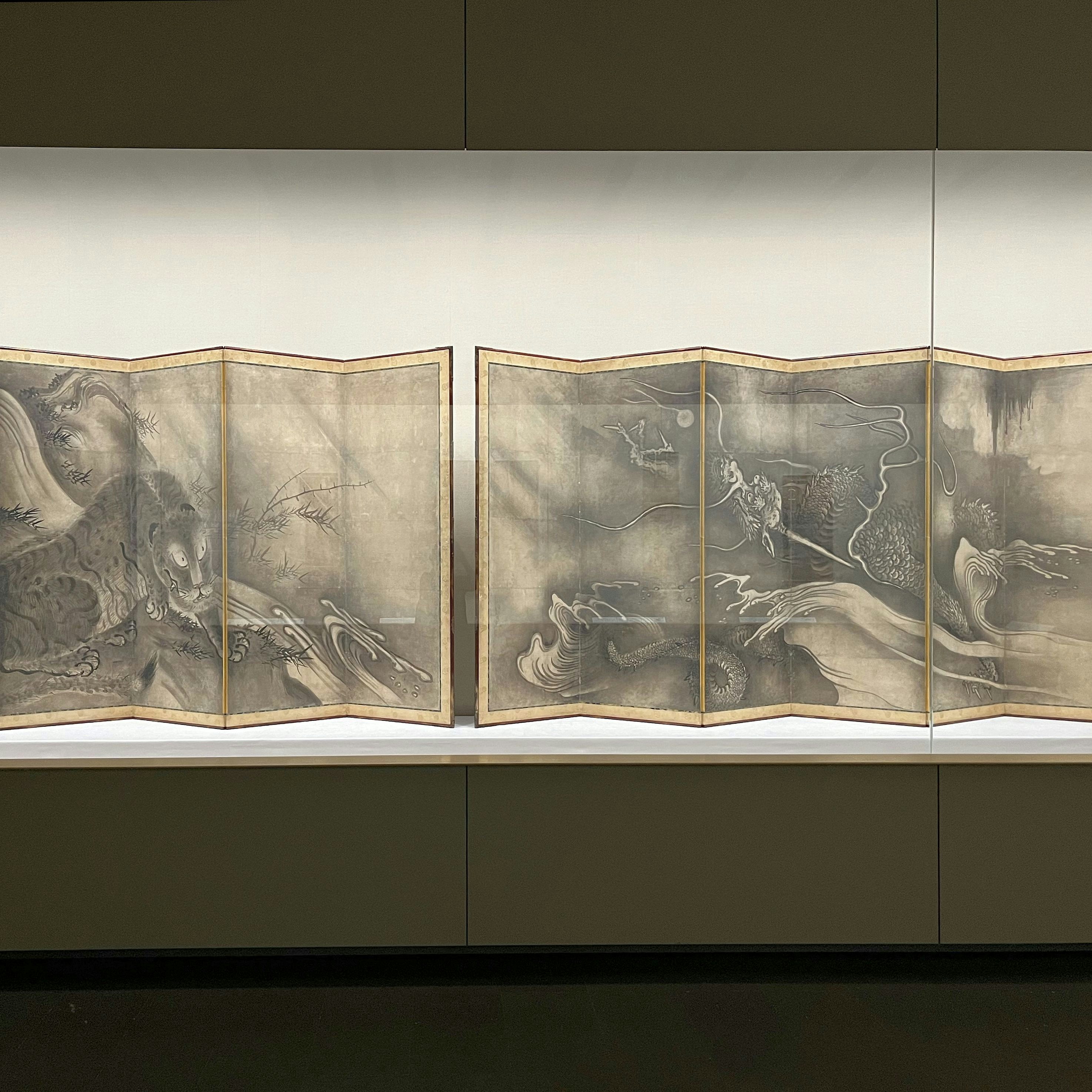 「小田原の狩野派と雪村」展示風景より、雪村周継 《龍虎図屛風》(室町時代・16世紀、根津美術館蔵)。水の表現、折れた竹や虎のポーズなど、雪村の個性が発揮されている