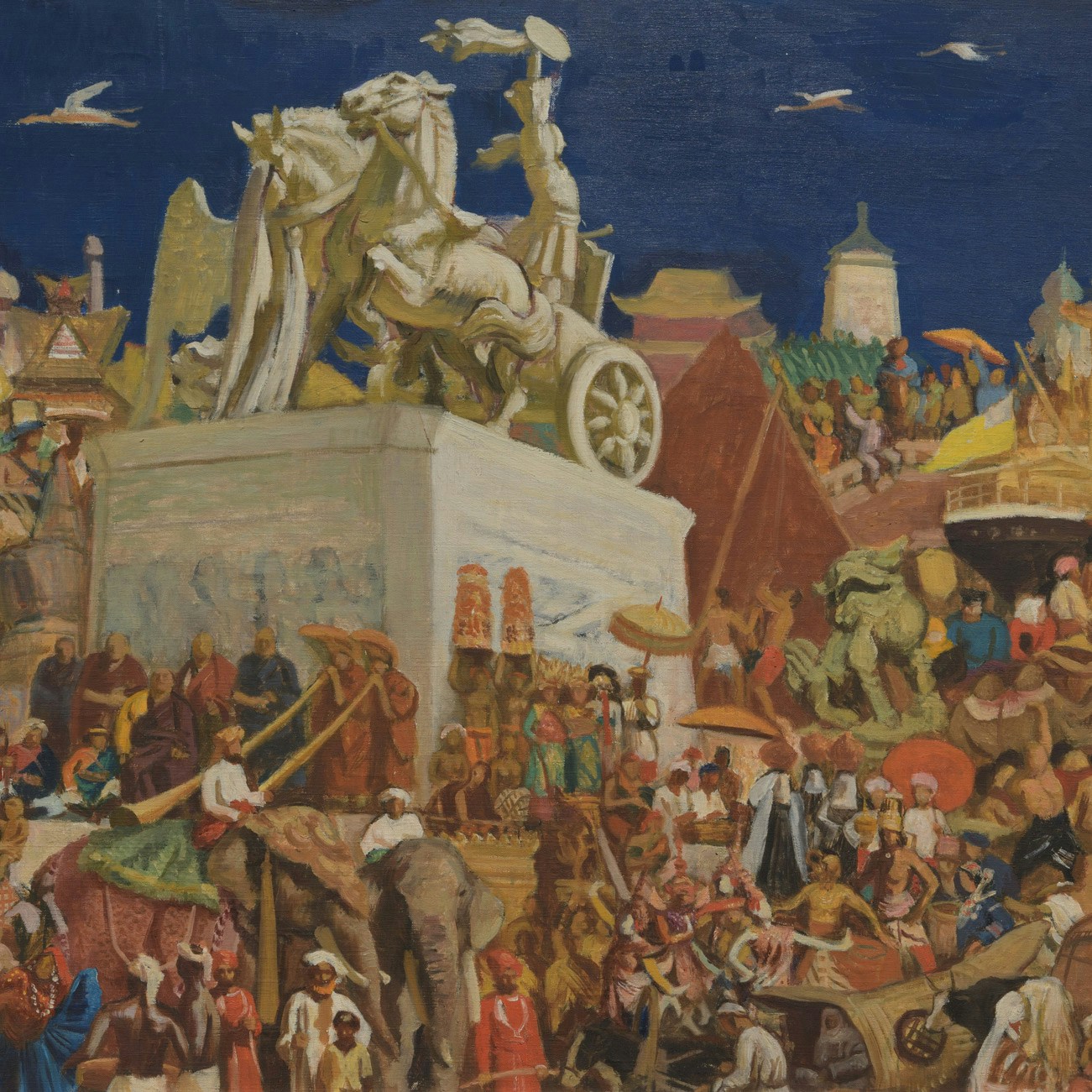 これら歴史の過程で、異国の文化や風俗は、画家に新たな画題を提供することとなる。和田三造《興亜曼荼羅》(1940)は、大東亜共栄圏の理念をそのまま図像化している。画面内にバリ島、インド、タイ、ミクロネシア、朝鮮、中国などの建築・風俗がびっしりと描き込まれ、画面中央に白い彫像が担がれる。これがどうやら「アジアのリーダー」たる日本を表している。本作をもとに2メートル超の大作が描かれ、大阪高島屋の食堂に飾られていたが、そちらは戦災で失われてしまった。