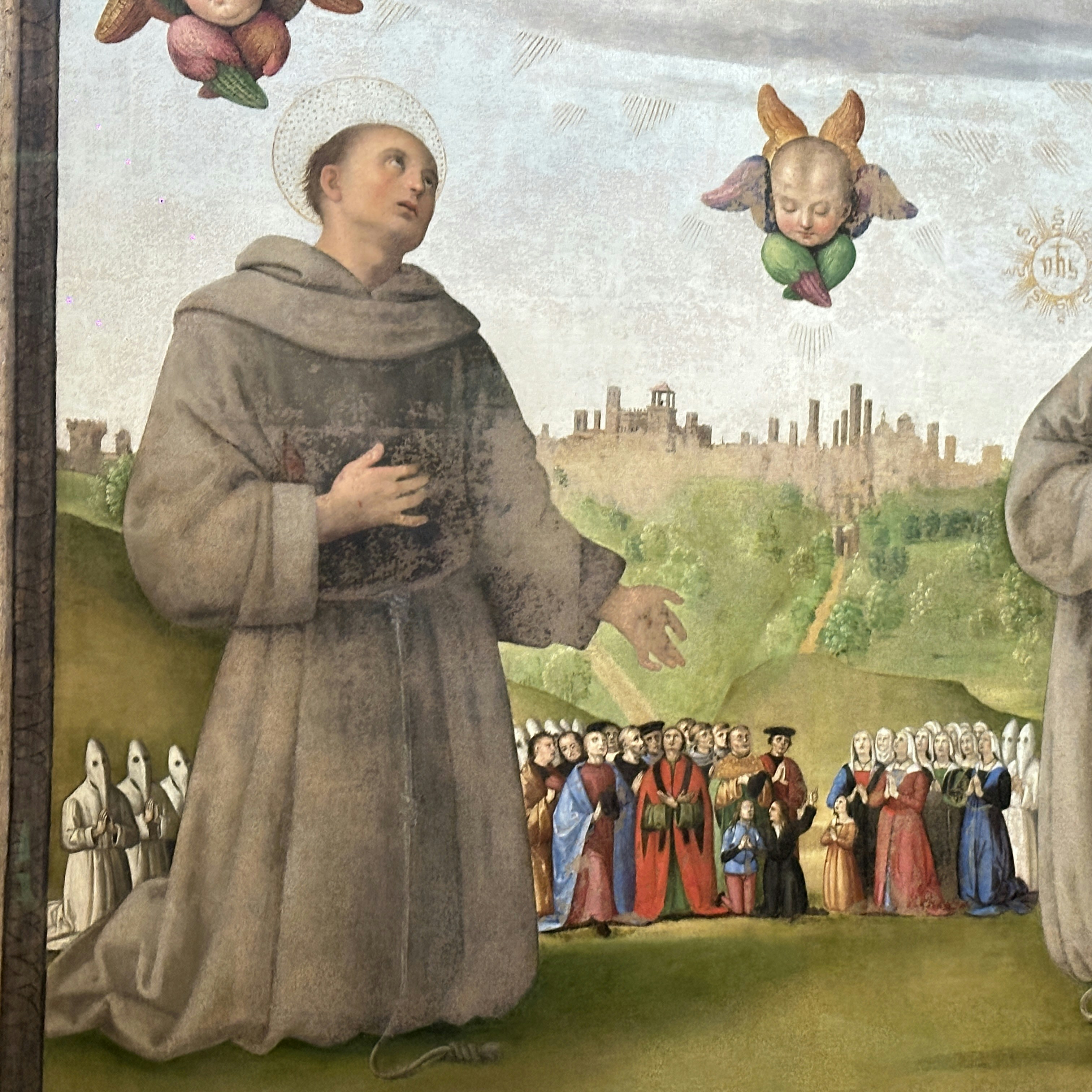 ウンブリア国立美術館(ペルージャ)が所蔵する本作はもともと聖ベルナルディーノ信徒会が行列用の旗(ゴンファローネ)として依頼したものであり、そのため地域的なアイデンティティが強く込められている。