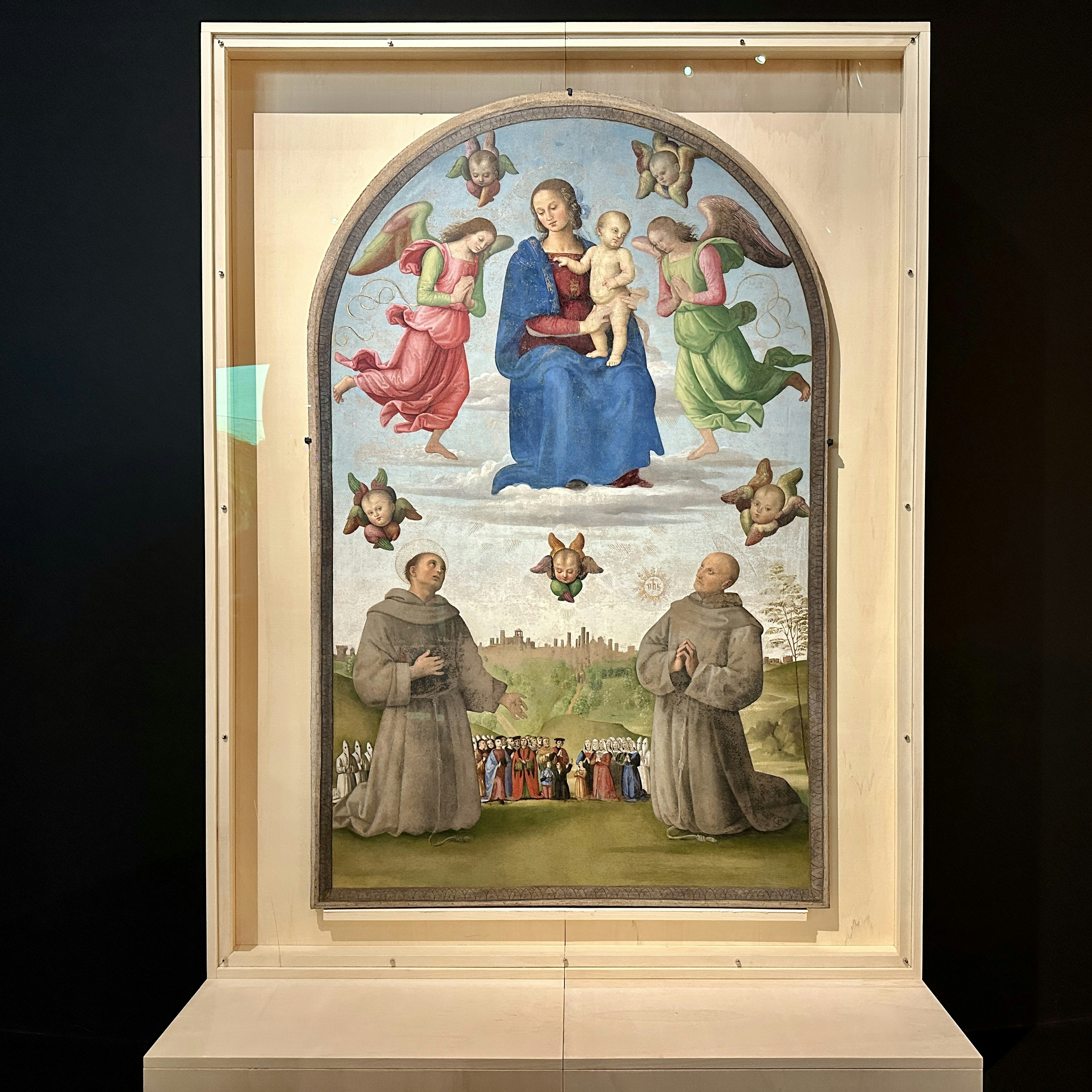 本作画面は上下2段で構成されており、上部にはセラフィムと踊る天使たちに囲まれた聖母子が、下部には祈りを捧げる聖フランチェスコと聖ベルナルディーノ・ダ・シエナ、そして頭巾を被った信者を含む群衆が描かれている。背景に描かれるのは、当時のウンブリア州ペルージャの街並みだ。