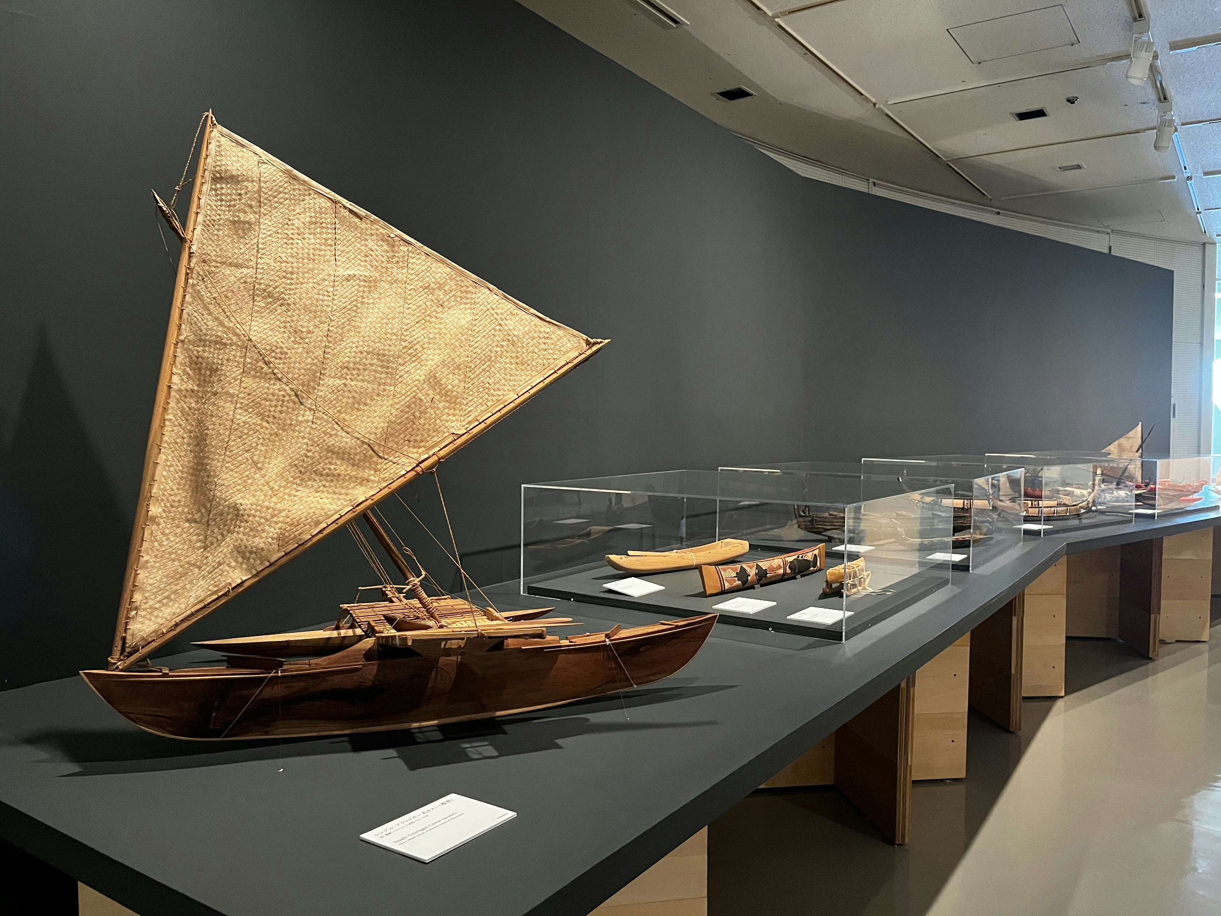第4章「南洋圏の舟」展示風景より、中央はパプアニューギニアのマッシム地域で行われているクラ交易のためのカヌーで、貝を用いた美しい装飾にも注目。大きな帆は、同地に植生を持つ葉が用いられている