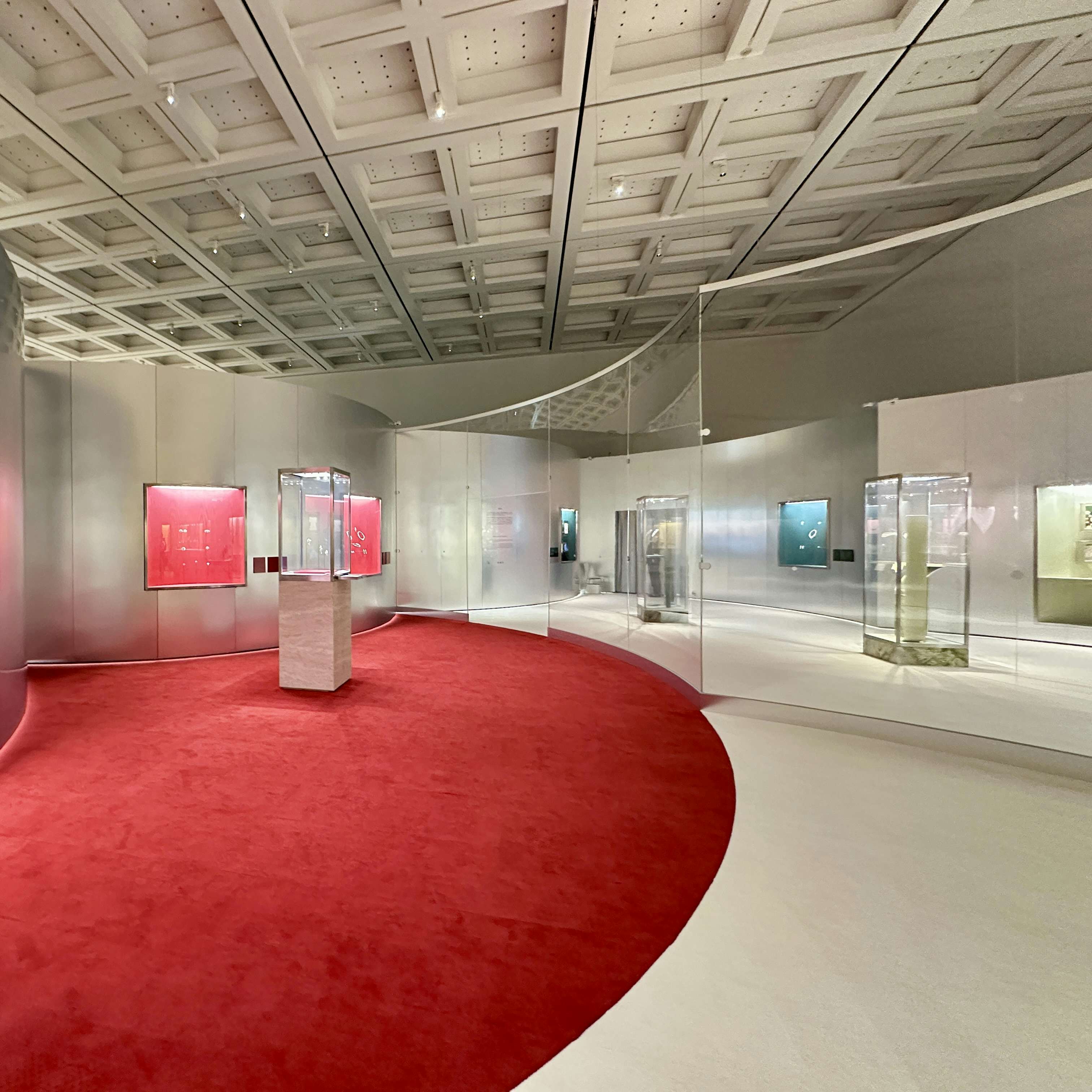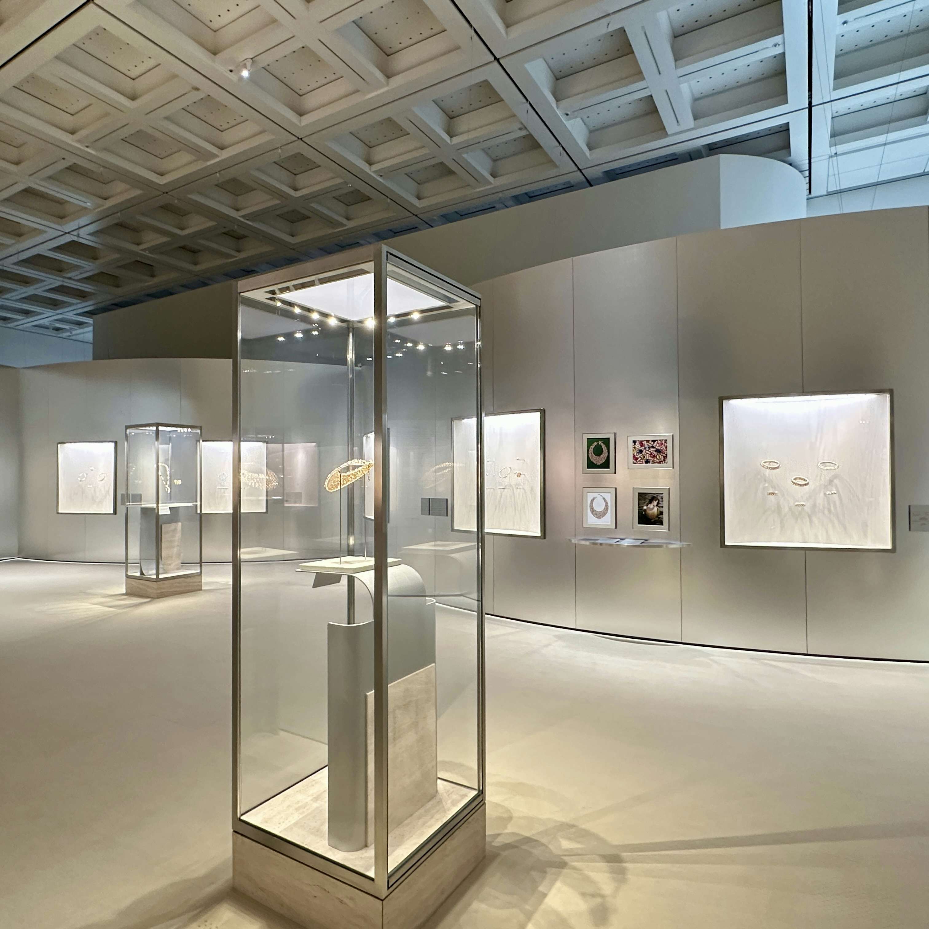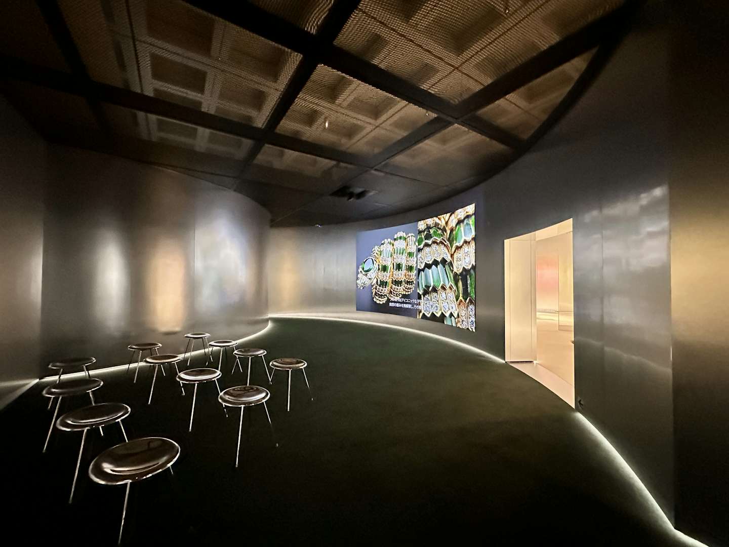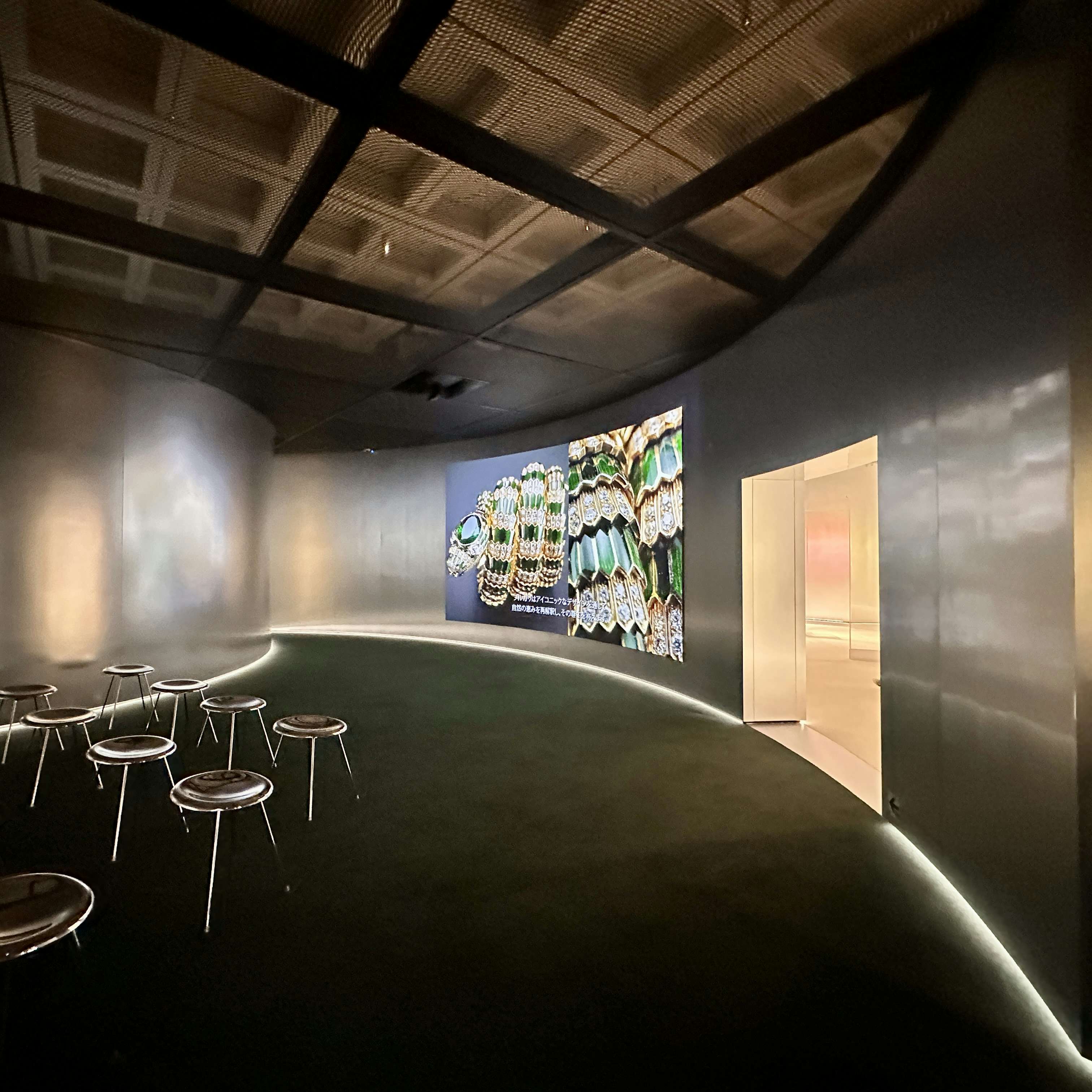 展覧会成功の鍵を握る会場デザインは、妹島和世と西沢立衛による建築家ユニット「SANAA」と、イタリアのデザインユニット「フォルマファンタズマ」が協働。会場は古代ローマの皇帝カラカラが造営した浴場のモザイク画のパターンと東京都のシンボルツリーであるイチョウから着想を得た反復のパターンとなっており、そこにアルミ、アクリル、色のパネル用いることで、ジュエリーの輝きを増幅させている。会場に入ると、展覧会がどこまでも広がっていく感覚を抱くだろう。国立新美術館主任研究員・宮島綾子は、「来場者は空間の一部になり、ブルガリの芸術を体感してもらえるのではないか」と、この空間に自信を覗かせる。