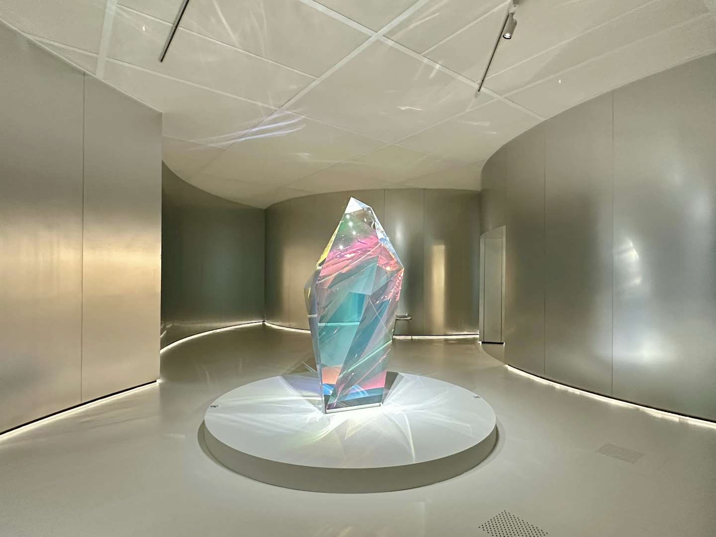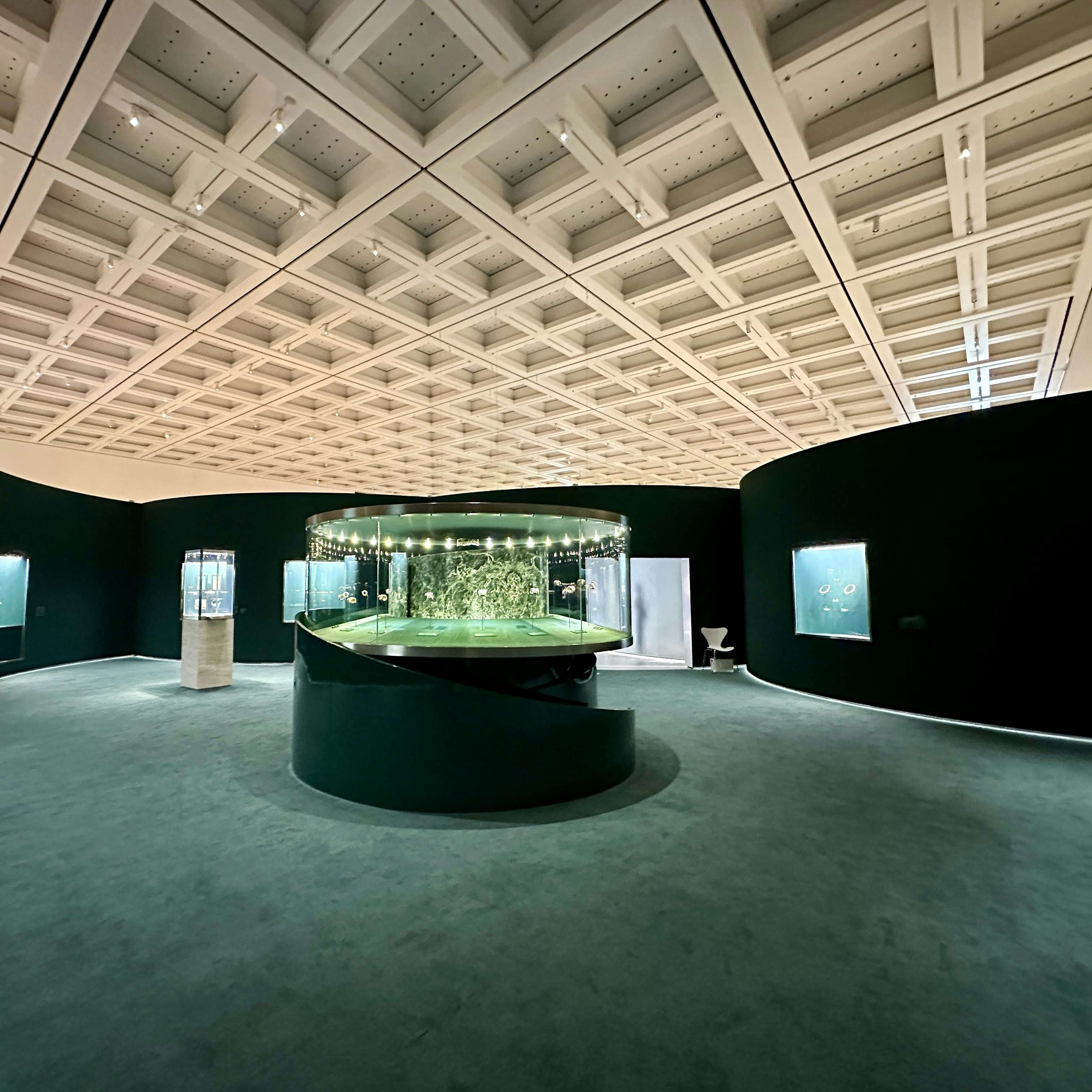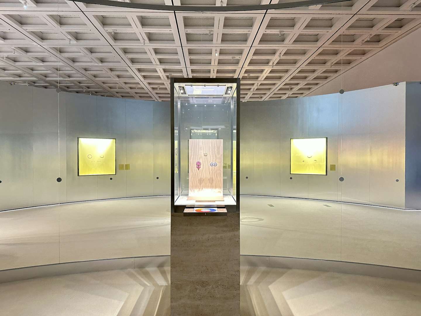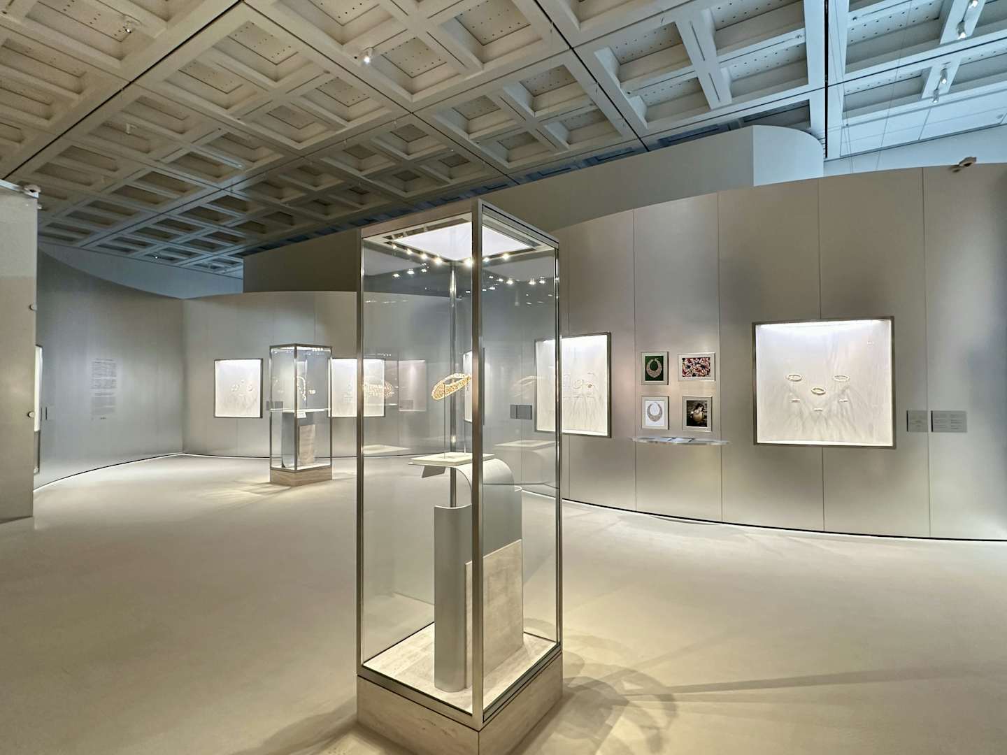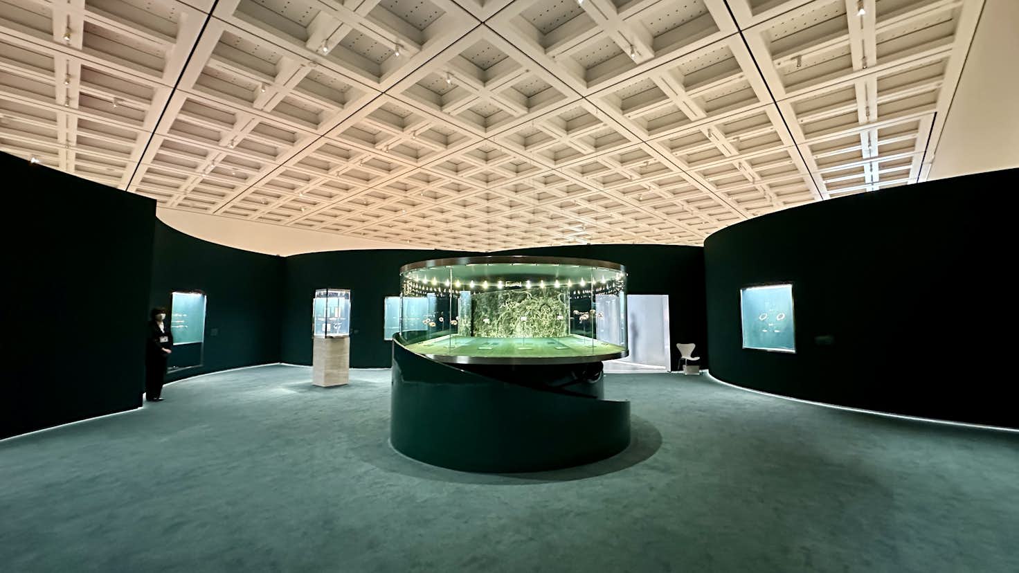 展覧会成功の鍵を握る会場デザインは、妹島和世と西沢立衛による建築家ユニット「SANAA」と、イタリアのデザインユニット「フォルマファンタズマ」が協働。会場は古代ローマの皇帝カラカラが造営した浴場のモザイク画のパターンと東京都のシンボルツリーであるイチョウから着想を得た反復のパターンとなっており、そこにアルミ、アクリル、色のパネル用いることで、ジュエリーの輝きを増幅させている。会場に入ると、展覧会がどこまでも広がっていく感覚を抱くだろう。国立新美術館主任研究員・宮島綾子は、「来場者は空間の一部になり、ブルガリの芸術を体感してもらえるのではないか」と、この空間に自信を覗かせる。