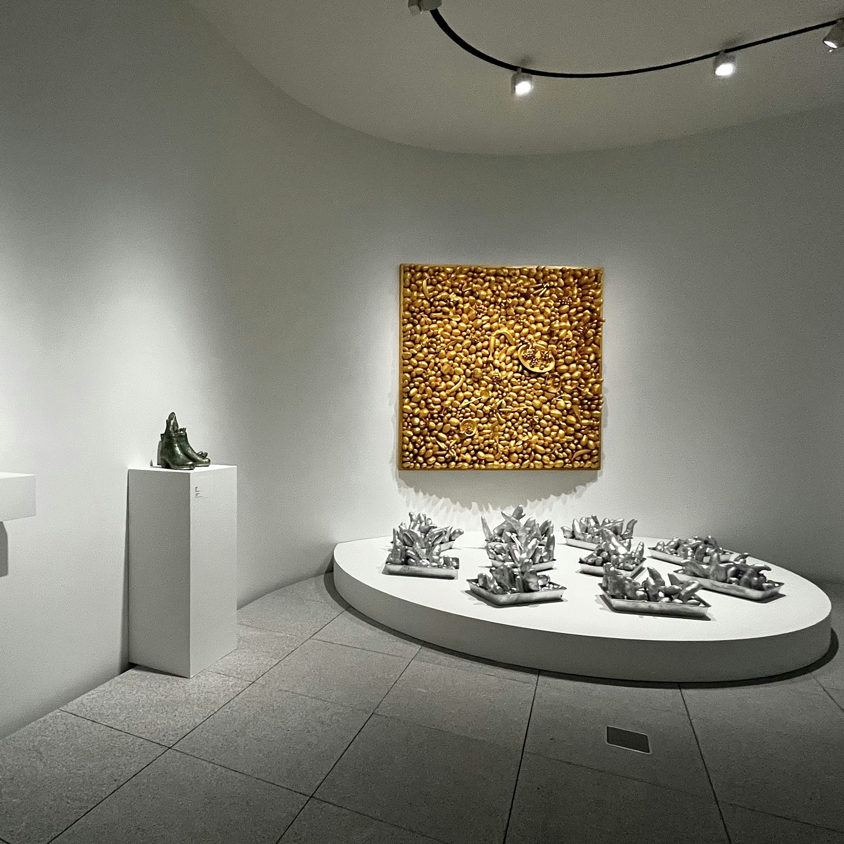 展示風景より、手前から《14丁目のハプニング》(1966)、《ウォーキング・ピース》(1966頃) (C) YAYOI KUSAMA