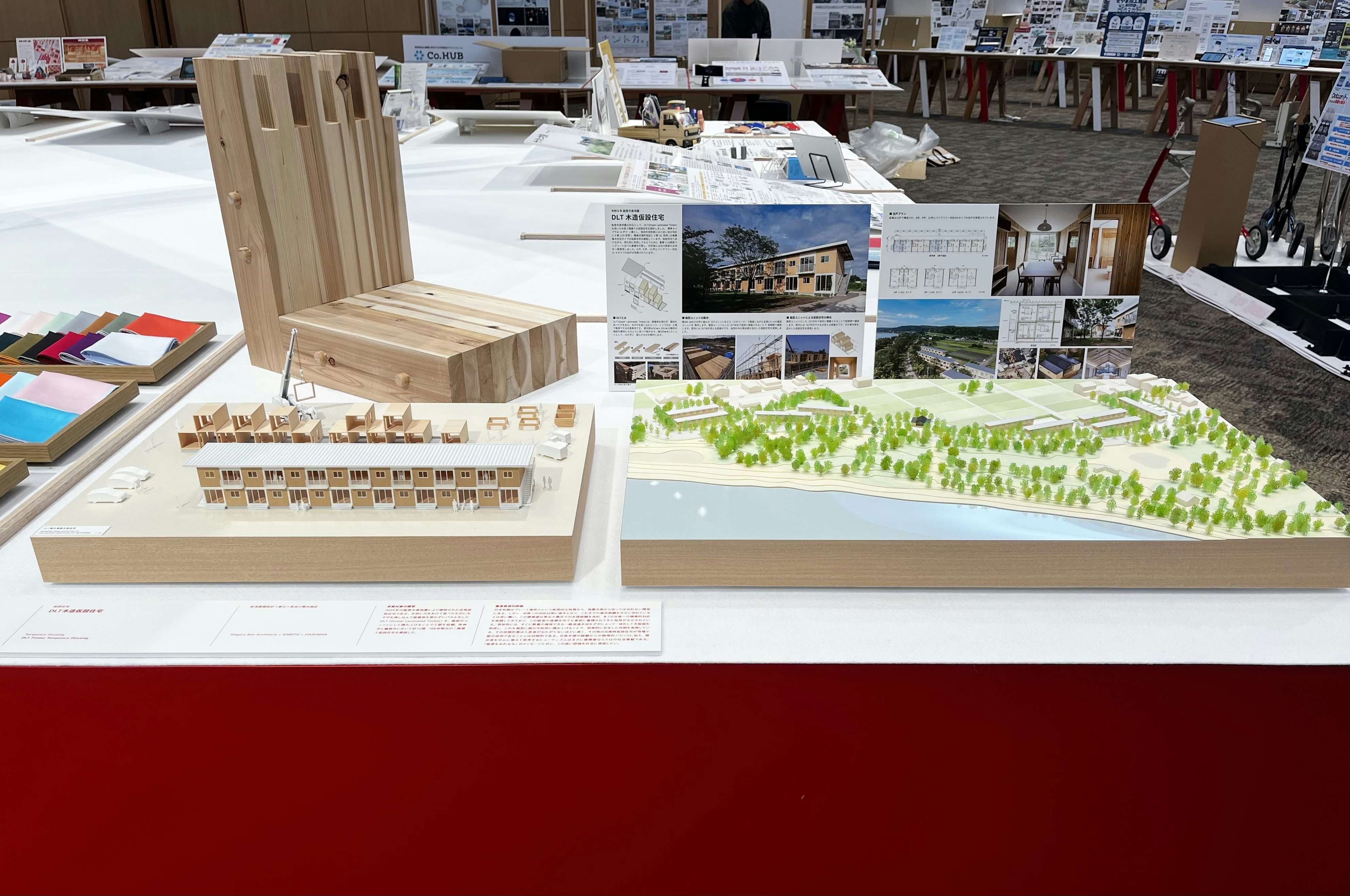 東京ミッドタウン地下1階ホールA 展示風景より、グッドデザイン大賞を受賞した、坂茂建築設計+株式会社家元+株式会社長谷川萬治商店による仮設住宅「DLT木造仮設住宅」。効率的で安定した居住空間に加え、入居者が離れたくなくなるほどの快適さを実現した。簡素で劣悪になりがちな被災地の仮設住宅を、実際に利用する被災者の視点から設計した点が高く評価された