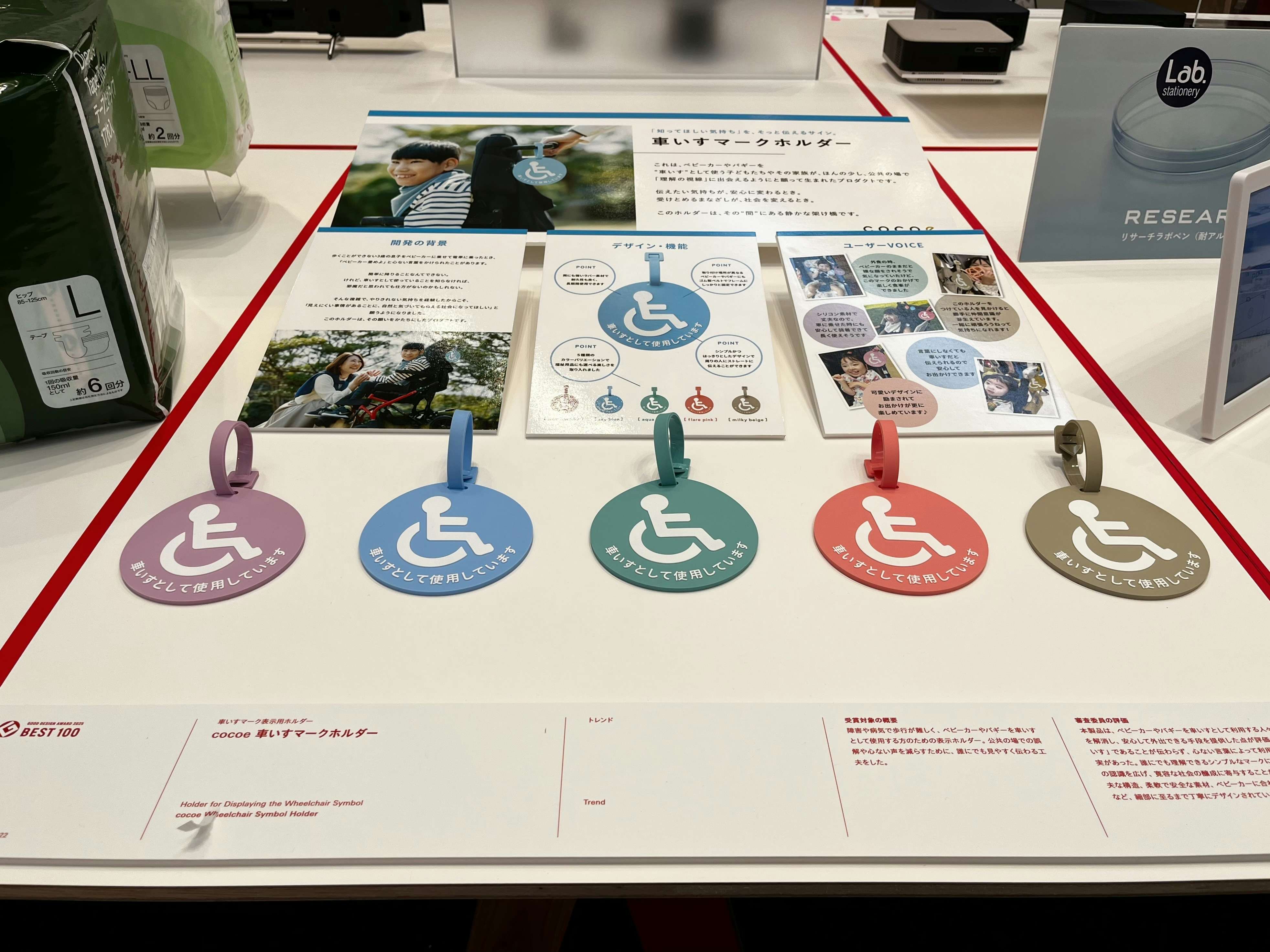 東京ミッドタウン地下1階ホールA 展示風景より、「cocoe 車いすマークホルダー」。ベビーカーやバギーを車いす代わりに使う方のための表示ホルダー。周囲の誤解を防ぎ、安心して外出できる環境を提供することができる