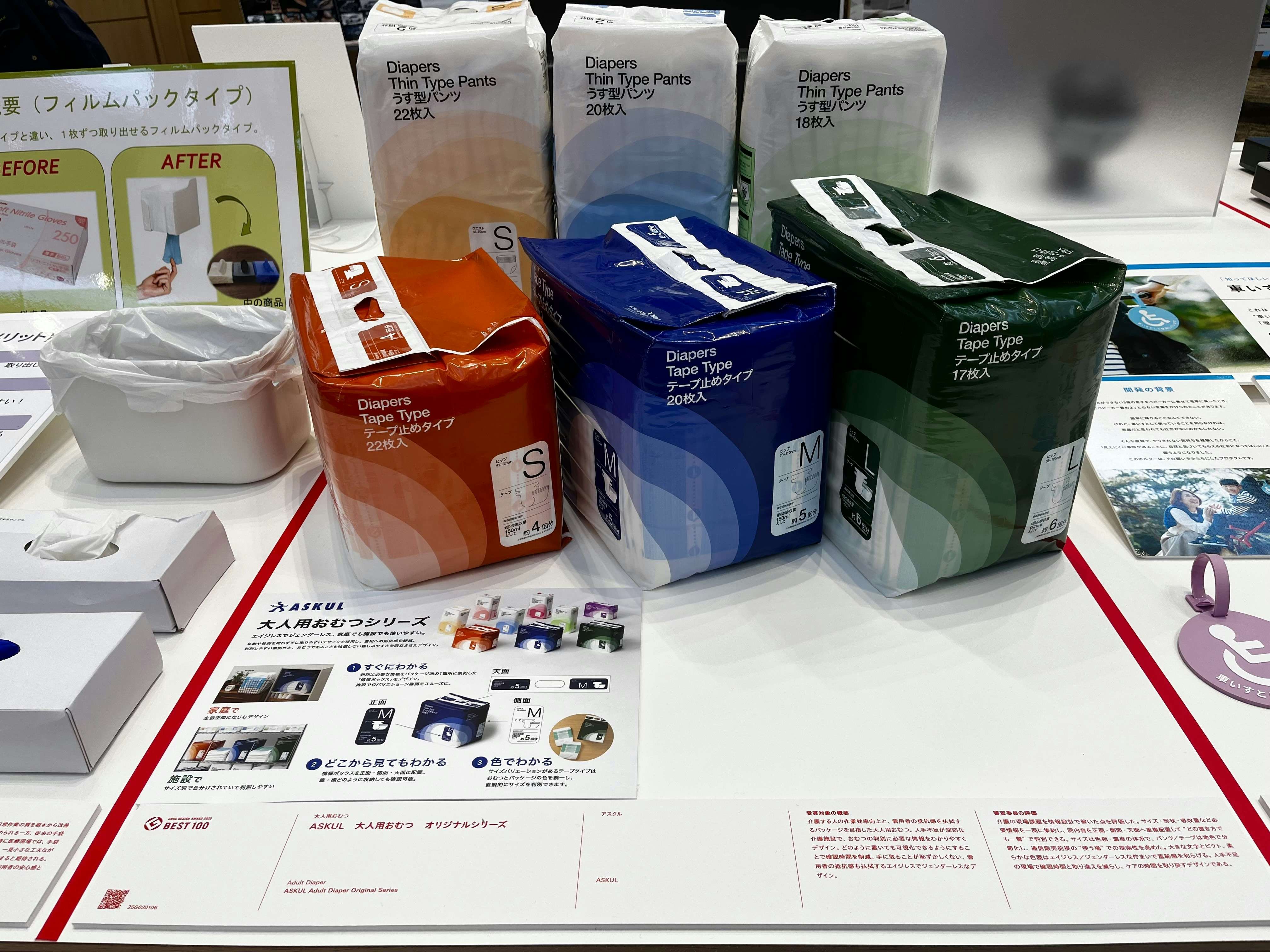 東京ミッドタウン地下1階ホールA 展示風景より、「ASKUL 大人用おむつ オリジナルシリーズ」。人手不足が深刻な介護施設で、おむつの種類が識別しやすいようデザインされている