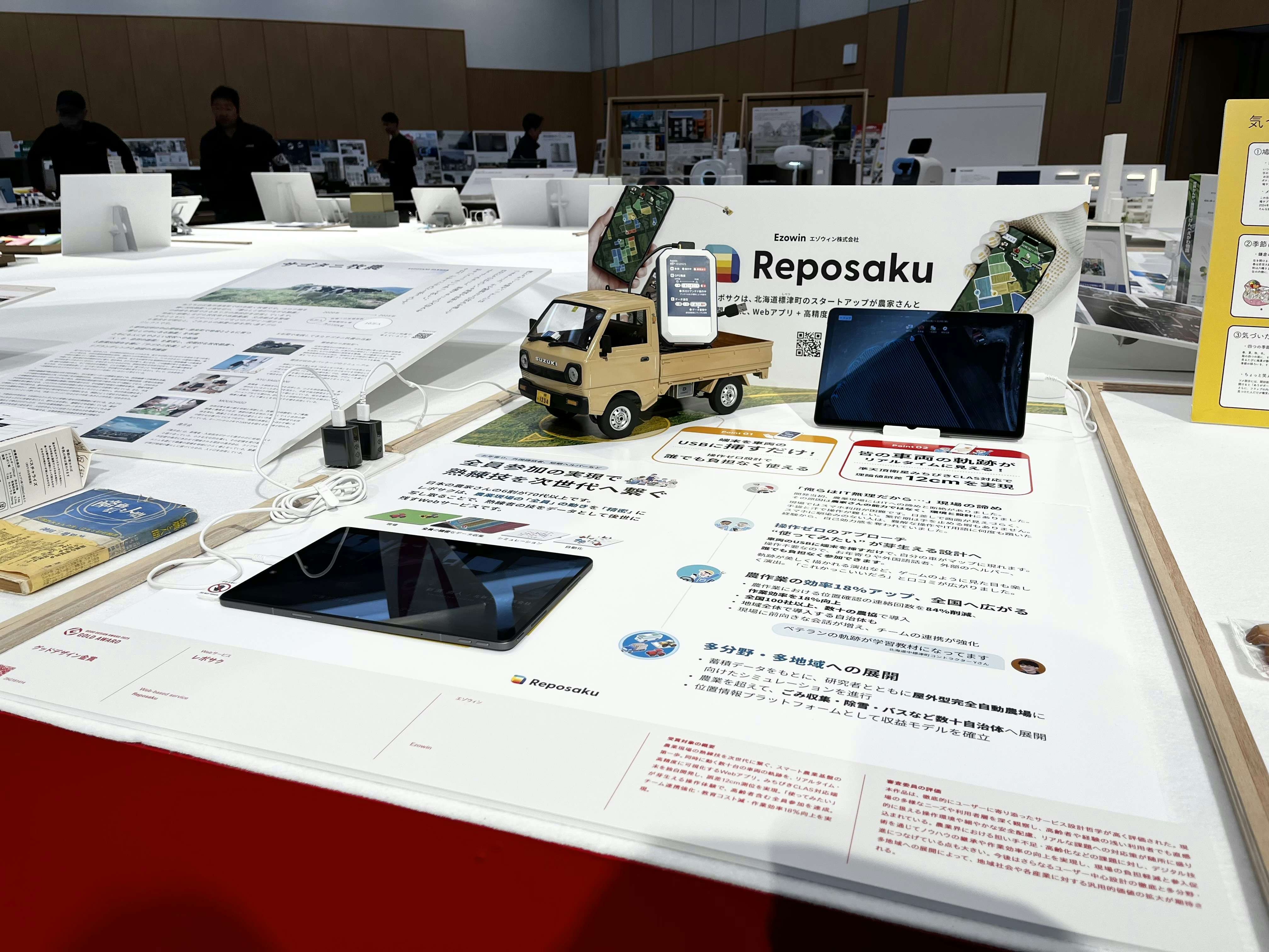 東京ミッドタウン地下1階ホールA 展示風景より、こちらも金賞を受賞したエゾウィン株式会社によるウェブサービス「レポサク」。数十台の車両が同時に動く農業現場では、その動きは長年従事してきた人たちの熟練技によって受け継がれてきた。本サービスはその動きをリアルタイムで可視化し、次世代へ継承できる。高齢者でもUSBを挿すだけで使える分かりやすいUIが魅力で、担い手不足や高齢化といった課題への貢献も評価された