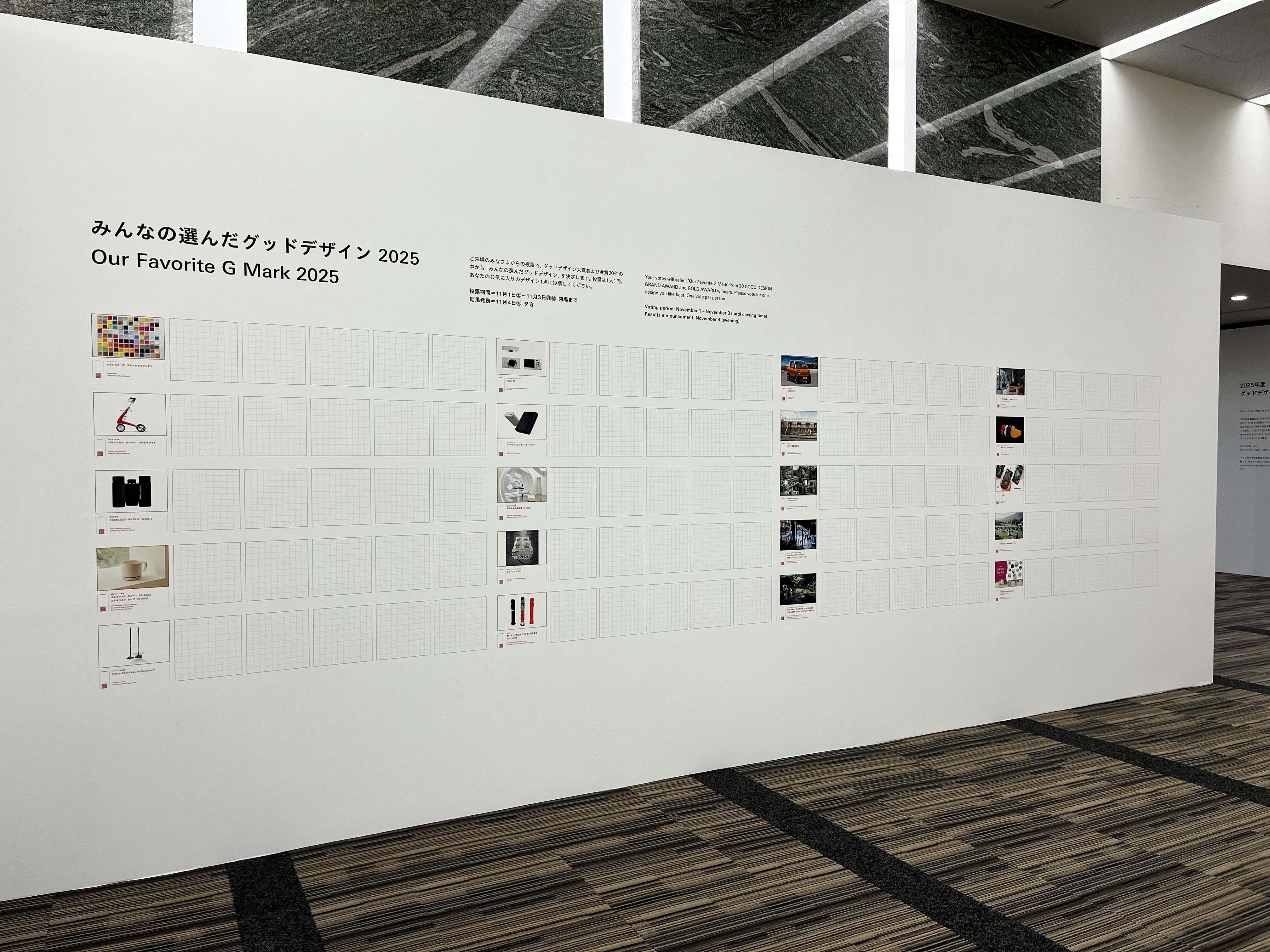東京ミッドタウン地下1階ホールA 展示風景より。かつて「G展」とも呼ばれていたグッドデザイン賞。その愛称が今年のメインビジュアルとして蘇った。デザインは菊地敦己