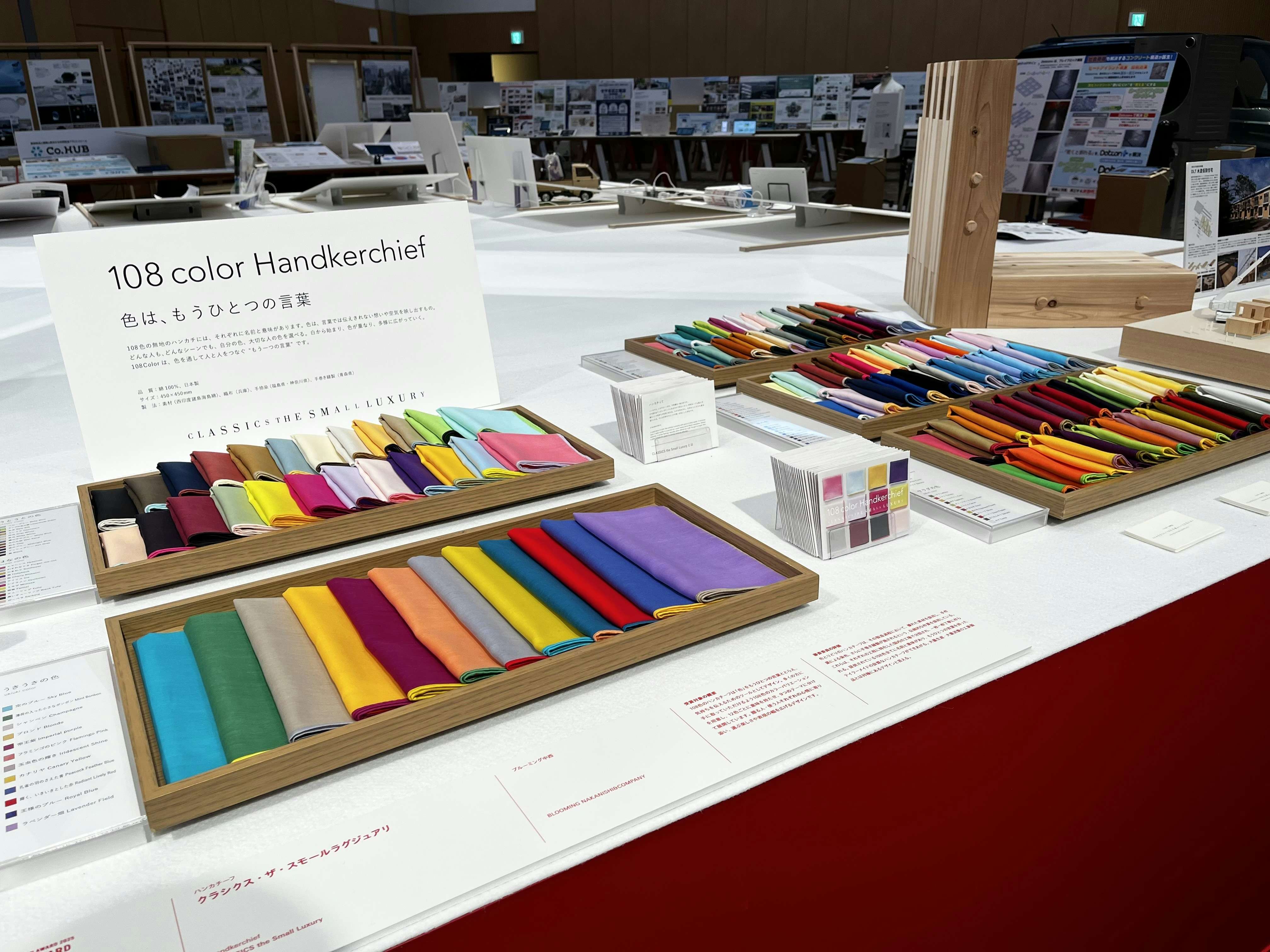 東京ミッドタウン地下1階ホールA 展示風景より、金賞を受賞したブルーミング中西株式会社によるハンカチーフ「クラシクス・ザ・スモールラグジュアリ」。色を言葉としてとらえた108色のハンカチは、気持ちを伝えるためのツールとしてデザインされている。贈る人と使う人のあいだに、従来の言葉に頼らない新たなコミュニケーションが生み出されることを意図している。品質の確かさはもちろんのこと、今年度のテーマならではの選出だと言える