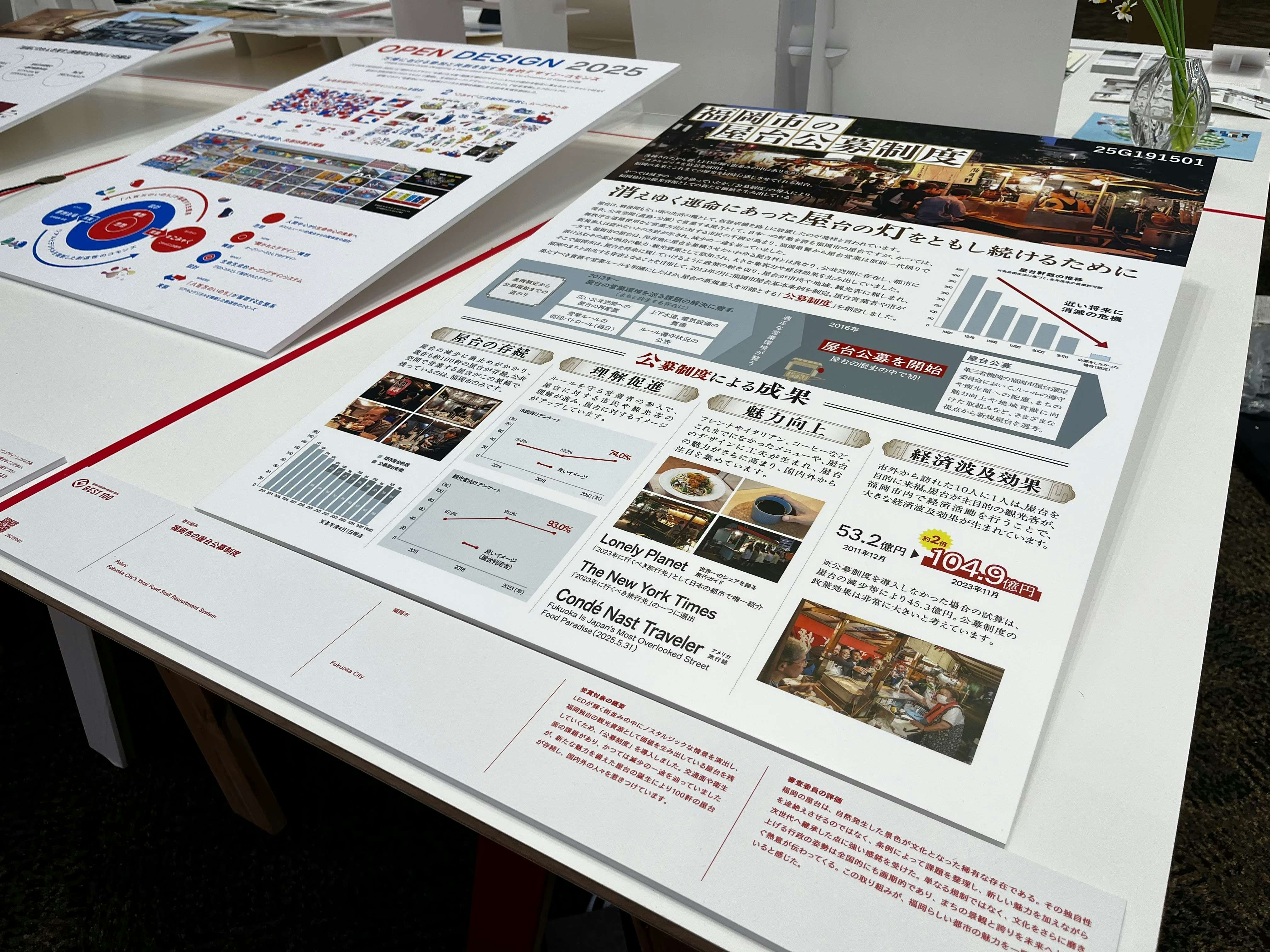 東京ミッドタウン地下1階ホールA 展示風景より、「福岡市の屋台公募制度」。福岡市ならではの観光資源である「屋台」の風景を守るため、福岡市が「公募制度」を導入した事例