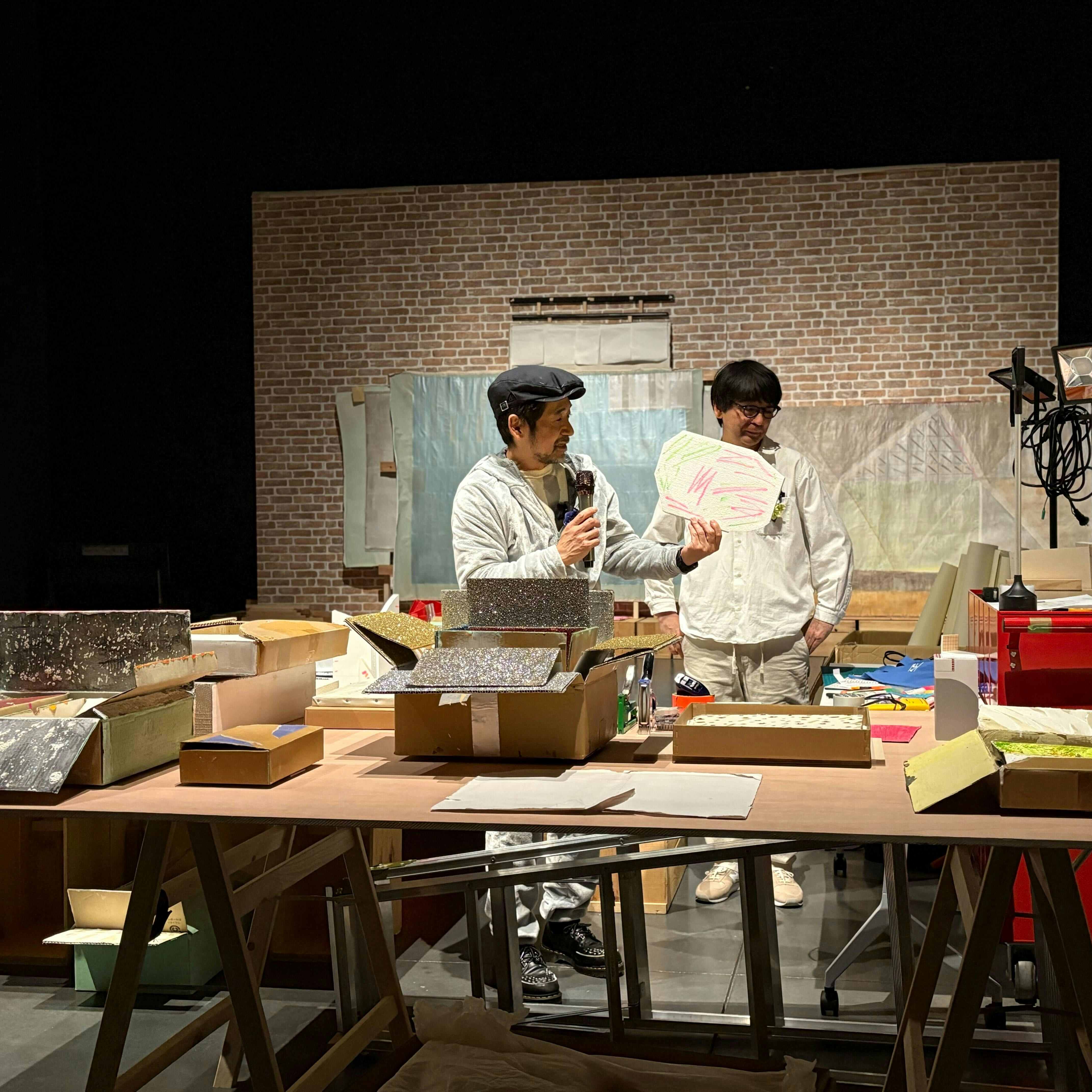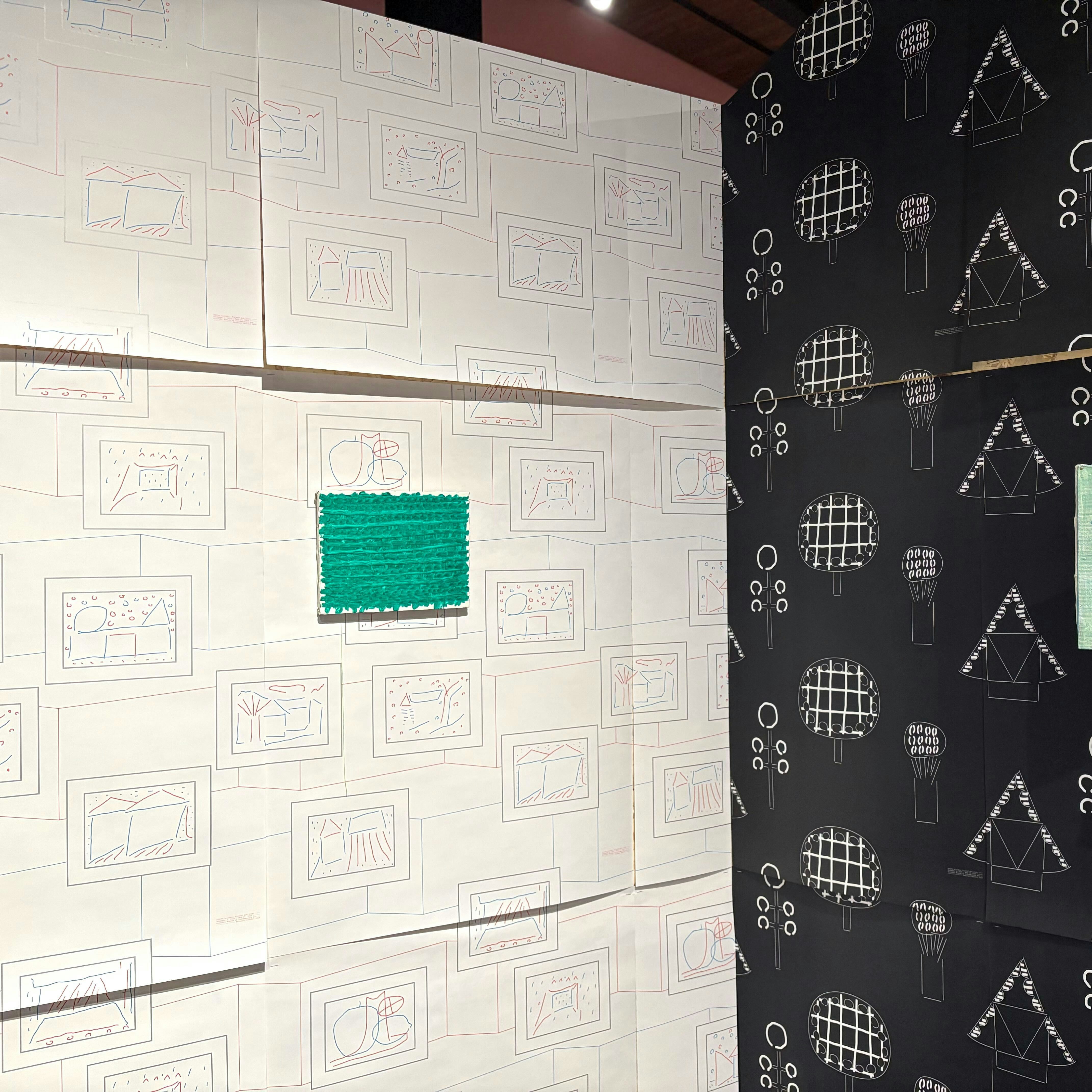 服部は、杉戸の作品によく登場するモチーフを用いて8種類の壁紙を制作した。杉戸の制作のインスピレーションのきっかけになるよう制作されたそれらは、実際、設営中の杉戸にたぶんに影響を与えた。約1週間の設営期間中に、壁紙が貼られた空間を発想源として新作が複数生み出された。2名のつくり手による即興的な応答の痕跡がそのまま空間に残されている。小屋の内外に展示される杉戸の作品と壁紙のデザインを見比べながら、その跡をたどってほしい。