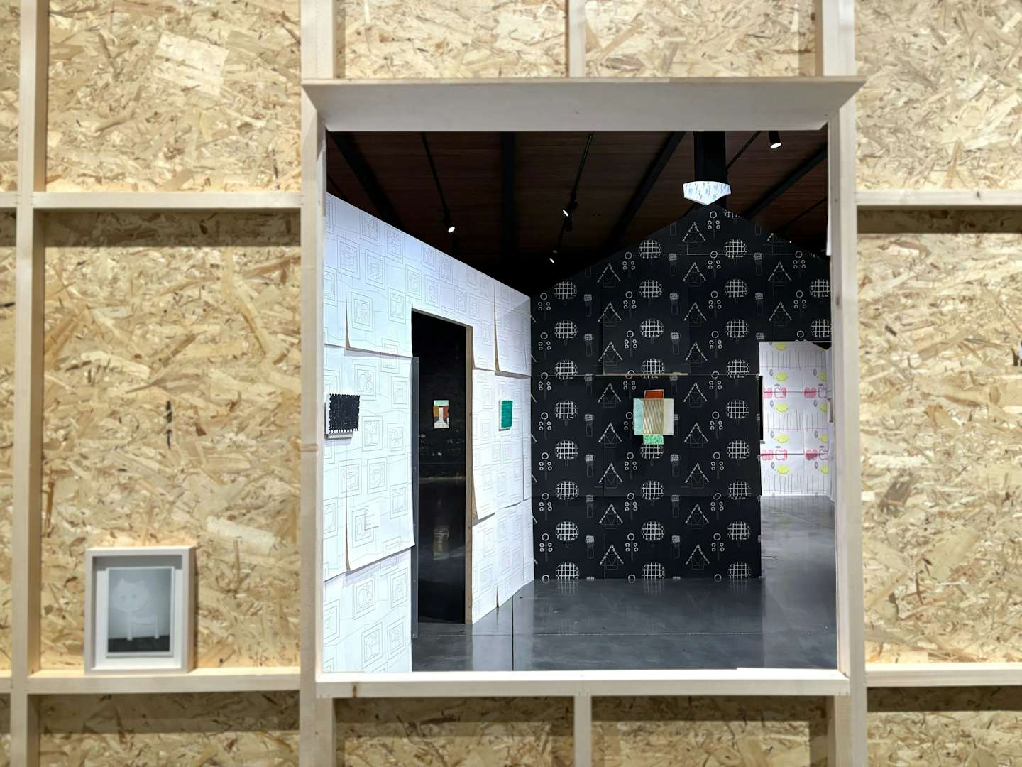 本展は明確な章立ては行われておらず、大きく2つにわかれた展示空間を広く使って展開されている。入ってすぐの空間中央には、ひとつの小屋が建っている。小屋の外側は木材そのままが見える状態だが、中に入るとカラフルな壁紙に覆われた空間が現れる。