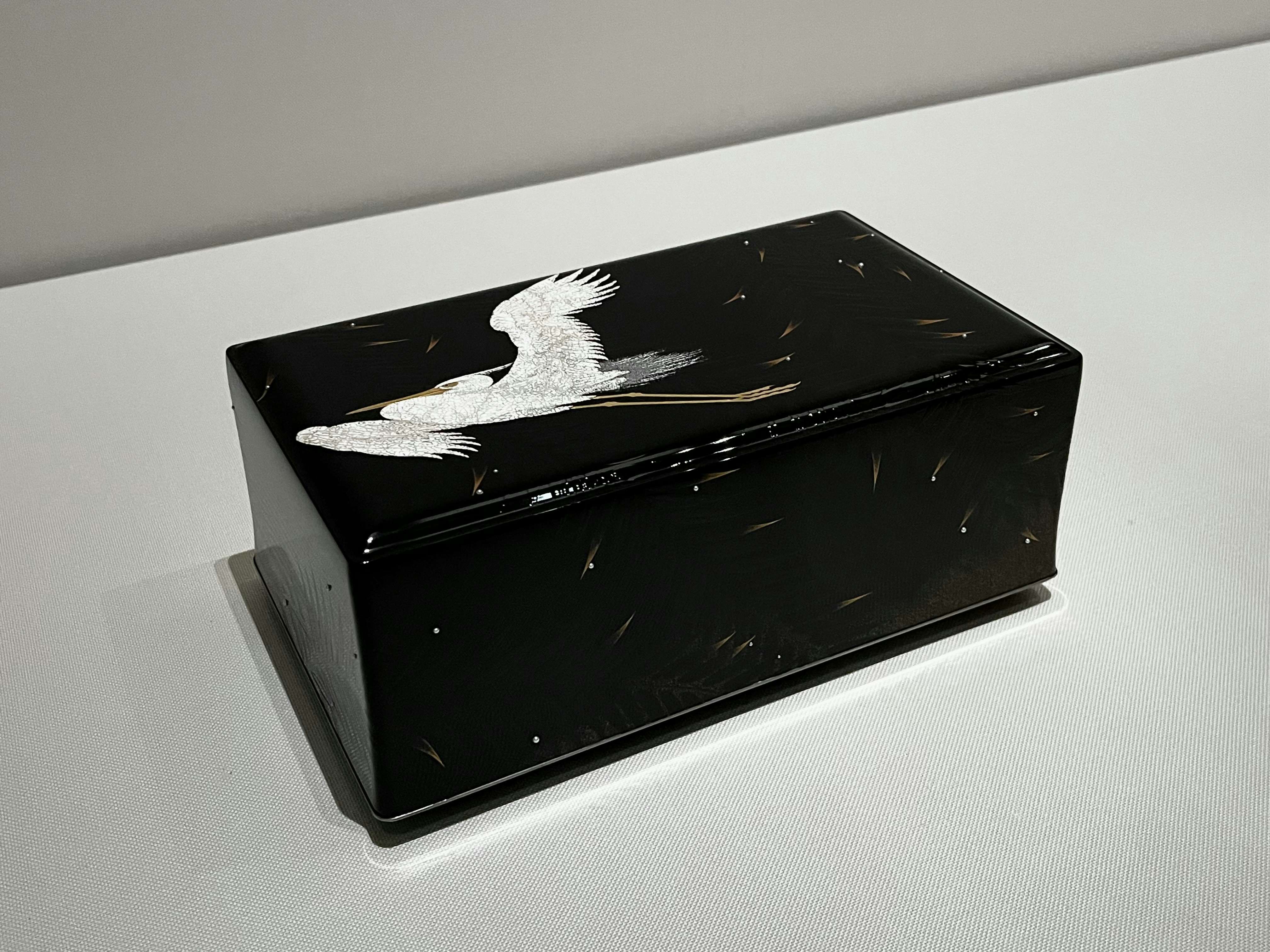 例えば「漆」のセクションでは、人間国宝・松田権六による《蒔絵鷺文飾箱》(1961)を展示。こっくりと深みのある黒漆に、卵殻で表された白鷺が浮かび上がる。白鷺の周囲には柳の葉が描かれ、その葉からは真珠の露が滴り落ちる瑞々しい意匠が魅力的な作品だ。