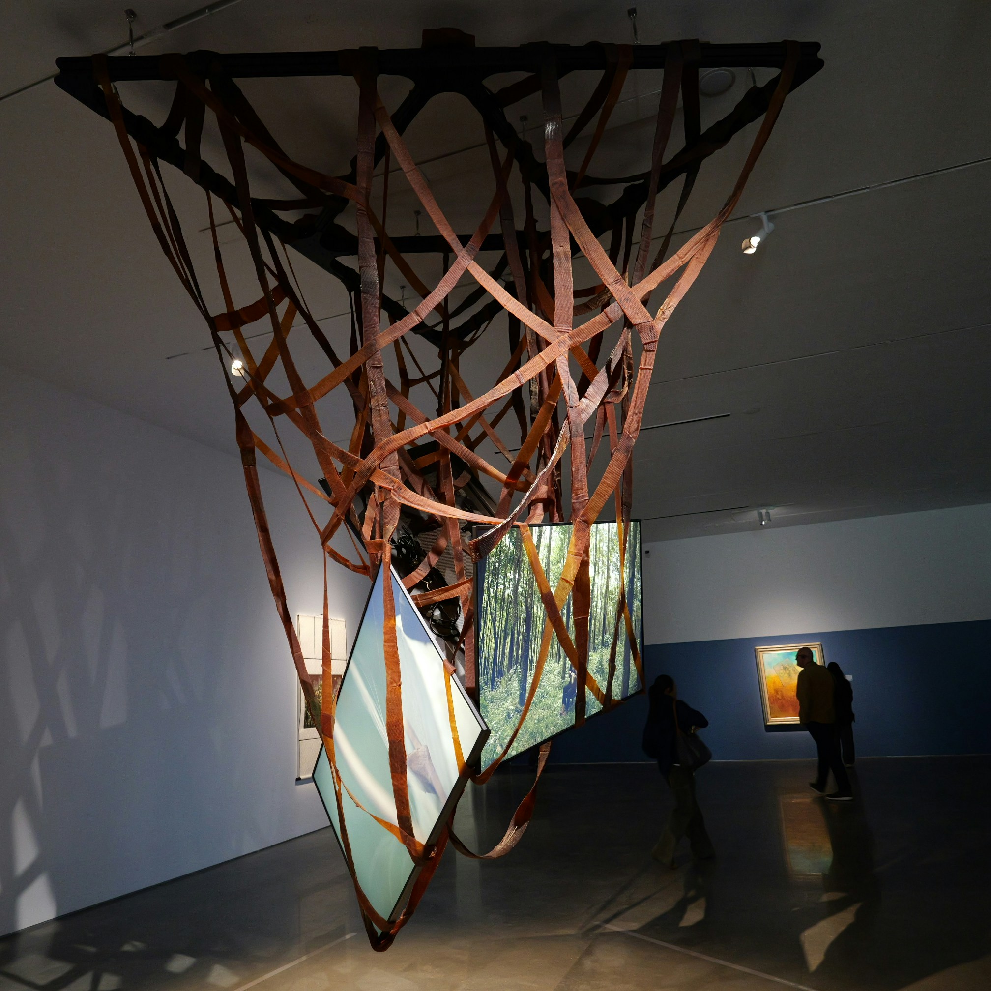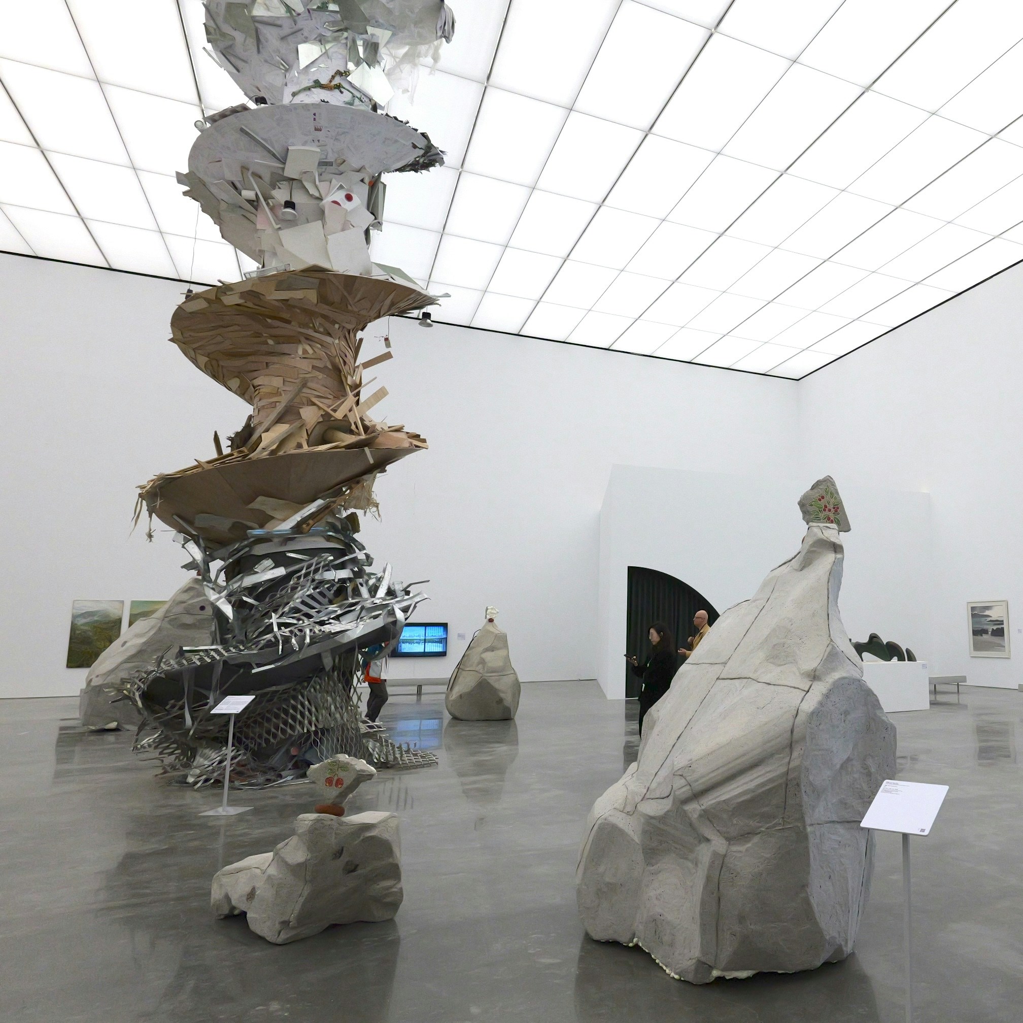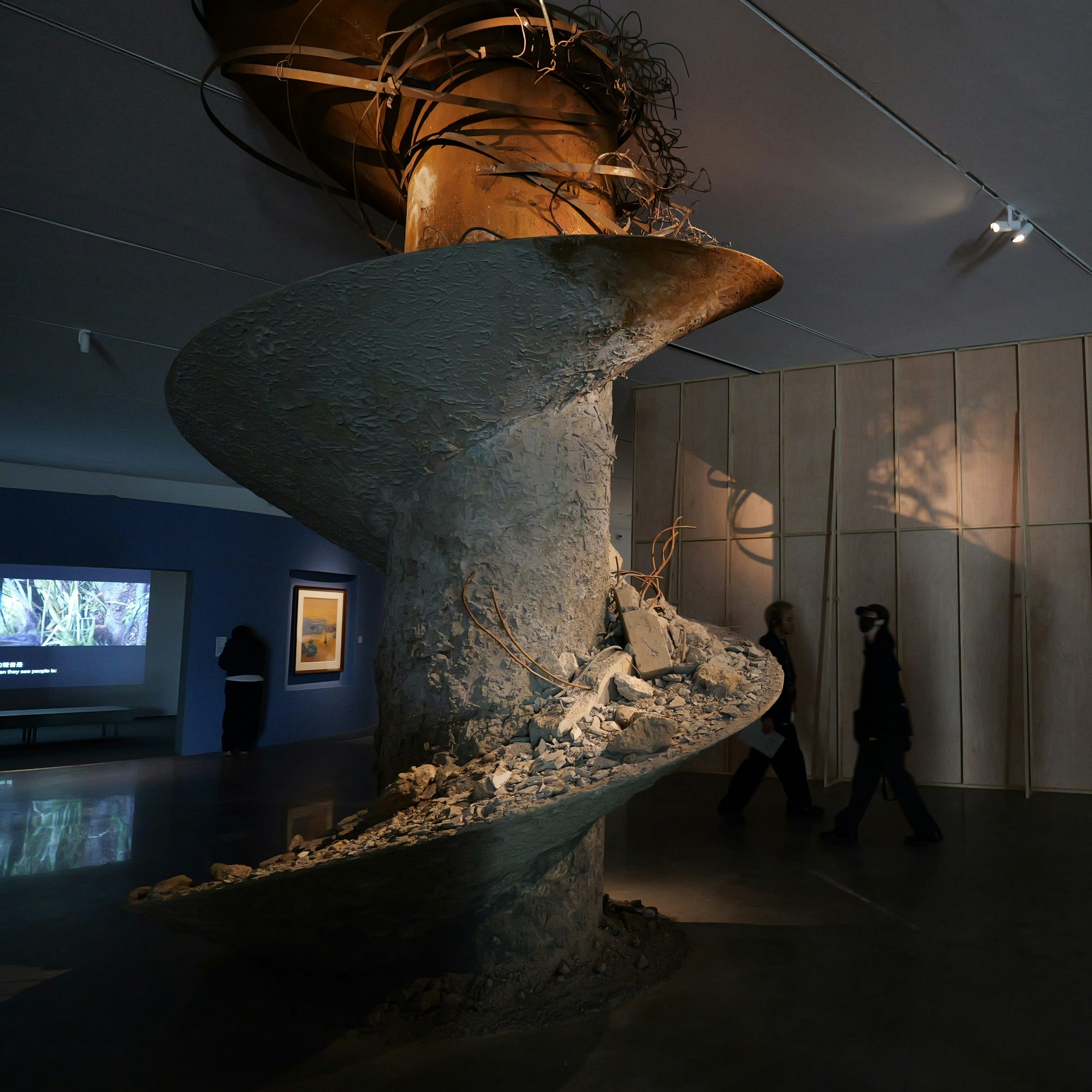 施設は高床構造となっており、1階のロビーは都市や公園とフラットにつながった、周囲の環境と調和した空間となっている。ここでは、コミッションとしてつくられた、土木建築家として経歴ももつアドリアン・ティルソの巨大な作品《Post-Museum Evidences(the Drill)》(2025)が来場者を迎える。水を湛えた皿状のオブジェクトから階上へと伸びるドリルのような本作は、1階部分だけでなく、その天井に突き刺さり、そのまま階上の2つの展示室を貫いている。その材料には美術館の建築で使用されたあらゆる素材が使われており、洗練されたSANAAの建築の内部に土地改良と建築という行為を生々しく露出させる。