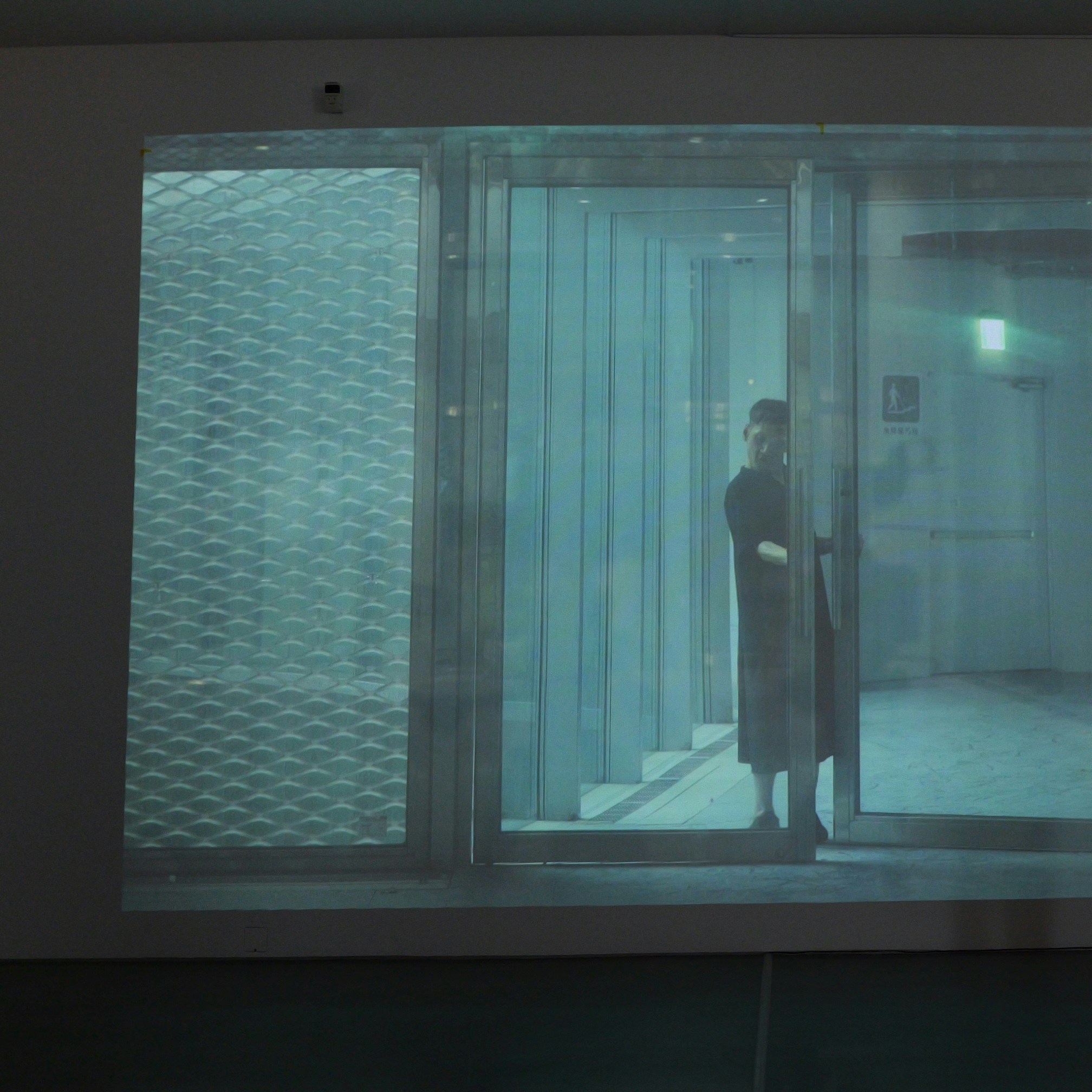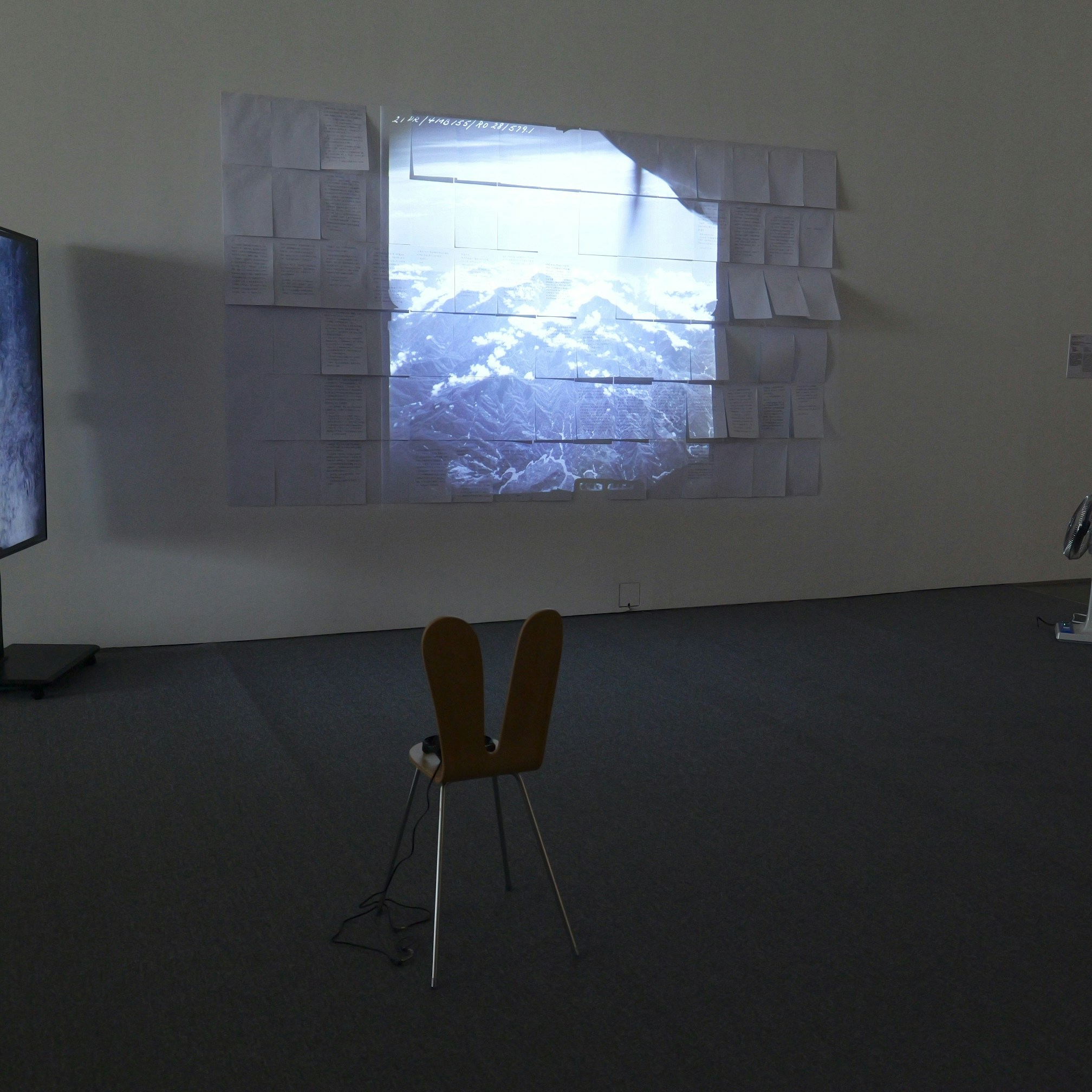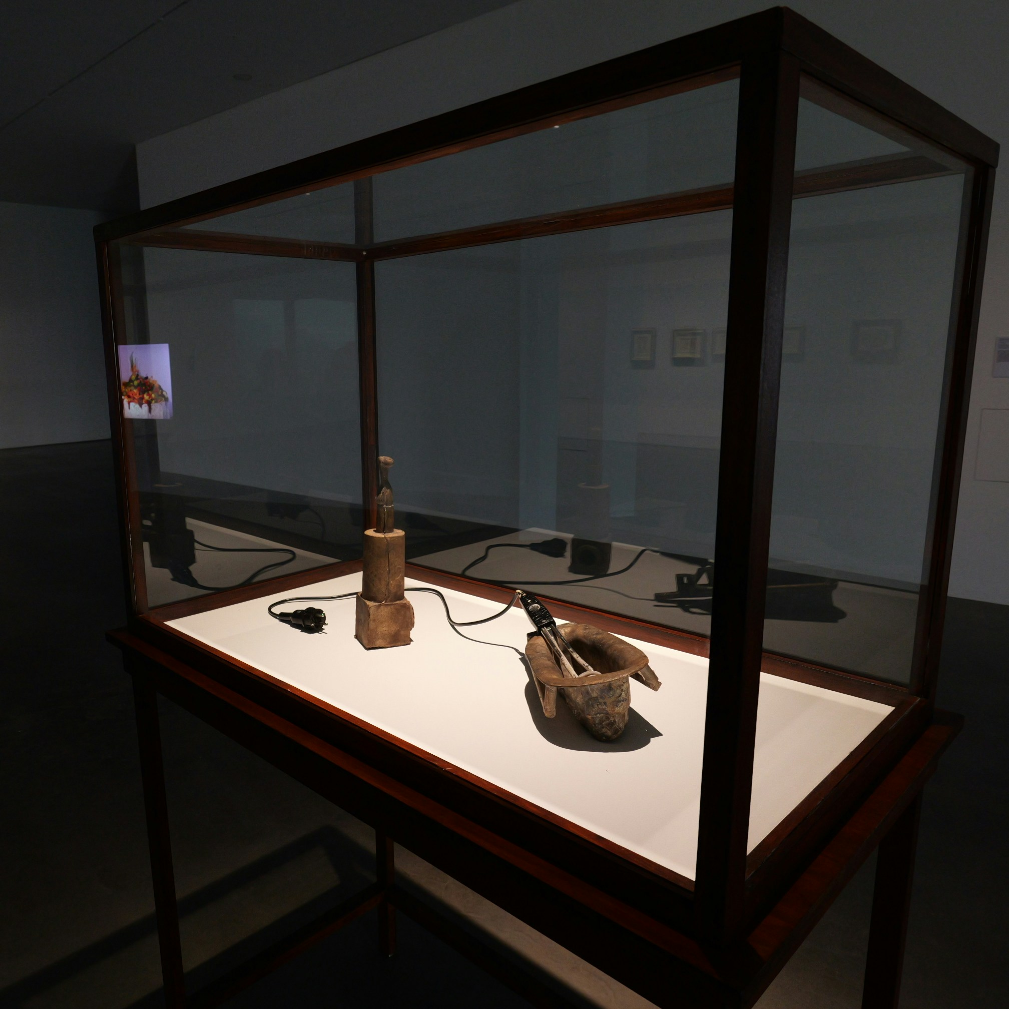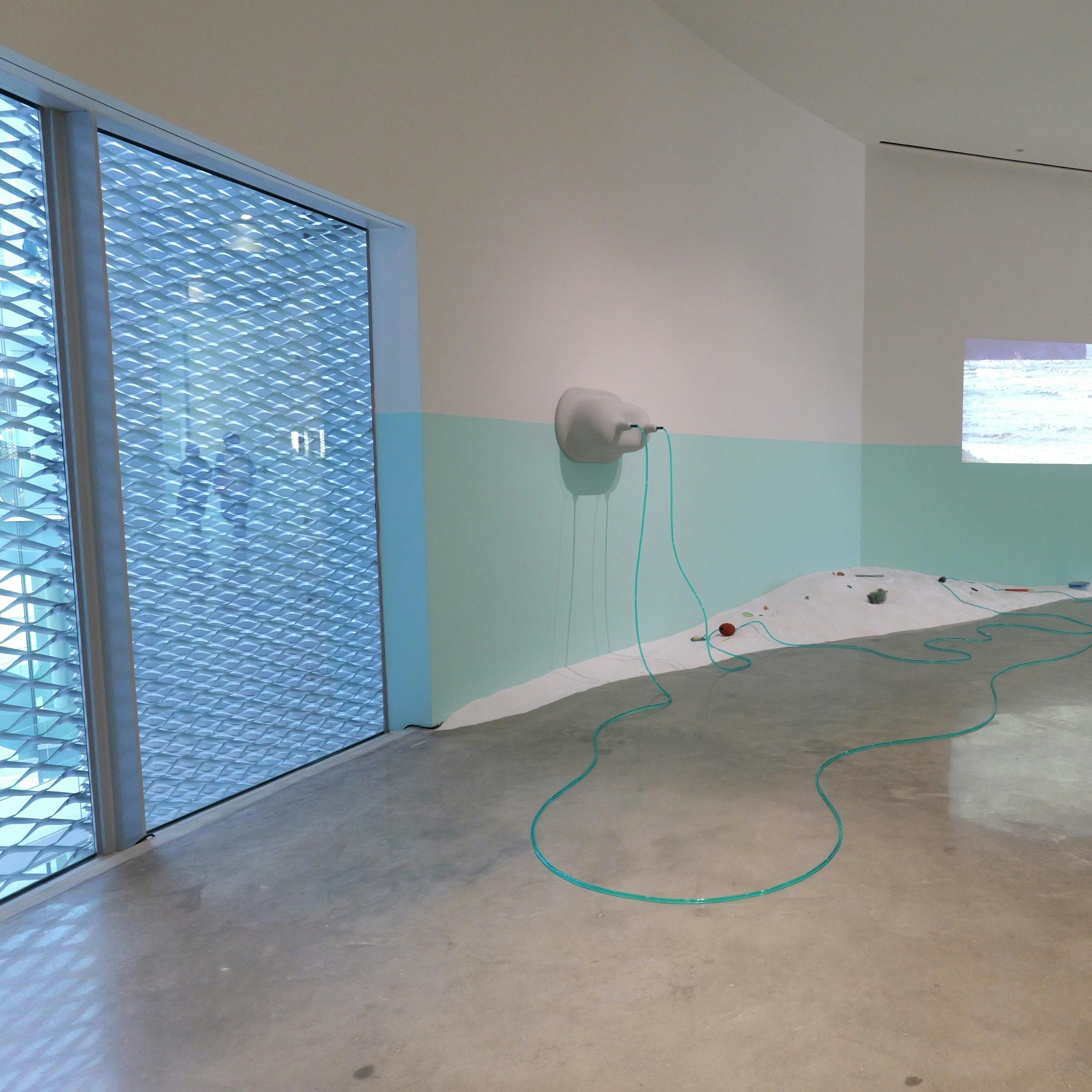 施設は高床構造となっており、1階のロビーは都市や公園とフラットにつながった、周囲の環境と調和した空間となっている。ここでは、コミッションとしてつくられた、土木建築家として経歴ももつアドリアン・ティルソの巨大な作品《Post-Museum Evidences(the Drill)》(2025)が来場者を迎える。水を湛えた皿状のオブジェクトから階上へと伸びるドリルのような本作は、1階部分だけでなく、その天井に突き刺さり、そのまま階上の2つの展示室を貫いている。その材料には美術館の建築で使用されたあらゆる素材が使われており、洗練されたSANAAの建築の内部に土地改良と建築という行為を生々しく露出させる。