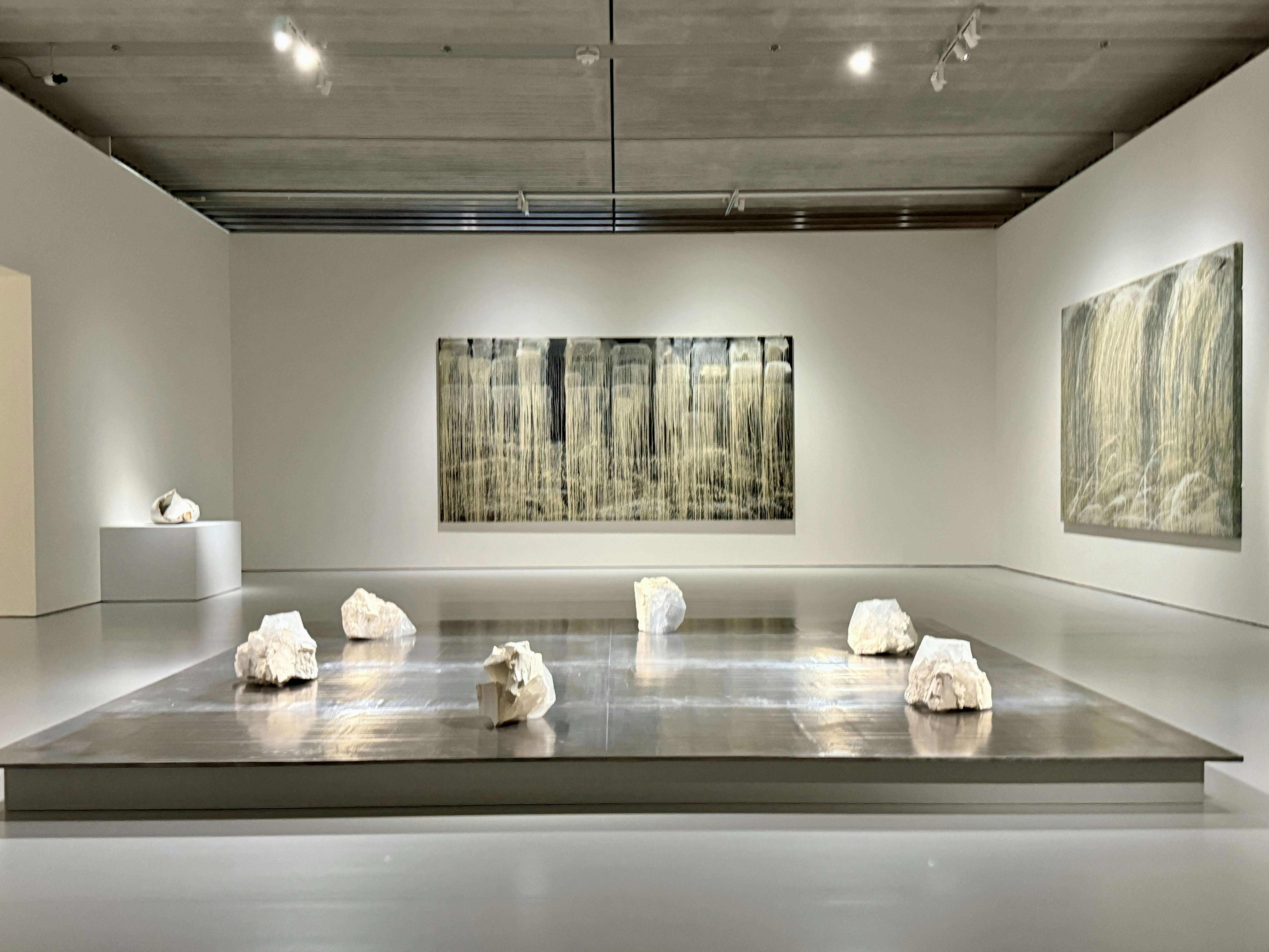 展示風景より、手前は小川待子《月のかけら 25 − P》(2025)。壁面の作品はパット・ステア《ウォーターフォール・オブ・エインシェント・ゴースツ》(1990)、《カルミング・ウォーターフォール》(1989)