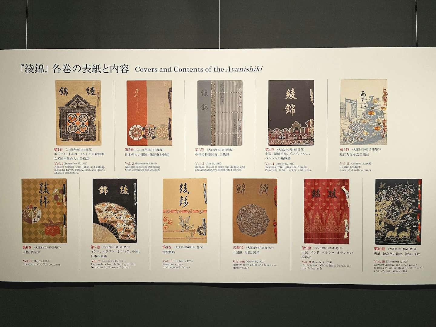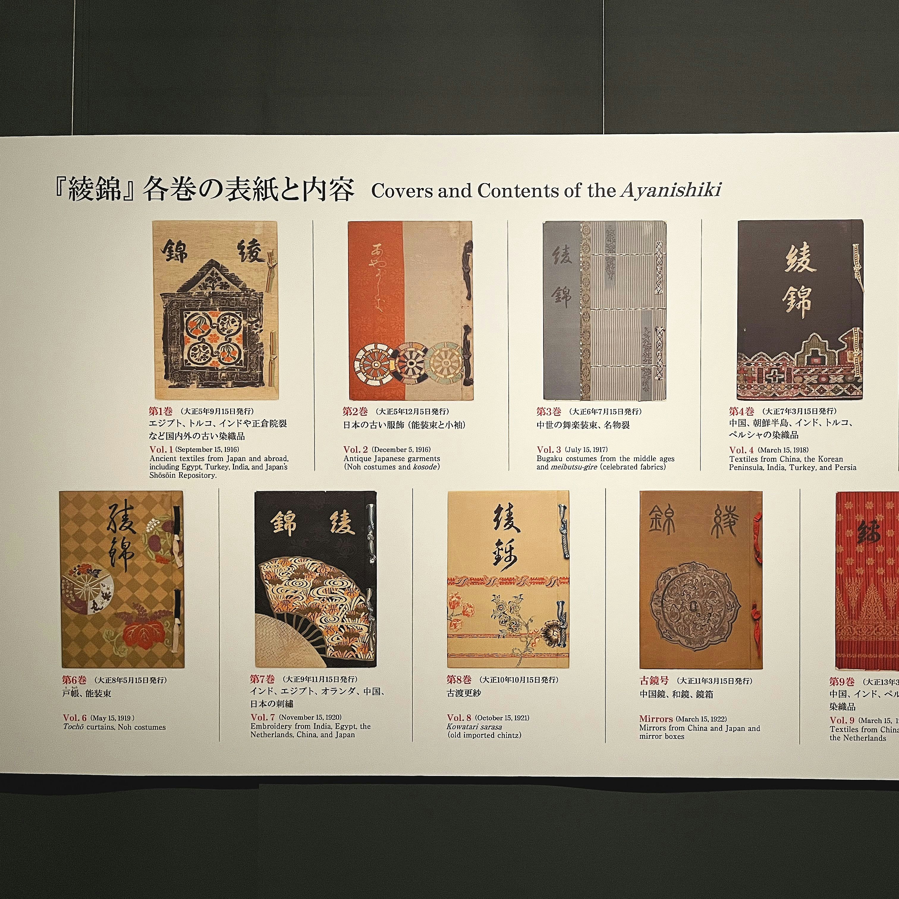 これらの貴重な染織品を記録として残したいと考えた主催者たちにより、とくに優れた作品を選定し、意匠を再現した染織図案集が企画される。それが、大正5年から14年をかけて全11冊(うち1冊は古鏡号)刊行された『綾錦(あやにしき)』だ。