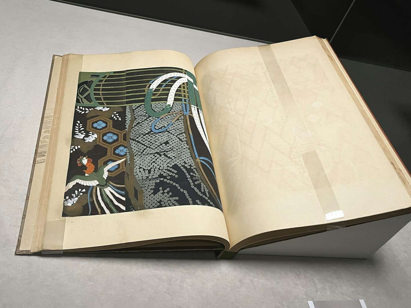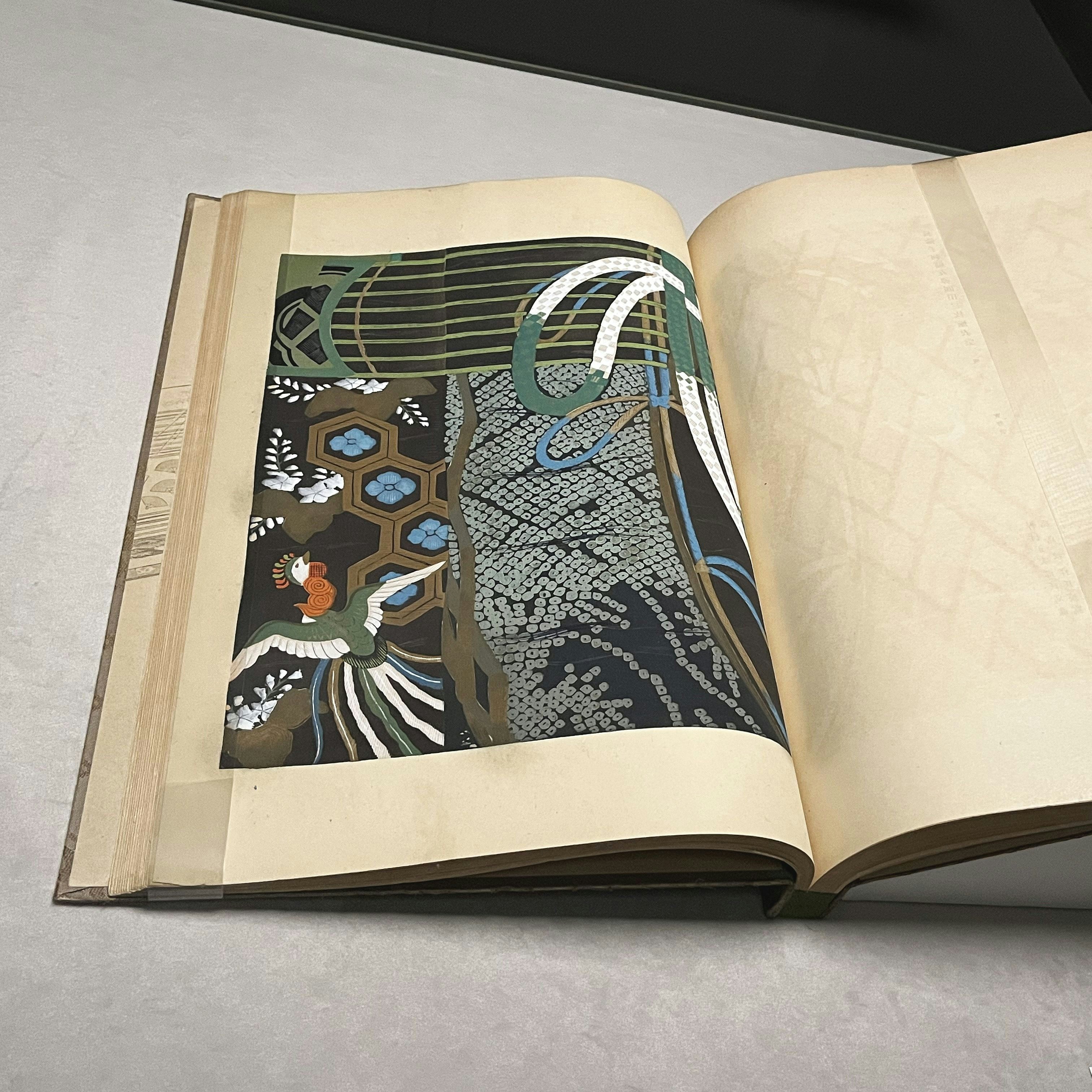 会場には、「能装束」「小袖」「古更紗裂」のジャンル別に、染織作品が『綾錦』に掲載される版画とともに並ぶ。鳥や吉祥のモティーフに高価な素材と高い技術を駆使した限りなく豪華な着物や、貴重な古更紗裂の美しさはもちろんだが、もうひとつの見どころが、この『綾錦』そのものだ。