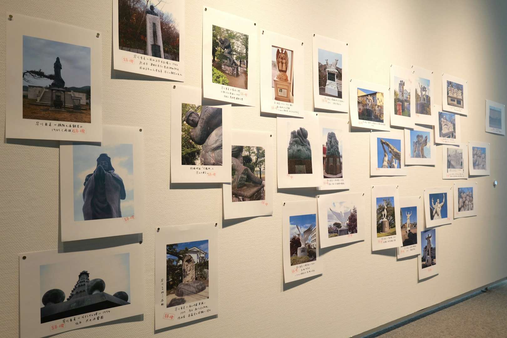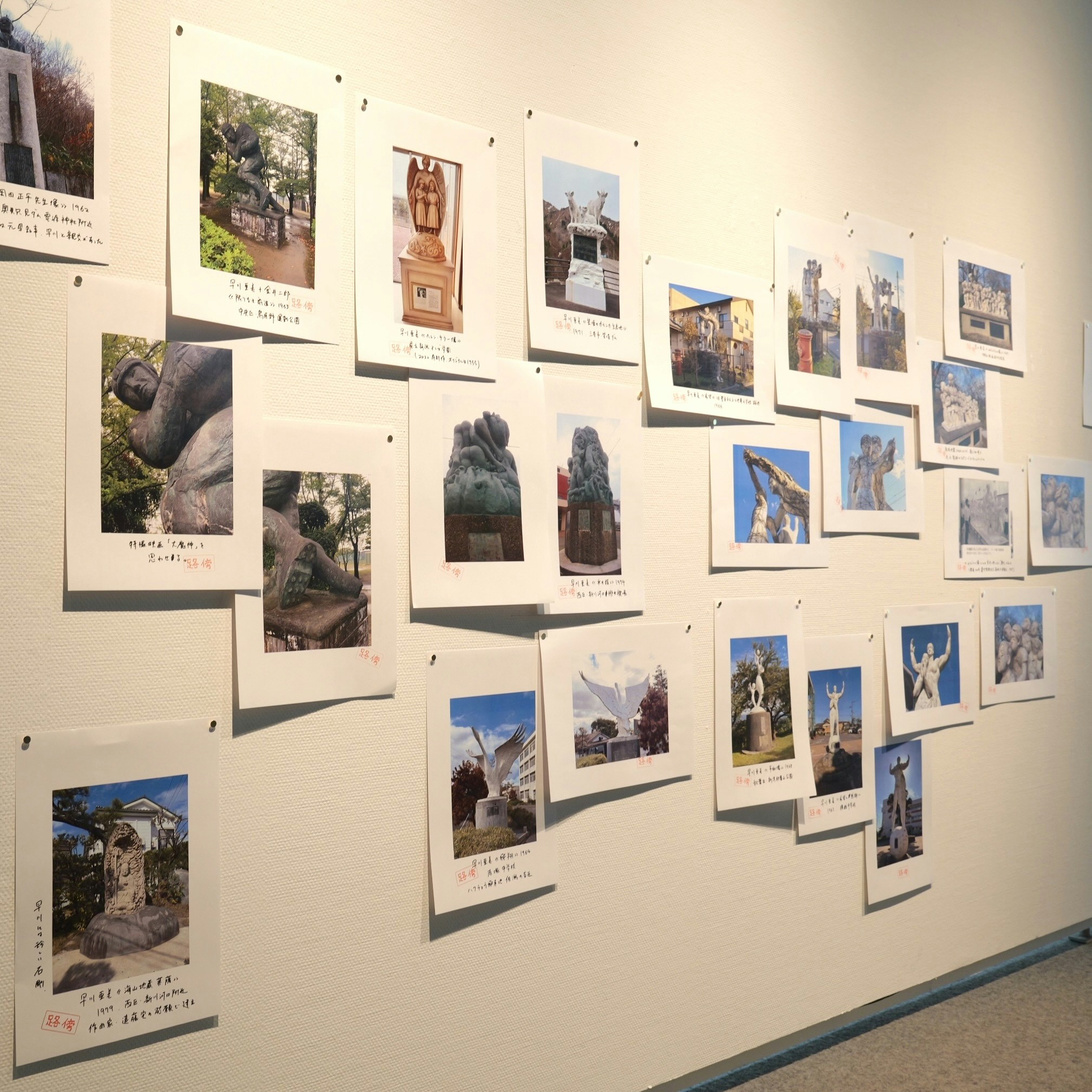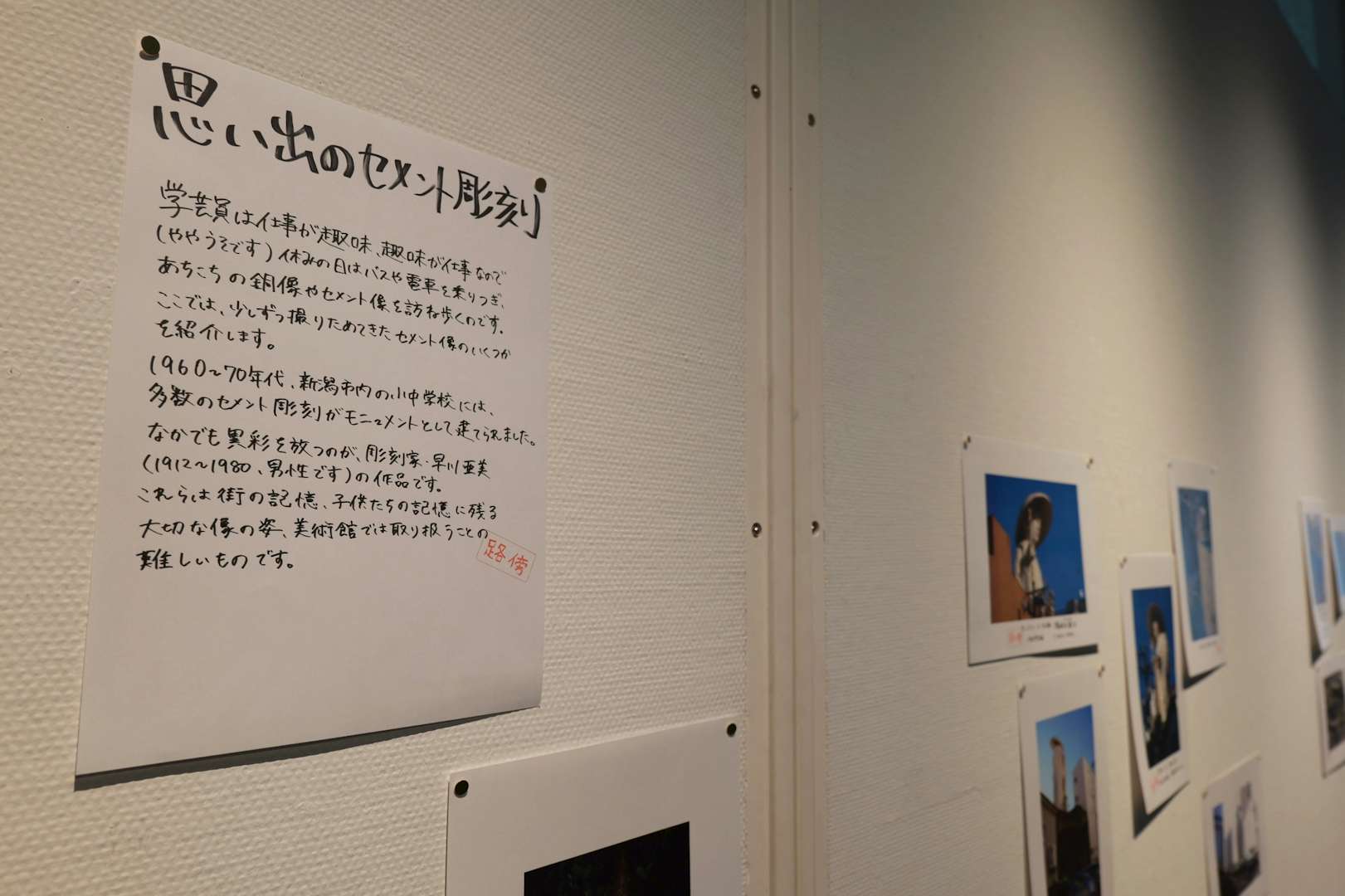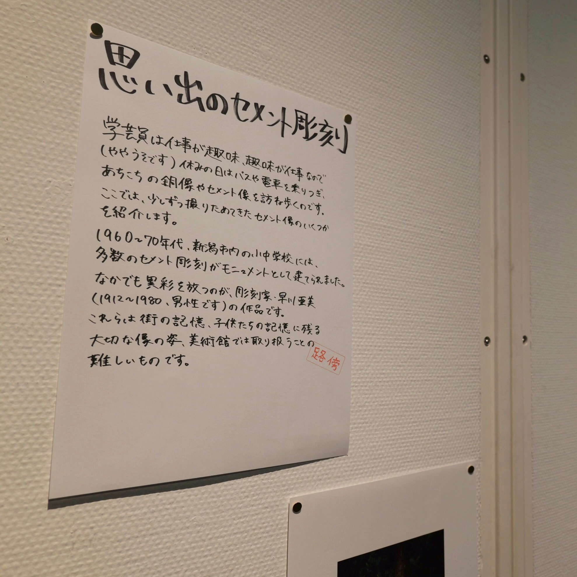 本展は学芸員の手書きによる解説文が様々なところに散りばめられている。いずれもA4の紙にサインペンで書かれており、「路傍」のスタンプが押され、画鋲でパネルに止められているのが特徴だ。その言葉は展示の解説をしつつも、どこか独り言のようでもあり、また考えの途上をメモしているようにも感じられ、本展が構成された思考の流れを追いかけることができるようになっている。